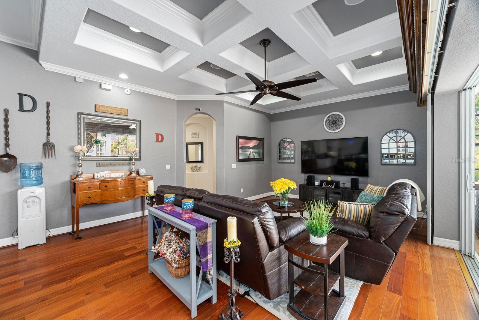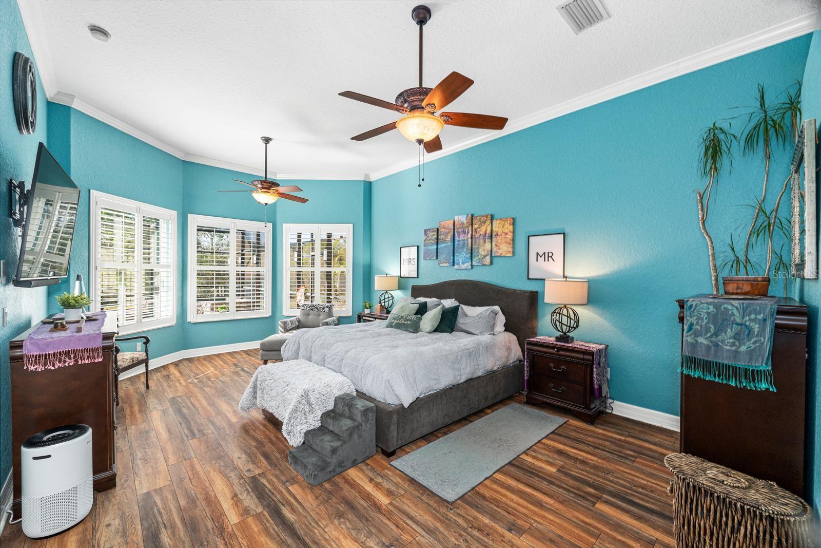 Ceiling Fans(s), Crown Molding, Eat-in Kitchen, High Ceilings, Kitchen/Family Room Combo, Primary Bedroom Main Floor, Solid Wood Cabinets, Split Bedroom, Stone Counters, Thermostat, Tray Ceiling(s), Walk-In Closet(s), Window Treatments
