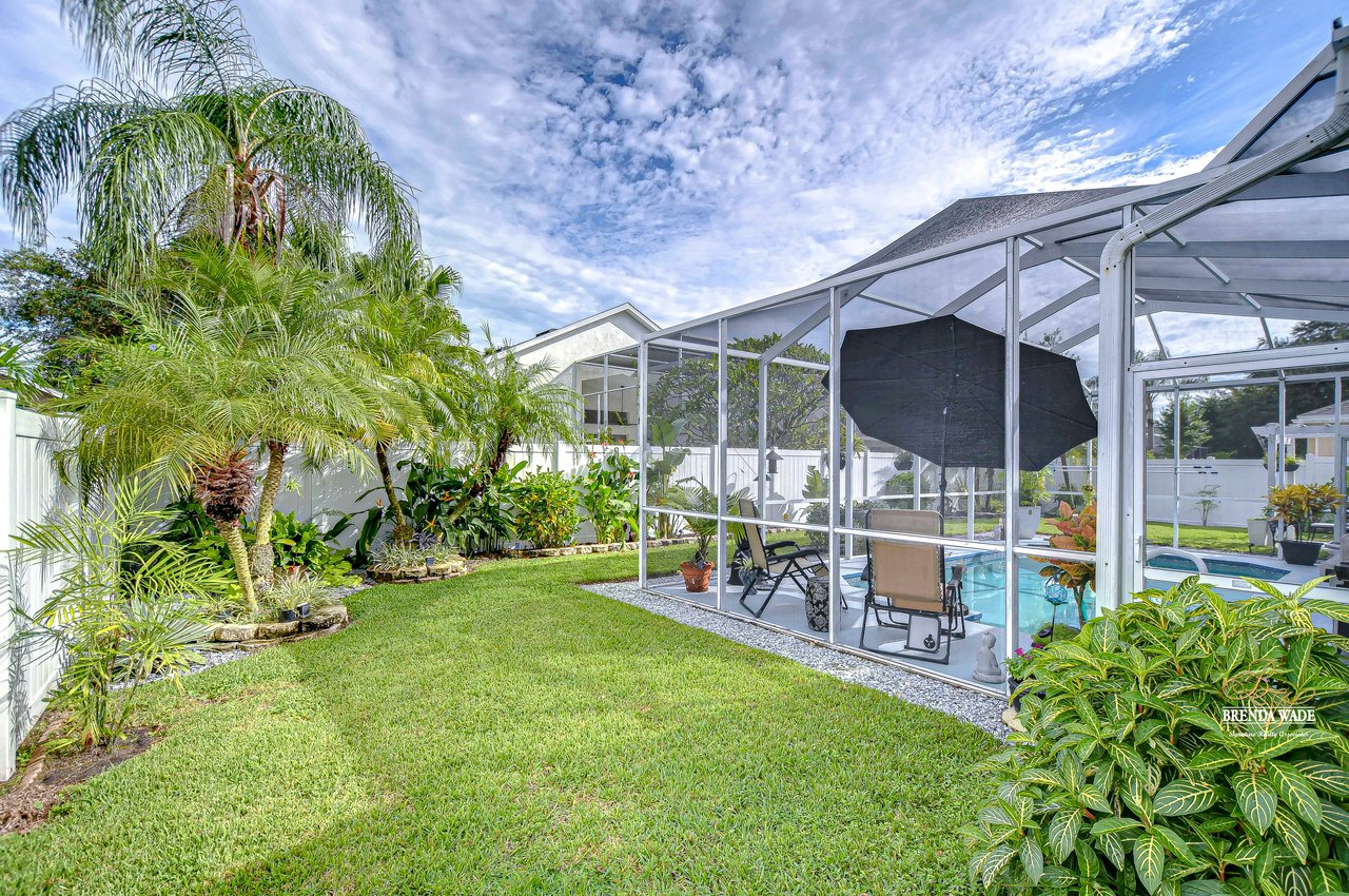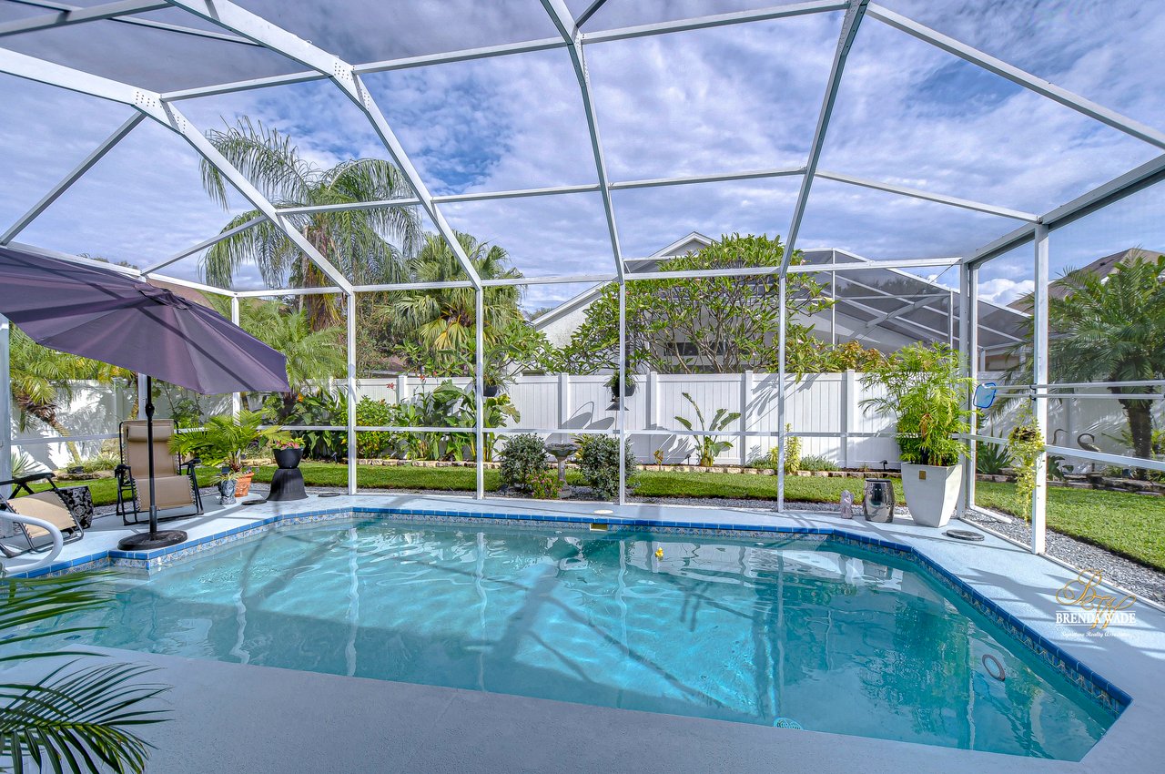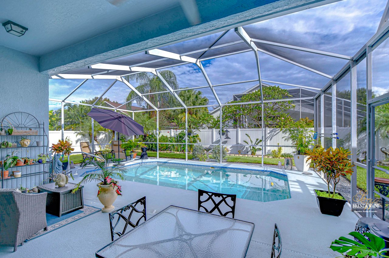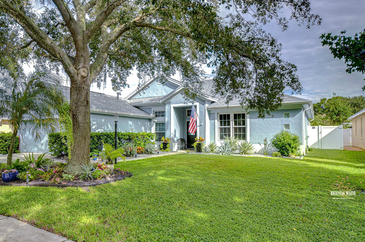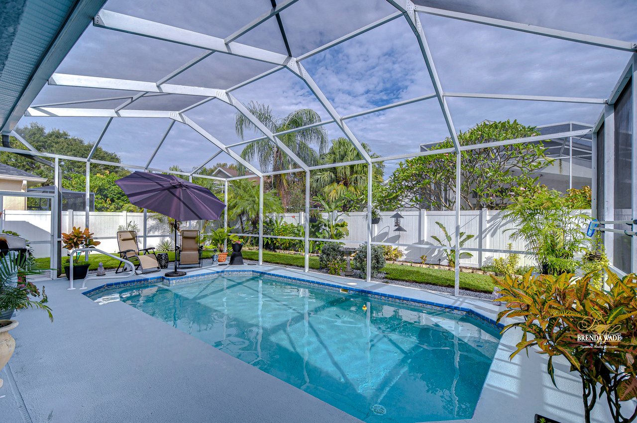 Start packing your bags! Nestled among towering oaks and lush tropical foliage, this beautifully upgraded three-bedroom plus den pool home is a serene retreat just waiting to welcome you home! Enjoy peace of mind with numerous recent upgrades: a new roof installed in 2020, updated floors in 2023, updated gutter drains and leaf guards added in 2024, interior and exterior light fixtures replaced in 2023, pool solar heating added in 2023, and a water heater and air conditioner that are both under five years old. Upon entering, you'll be welcomed by an expansive open living area featuring a formal dining room and great room, seamlessly flowing into the kitchen and breakfast nook--all offering stunning views of the backyard paradise. The kitchen is a chef's dream, with granite countertops, stainless steel appliances, a 5-burner gas range, and double-layered plant shelves to showcase your personal touch. A custom-painted accent wall adds a stylish and unique element to the great room. The primary suite offers private access to the lanai, a spacious walk-in closet, and a luxurious bathroom with granite countertops, dual sinks, a garden tub, and a separate shower. The two secondary bedrooms are generously sized, each featuring a walk-in closet. Between them, you'll find the perfect nook for a desk or bookshelves, adding versatile charm to the layout. Outside, prepare to fall in love with your personal paradise. The oversized, freshly painted screened lanai and surrounding deck are perfect for entertaining, leading to a beautifully landscaped, irrigated yard. You'll love the saltwater, solar-heated pool, surrounded by lush tropical landscaping, offering a private retreat within a new vinyl-fenced yard. Located in the desirable Lake St. Charles community, this home offers access to jogging trails, a community pool, playgrounds, tennis courts, ball fields, and more. Conveniently close to I-75 and the Crosstown Expressway, it allows for easy commutes to Tampa and MacDill AFB. Move-in ready and packed with upgrades, this gorgeous home is just waiting for you to make it your own!