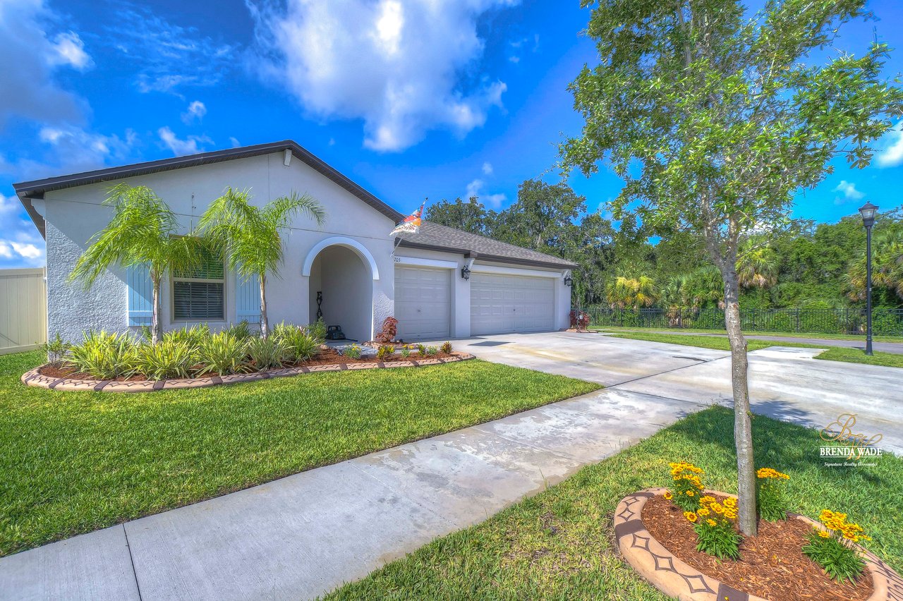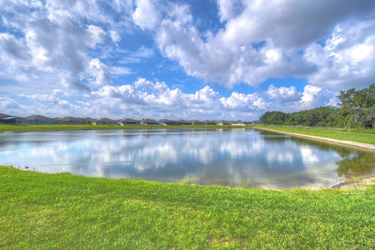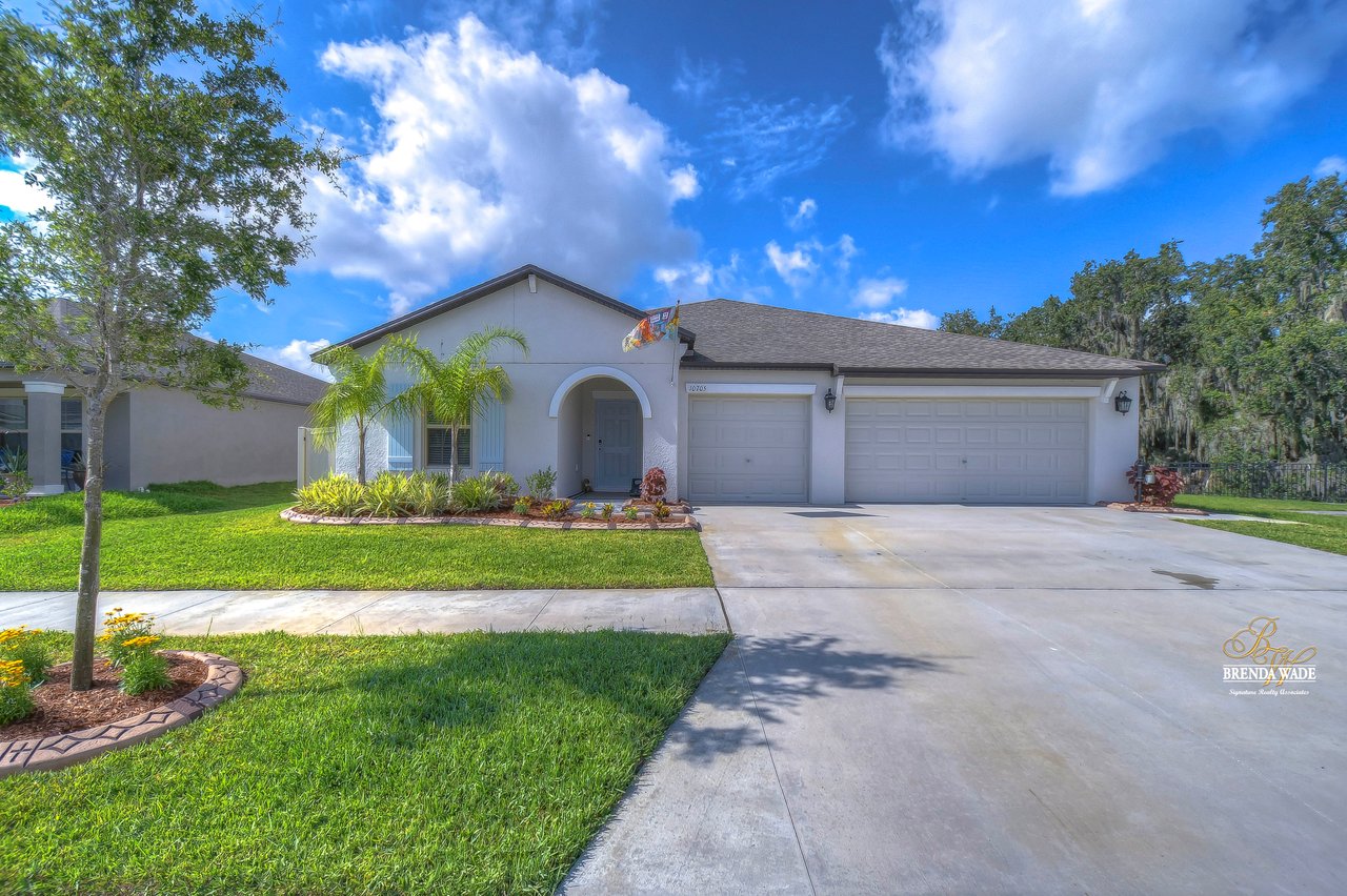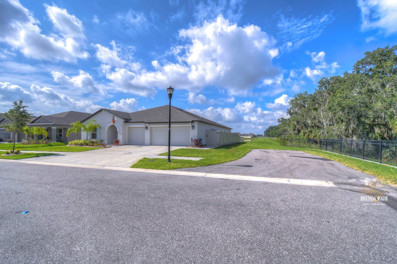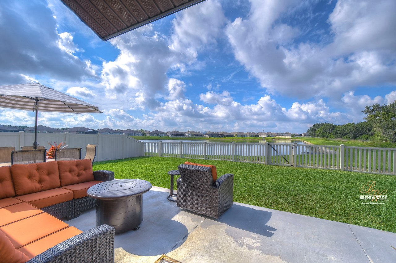 Welcome to your dream home! Prepare to be captivated by the open-concept design of this exquisite one-story newly built Santa Fe home! Thoughtfully situated on the last lot of a dead-end street surrounded by conservation and breathtaking water views! Nothing says welcome home like this warm and inviting triple split floor plan! The beautiful kitchen, a focal point overlooking the main living areas, is a culinary delight! Boasting an over-sized island and huge walk-in pantry, built-in stainless appliances, granite countertops, and espresso cabinets! Conversations flow seamlessly between the well-appointed kitchen and the adjacent formal dining room with slider that opens to the oversized patio! The dining room not only offers panoramic water views but also welcomes an abundance of natural light! The great room is the perfect place to enjoy spending time with family and friends! A flex room adjacent to the great room presents endless possibilities, perfect for an office, playroom, or gym! The primary suite is a true oasis boasting water views and natural light throughout with en-suite bath! The en-suite features double sinks, granite countertops, walk-in shower, and large walk-in closet! Two additional spacious bedrooms at the front of the home feature large closets and share a bath! The fourth bedroom showcases a walk-in closet and private en-suite bath, ensuring privacy and comfort for guests or family members! Prepare to be captivated once again as you step into the backyard, a true masterpiece that showcases captivating water views and conservation! Take a minute to take it all in while sitting around the firepit! With neighbors on one side only and a privacy fence, this is the perfect place for gatherings! Do you enjoy going to the beaches? This is the perfect house for you, less than 20 minutes from Apollo Beach and only one hour from Disney, this house is sure to check all the boxes! Start packing your bags!