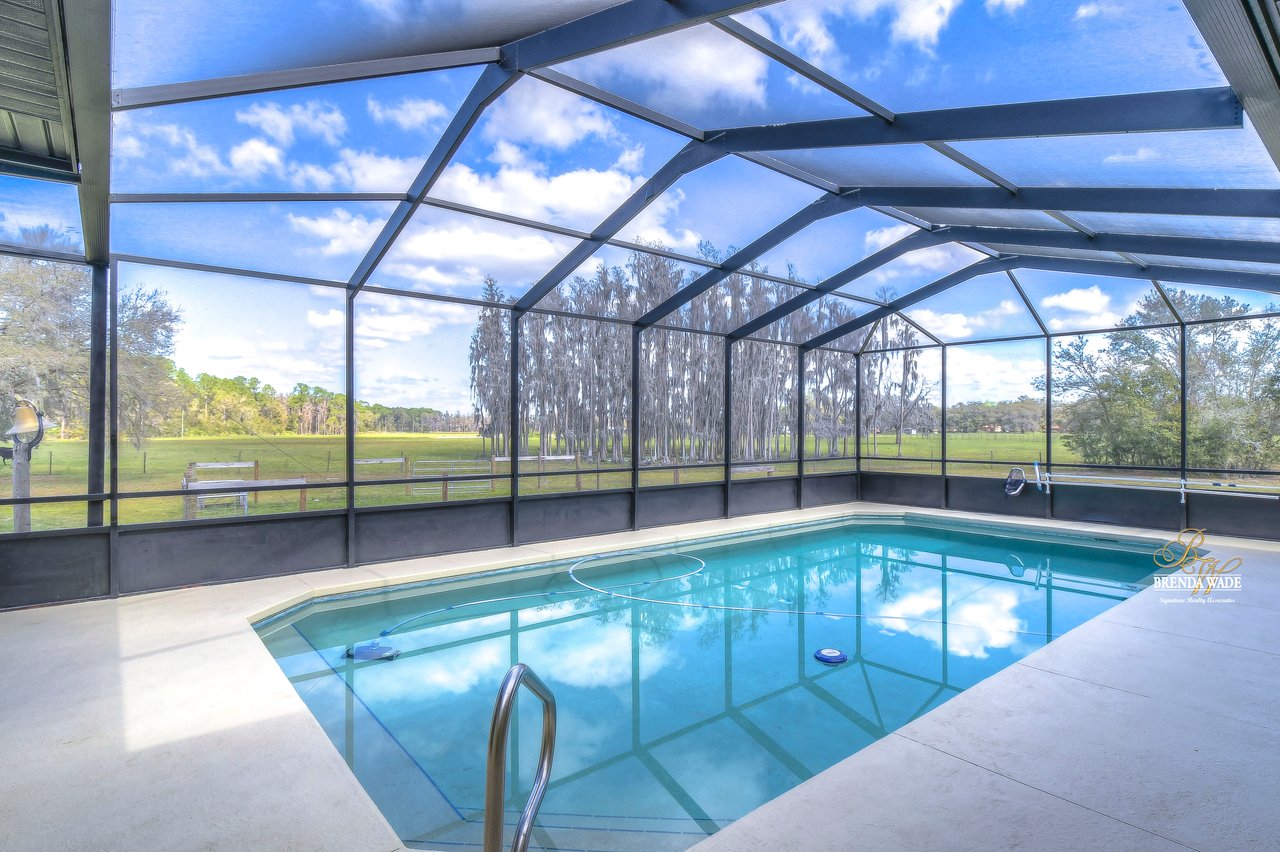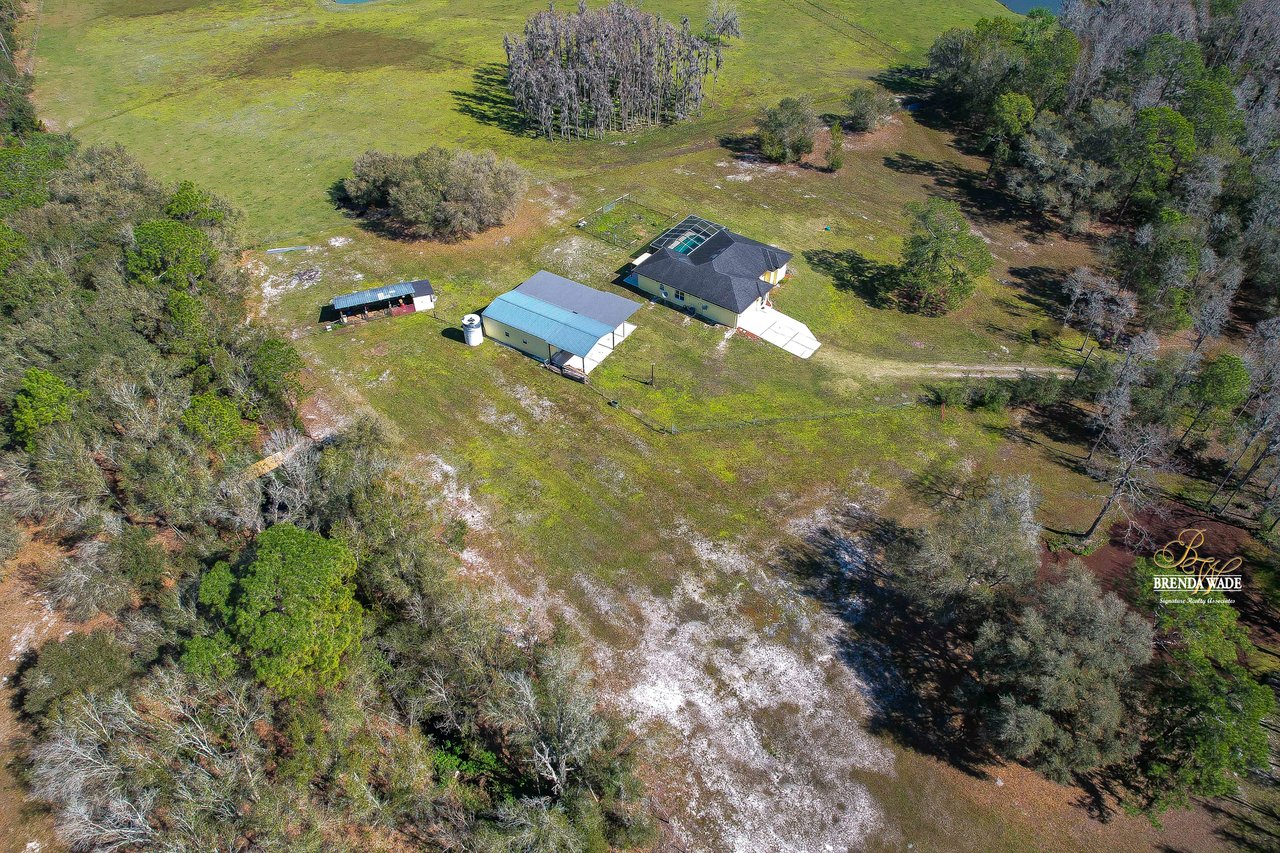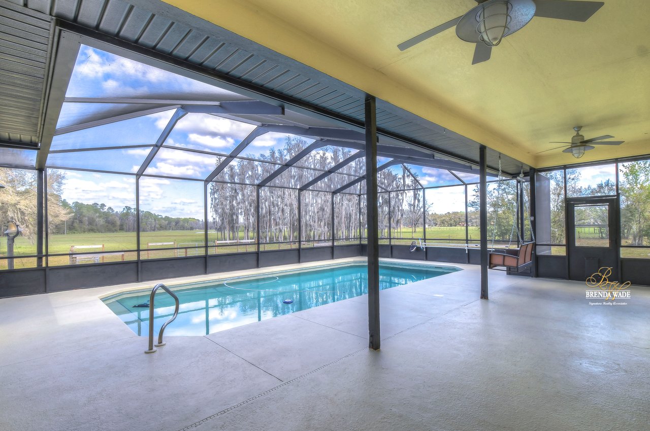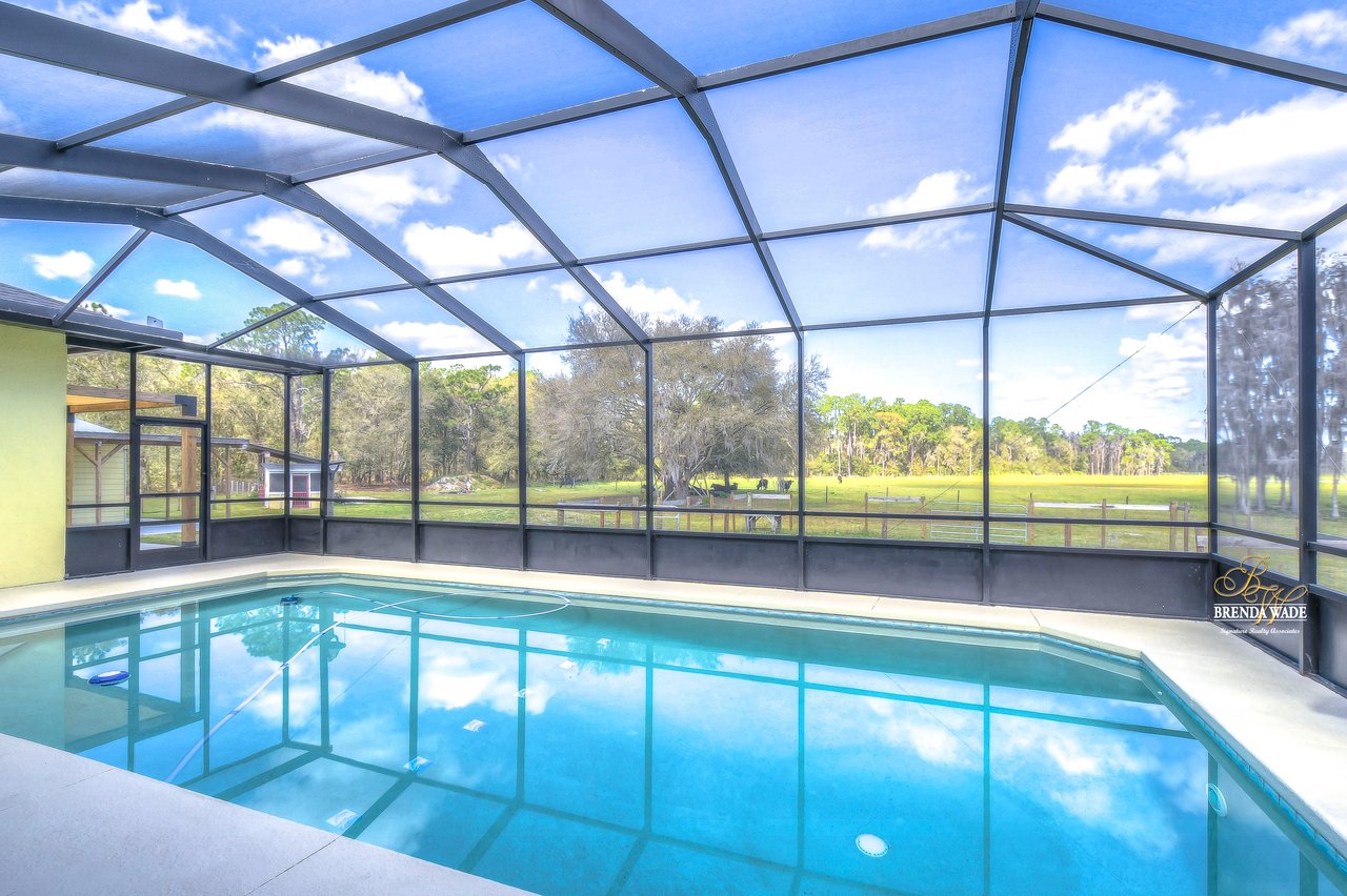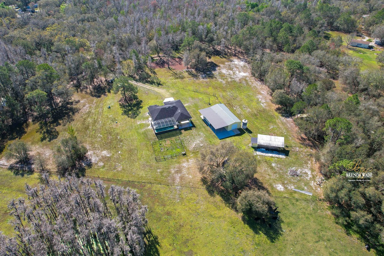 This is what you've been searching for! If you're looking for a tranquil and serene home nestled among nature's beauty, you've found it! This peaceful farmhouse is surrounded by greenery, tucked back from the traffic! The home itself boasts a cozy and inviting atmosphere, perfect for relaxing after a long day. With ample natural light streaming in from the large windows, you'll feel at one with the outdoors without ever leaving the comfort of your home. Inside awaits high ceilings, new tile flooring in 2021, and fresh neutral paint ready to pair perfectly with your decor! The chef's kitchen boasts stainless appliances, 42-in cherry cabinets topped with crown, soft close drawers, breakfast bar seating, and closet pantry! The great room allows for plenty of space to gather as a family or have guests over to entertain! This home offers TWO primary suites both with large walk-in closets! The main primary suite features an updated bathroom with two sinks, garden tub, and walk-in shower with a frameless shower door on the way! The second primary has a large garden tub/shower combo while both primary bedrooms have a private slider that takes you to the pool! Step outside onto the spacious screened lanai and pool and take in the breathtaking views of the natural surroundings. You'll feel as though you've been transported to a private oasis, where you can unwind and recharge in complete peace and quiet! The pool lanai was refinished and rescreened in 2022! Don't forget to check out the 24'x50' workshop barn! You can appreciate the epoxied floors and 100 amp service along with multiple outlets wired for 220v. There is also an attached 24'x80' concrete pad equipped to store your boats, RV's, trailers, and farm equipment with the two 30 amp RV hookups with water! There is also a 3-stall pole barn and custom chicken coop! There is a newer bridge that crosses the creek and allows you to walk the whole property! This property truly offers the best of both worlds, with the convenience of city living just a short drive away and the tranquility of nature right at your doorstep. Don't miss your chance to call this peaceful haven your own!