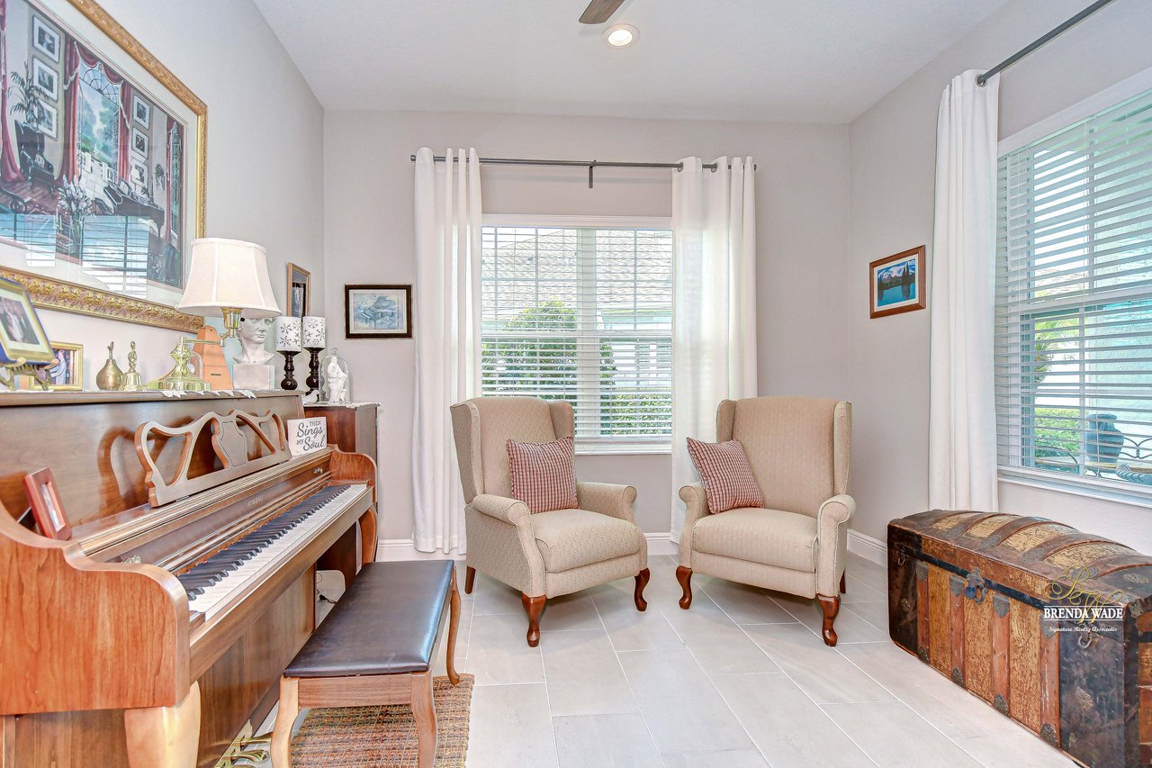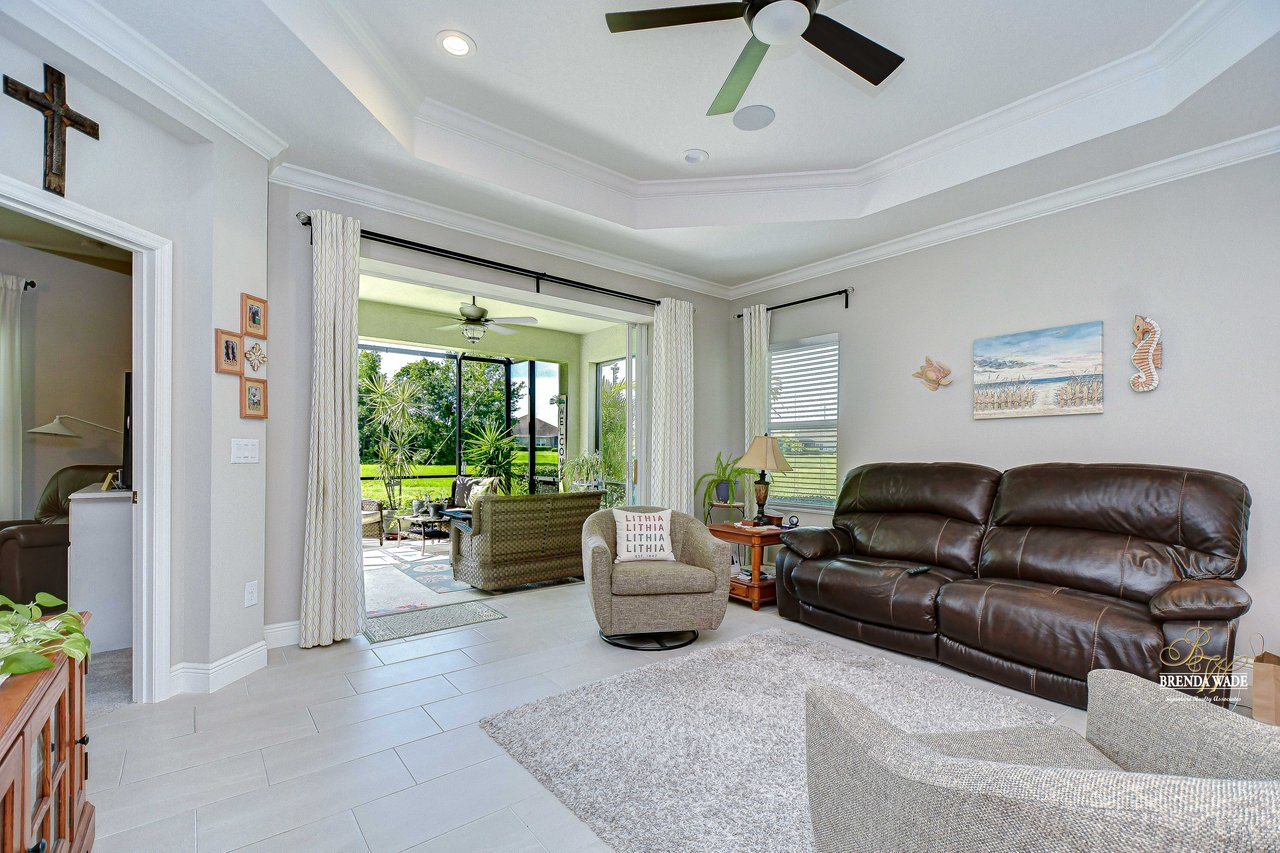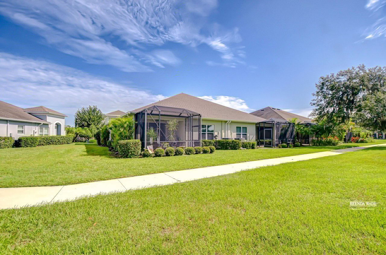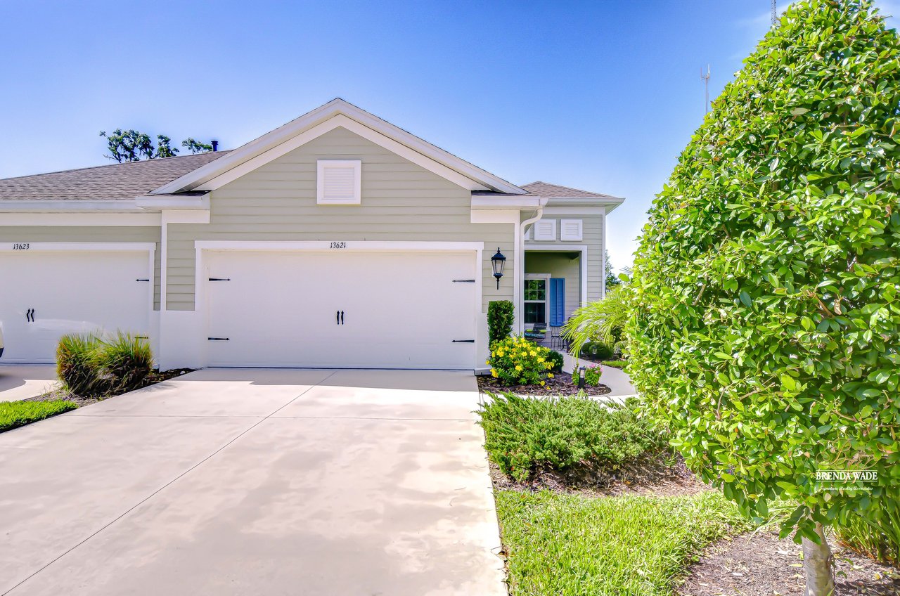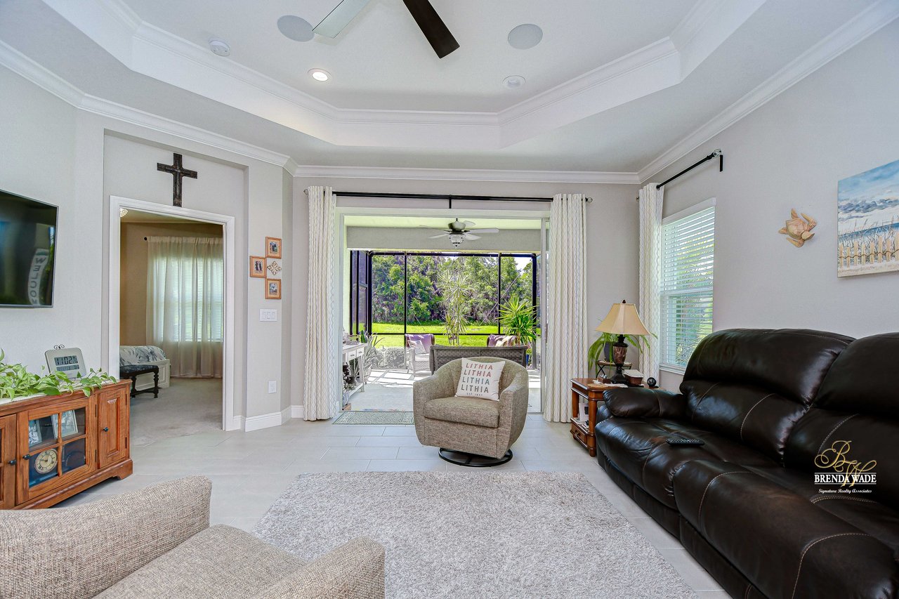 This beautifully maintained 2-bedroom PLUS private office, 2-bathroom, 2-car garage villa offers the best of Florida living! Nestled within Sagewood, a gated enclave of villas in the highly sought-after FishHawk West community, this home delivers low-maintenance living paired with top-rated Hillsborough County schools and resort-style amenities -- including parks, playground, splash pad, fitness center, and a lake house with recreation space -- all just steps from your front door! Meticulously tropical landscaped with a new glass front storm door (2023) and added gutters (2024), this home welcomes you with charming curb appeal and a covered front porch. Inside, double doors open to a private flexible home office, featuring sleek tile flooring -- ideal for working from home, a guest space, playroom, or hobby room to suit your lifestyle needs. The attractive flooring continues throughout the main living areas, enhanced by abundant natural light, crown molding, designer light fixtures throughout the home. The stunning kitchen is sure to impress with upgraded grey cabinetry with crown molding, stainless appliances including a gas range, a bold herringbone subway tile backsplash, and a large center island with breakfast bar seating -- ideal for entertaining. The open-concept design flows seamlessly from the dining area to the spacious family room, featuring a tray ceiling with crown, ceiling fan, additional built-in speakers, and pocket sliders that lead to the screened and covered lanai that also has built-in speakers-- blending indoor and outdoor living with ease. The backyard is a peaceful retreat with no rear neighbors, lush green space-- the perfect setting for entertaining or unwinding in privacy. The luxurious primary suite boasts a picturesque window, walk-in closet, and spa-like en-suite with dual vanities and a large walk-in shower. A split floor plan ensures the secondary bedroom and full guest bath are positioned for optimal privacy. Lovingly cared for and thoughtfully updated, this villa is ready for you to experience the incredible FishHawk West lifestyle -- schedule your tour today!