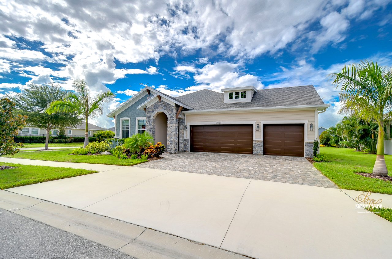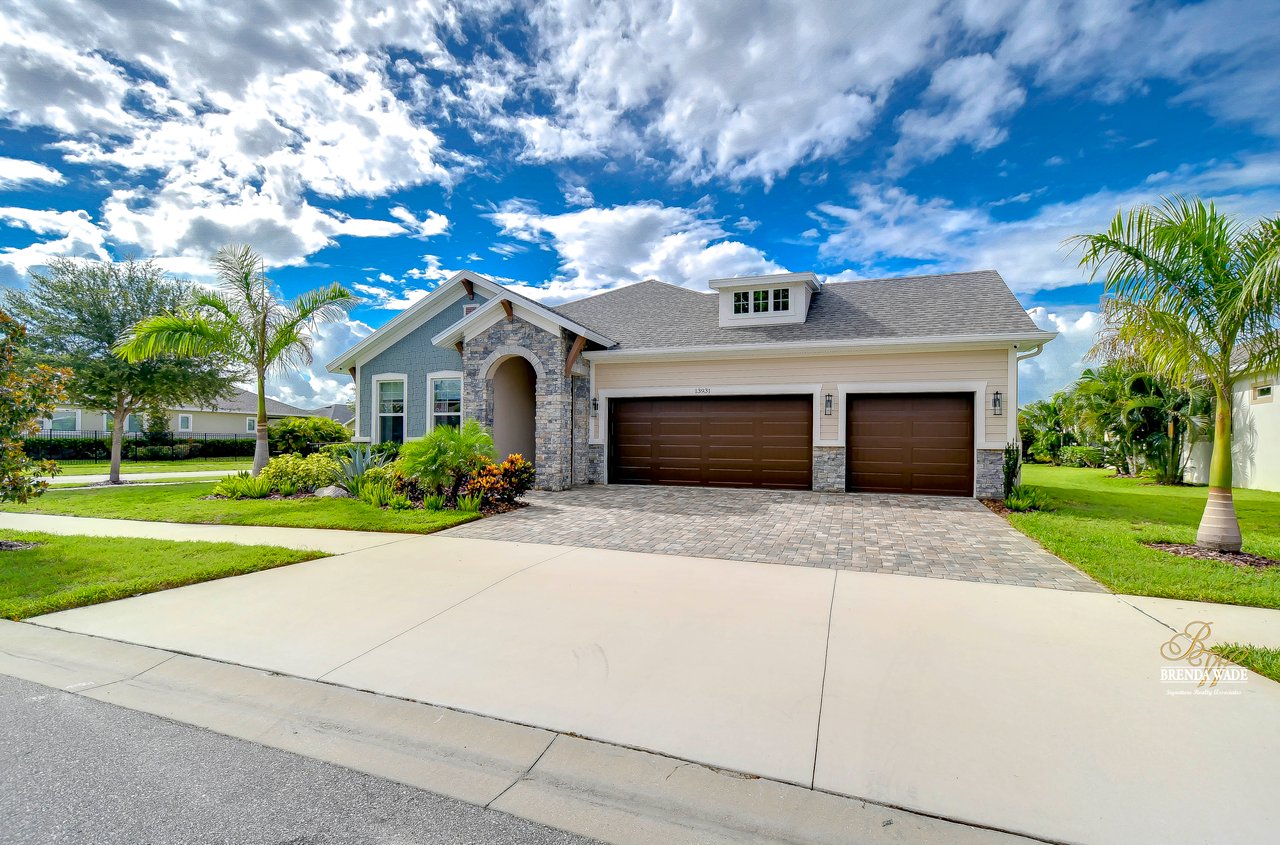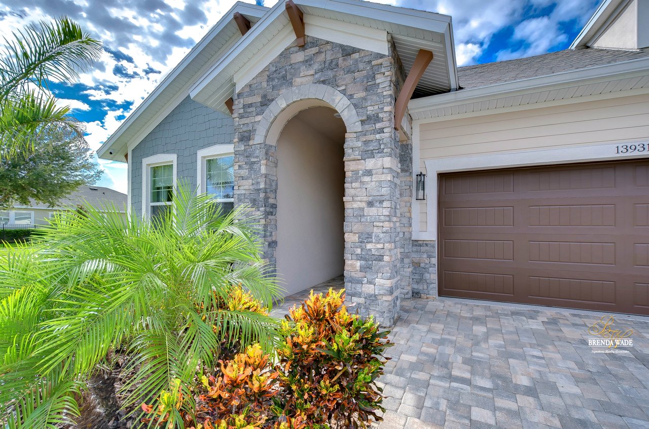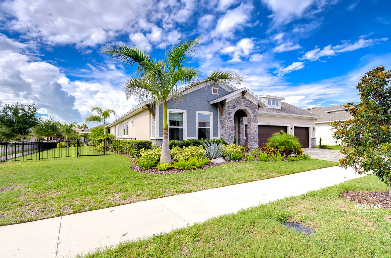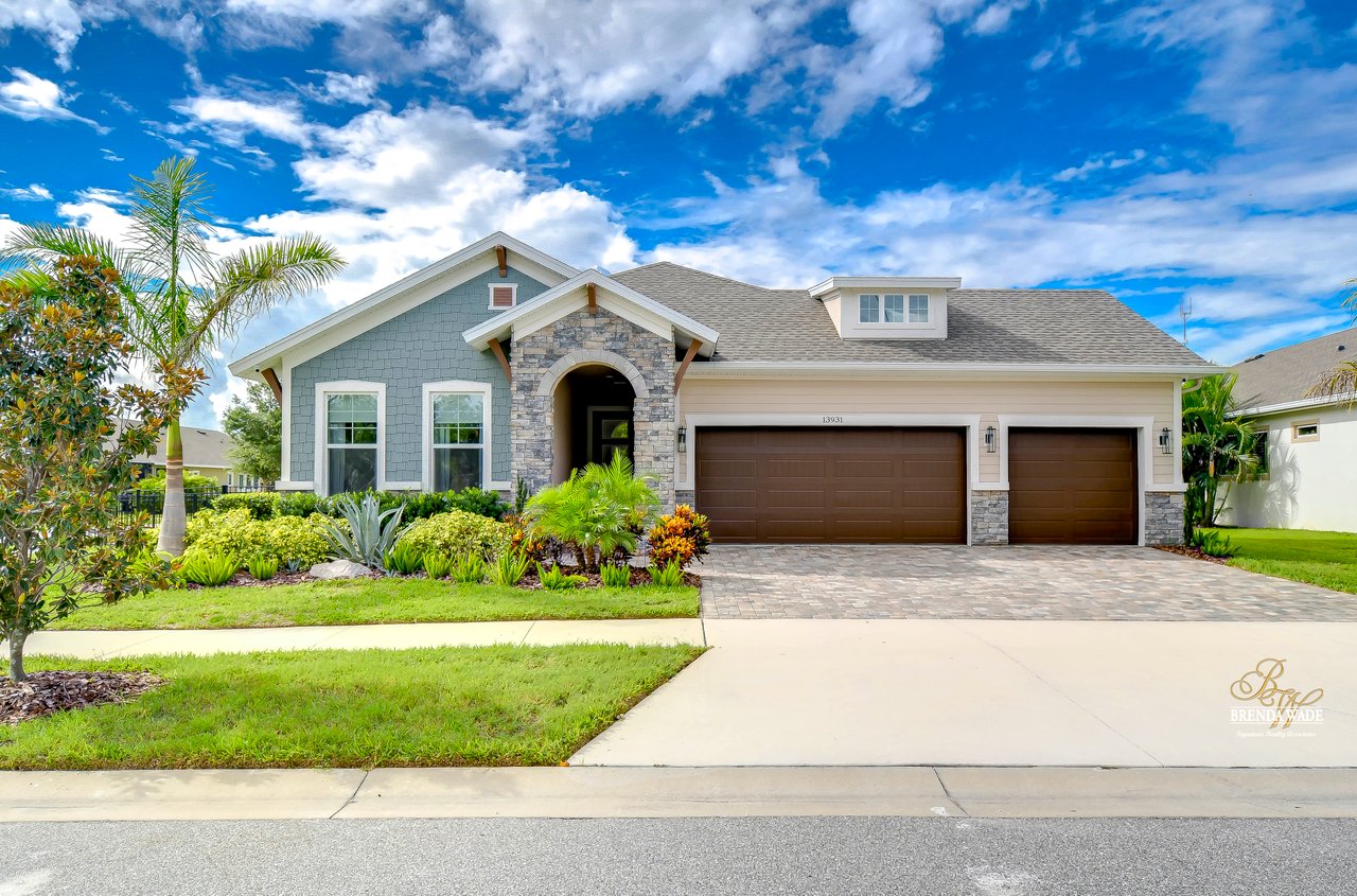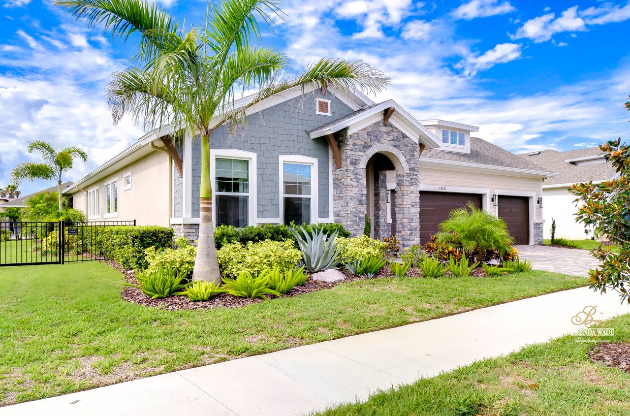 Welcome to the extraordinary resort-style living in Encore, a premier 55+ gated community that redefines the concept of active, hands-free living! A community where an on-site activities director ensures your social calendar is filled with exciting options. The Oasis Club, a hub of leisure and fitness, features a full fitness center, meeting spaces, club and party rooms, a PICKLEBALL court, multiple pools, bocce ball, fire pits, and beautiful trails. Nestled on an oversized corner lot, this stunning 3-bedroom, 3-bath home boasts a spacious 3-car garage, embodying the perfect blend of elegance and practicality. Beautiful tropical landscaping surrounds this exquisite home with pavered driveway, walkway, and stacked stone accents. The open concept and thoughtfully designed split bedroom floor plan offer an inviting and harmonious living experience. The heart of the home is a chef's dream, featuring a stunning kitchen with white cabinets, decorative backsplash, a HUGE center island with bar seating, and top-of-the-line stainless appliances. Entertain guests effortlessly in the spacious dining room adjacent to the kitchen, or enjoy the generous family room with accent well, and French door sliders leading to the inviting lanai. At the front of the home, discover a versatile flex space, perfect for an at-home office, music room, or art studio. The primary suite is a true oasis, graced with a tray ceiling, backyard views, and a STUNNING en-suite bath showcasing a luxurious, oversized walk-in shower and a HUGE custom walk-in closet with an island. Two additional bedrooms, situated in their private wing, offer large closets, and one boasts a private en-suite full bath--an ideal arrangement for guests or extended family. The entire residence emanates a sense of modern comfort and style. Conveniently located near shopping centers, parks, and dining options, this active 55+ community provides a secure and serene environment, making it the perfect place to call home. Don't miss the opportunity to experience this incredible lifestyle--schedule your private showing today and embrace the unparalleled luxury of Encore living!