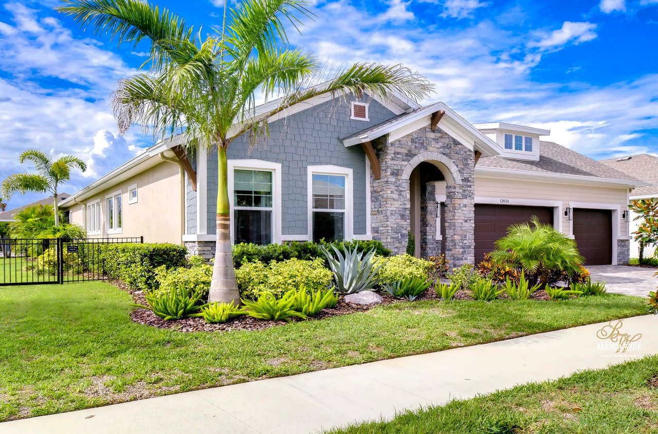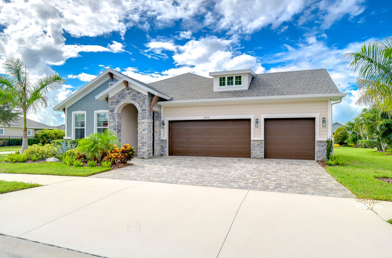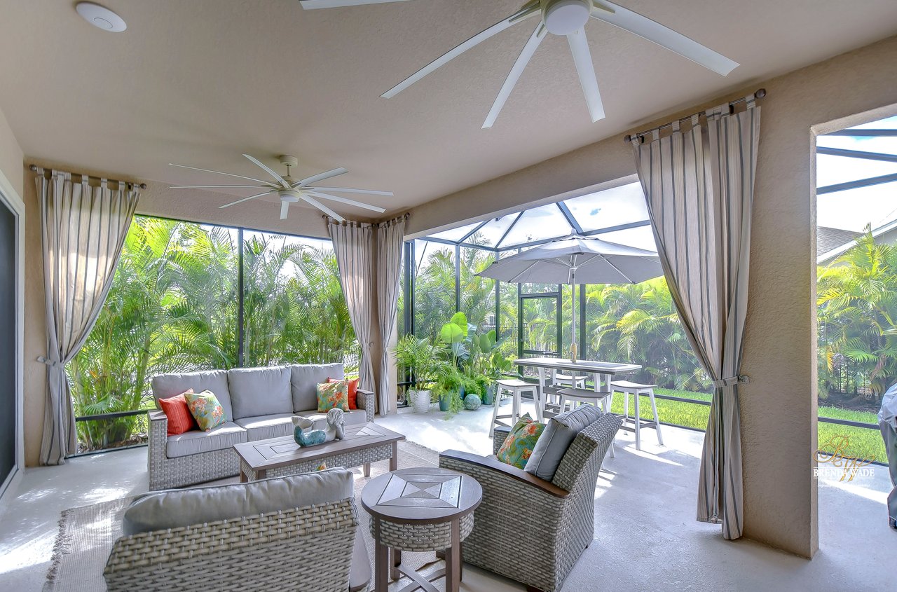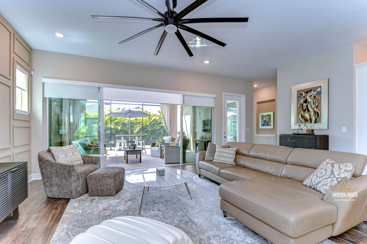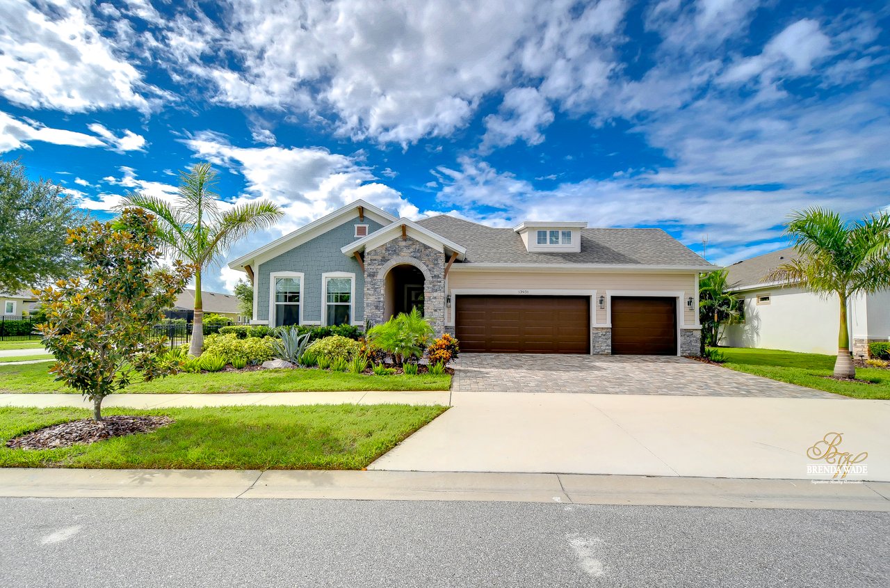 Welcome to the extraordinary resort-style living in Encore, a premier 55+ gated community that redefines the concept of active, hands-free living! A community where an on-site activities director ensures your social calendar is filled with exciting options. The Oasis Club, a hub of leisure and fitness, features a full fitness center, meeting spaces, club and party rooms, a PICKLEBALL court, multiple pools, bocce ball, fire pits, and beautiful trails. Nestled on an oversized corner lot, this stunning 3-bedroom, 3-bath home boasts a spacious 3-car garage, embodying the perfect blend of elegance and practicality. Beautiful tropical landscaping surrounds this exquisite home with pavered driveway, walkway, and stacked stone accents. The open concept and thoughtfully designed split bedroom floor plan offer an inviting and harmonious living experience. The heart of the home is a chef's dream, featuring a stunning kitchen with white cabinets, decorative backsplash, a HUGE center island with bar seating, and top-of-the-line stainless appliances. Entertain guests effortlessly in the spacious dining room adjacent to the kitchen, or enjoy the generous family room with accent well, and French door sliders leading to the inviting lanai. At the front of the home, discover a versatile flex space, perfect for an at-home office, music room, or art studio. The primary suite is a true oasis, graced with a tray ceiling, backyard views, and a STUNNING en-suite bath showcasing a luxurious, oversized walk-in shower and a HUGE custom walk-in closet with an island. Two additional bedrooms, situated in their private wing, offer large closets, and one boasts a private en-suite full bath--an ideal arrangement for guests or extended family. The entire residence emanates a sense of modern comfort and style. Conveniently located near shopping centers, parks, and dining options, this active 55+ community provides a secure and serene environment, making it the perfect place to call home. Don't miss the opportunity to experience this incredible lifestyle--schedule your private showing today and embrace the unparalleled luxury of Encore living!