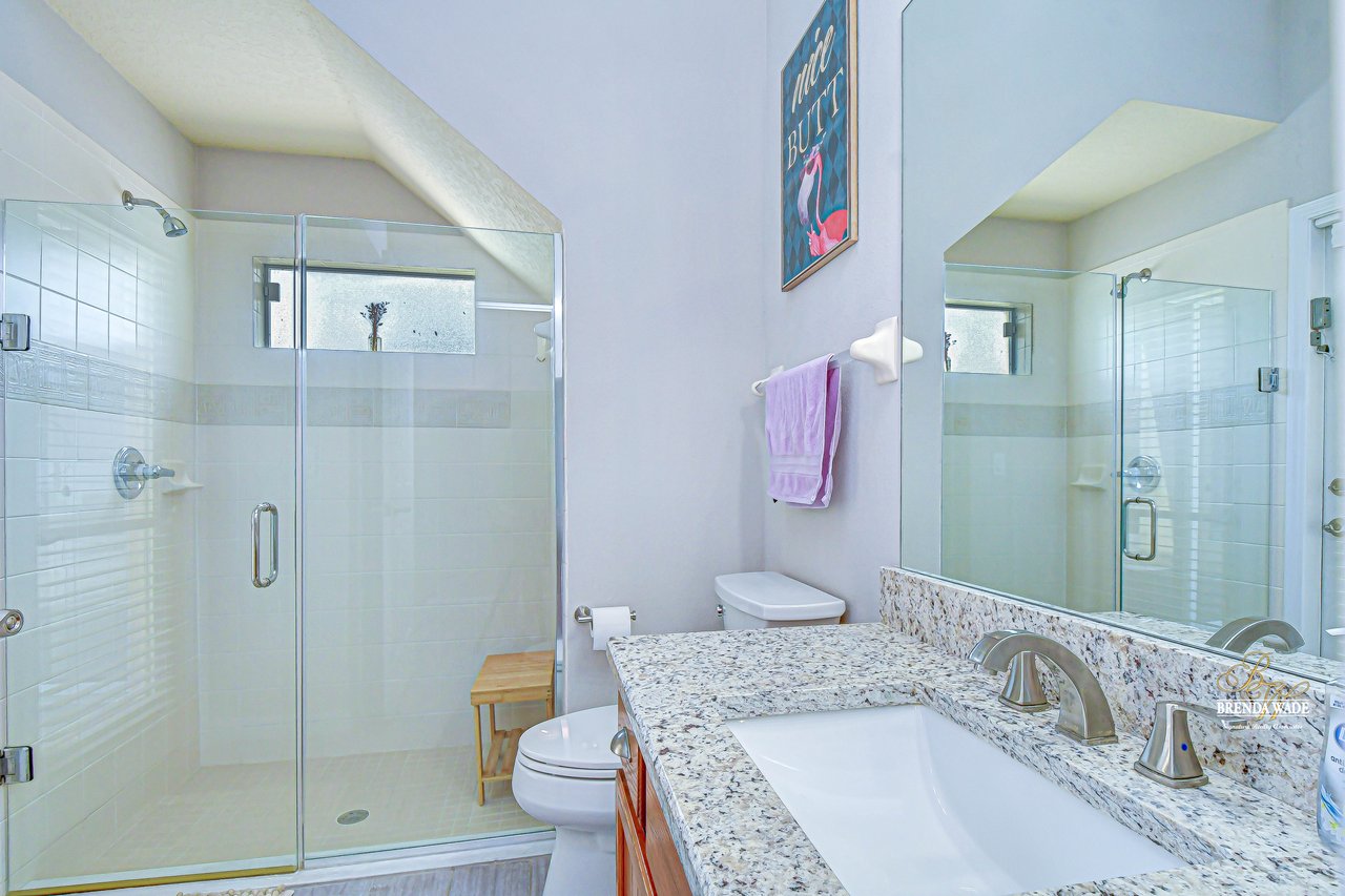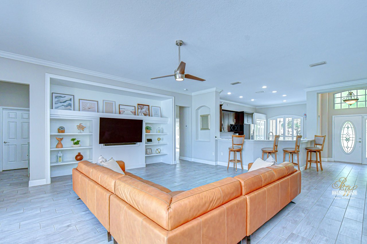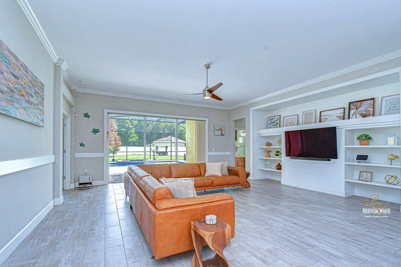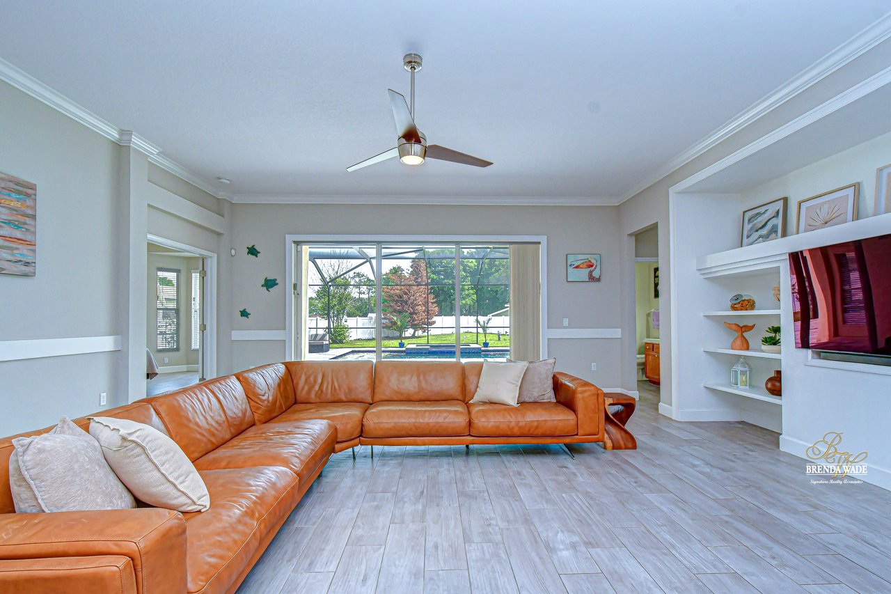 This beautifully renovated gated pool home offers a rare opportunity to own a private retreat on an oversized, nearly half-acre (.48) pie-shaped lot. Featuring 4 bedrooms, a bonus room, 3 bathrooms, and a 3-car garage, the property showcases exceptional curb appeal with lush landscaping and a fully fenced yard, along with major recent upgrades for peace of mind, including a new roof and gutters (2026), new well tank and pump (2026), power transfer switch installed in 2025- perfect for a generator, water heater (2025), and downstairs A/C replaced in 2025, upstairs A/C replaced in 2022, B-Hyve Smart Irrigation system installed in 2023. Step inside to a stunning gourmet kitchen (renovated in 2021) featuring solid quartz countertops, rich cappuccino cabinetry, matching stainless steel appliances, and a vented exhaust system. The breakfast area, oversized island, and cafe counters provide ample space for prep, serving, and casual dining, while the open-concept layout flows seamlessly into the spacious family room--perfect for entertaining and everyday living. Just off the main living space, enjoy the elegance of a private dining room with charming French doors, and a large family/great room with built-in shelving. The thoughtfully designed split floor plan offers privacy, highlighted by the extended primary retreat with double-door entry, bay windows, and direct access to the lanai and pool. The luxurious en suite bath features dual granite vanities, a garden whirlpool tub, separate tiled shower, and a large walk-in closet. On the opposite side of the home are two spacious bedrooms connected by a Jack & Jill bath, along with a private guest/in-law suite or office with a full pool bath and direct outdoor access. Upstairs, an expansive bonus/theater room provides additional flexible living space. Step outside to your ultimate Florida oasis--a resort-style brick-paver screened lanai featuring a heated saltwater pool and spa with Pebble Tech finish and smartphone-controlled automation system. The outdoor kitchen is fully equipped with a propane grill, side burner, and refrigerator, making it ideal for year-round entertaining. The expansive backyard offers plenty of space for kids, pets, and storage for RVs or boats, all enclosed with low-maintenance PVC fencing for maximum privacy. Additional features include wood-look ceramic tile flooring throughout the first floor (2020), modern paint, crown molding, ceiling fans, a water softener system (2020), ADT security system, a garage door system (2023), and expanded PVC fencing. Located in the highly desirable Creekside community, residents enjoy spacious homesites, low HOA fees, and NO CDD--all in a peaceful, private setting. This move-in-ready beauty is a must-see and will not last!