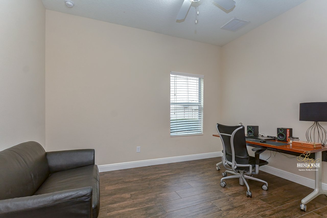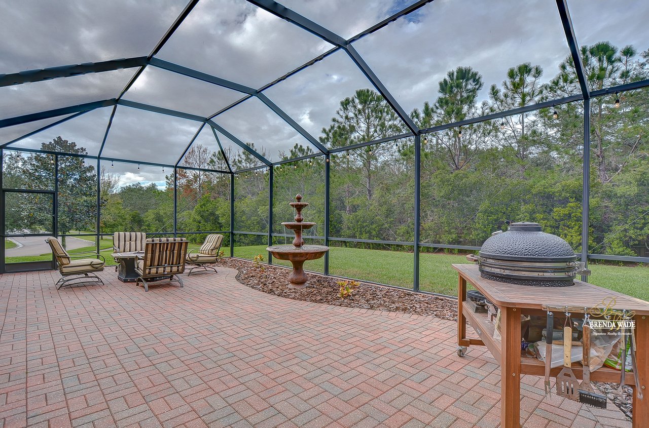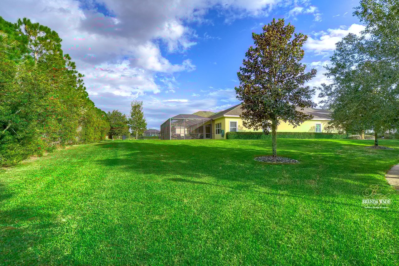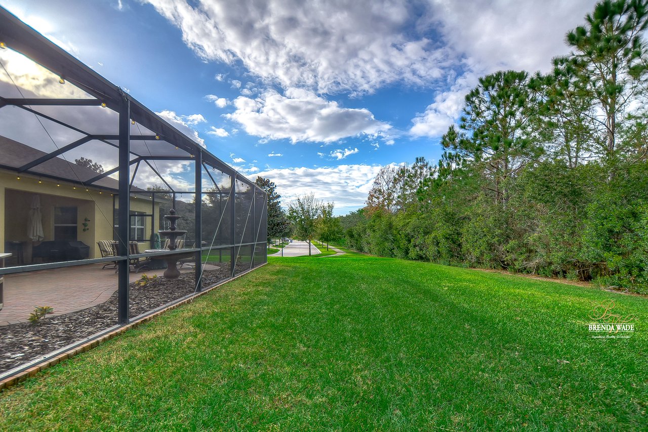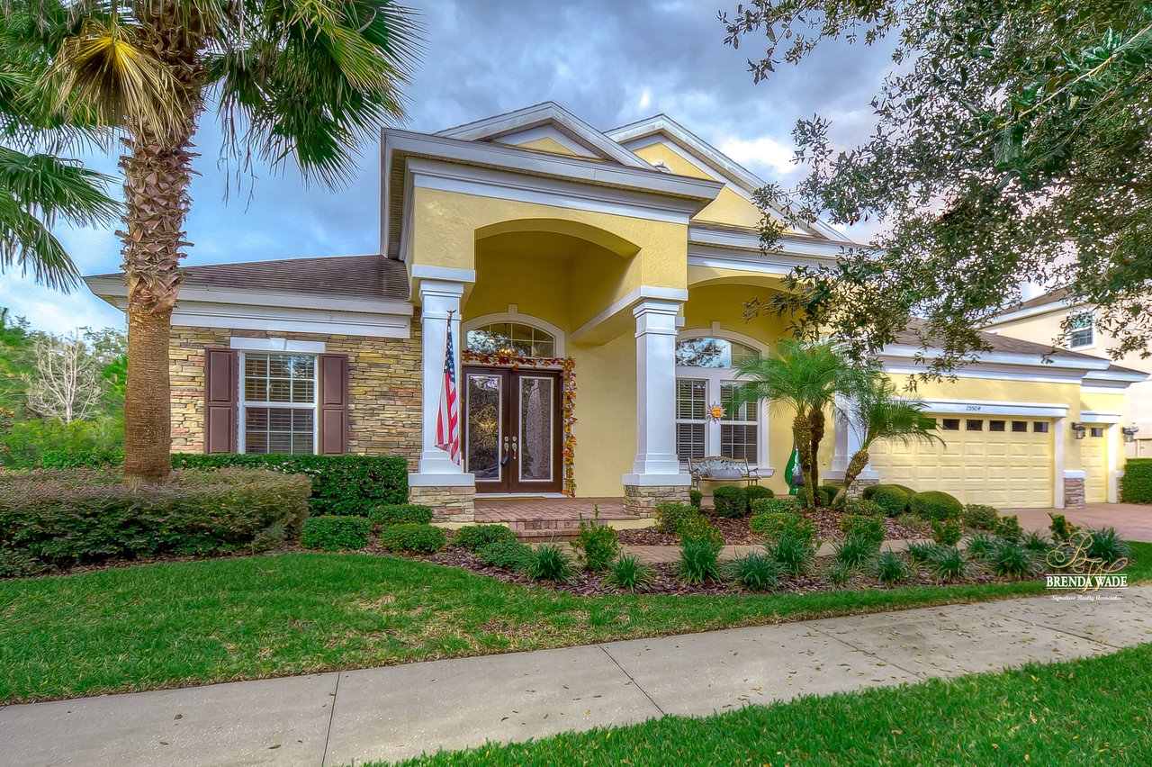 You don’t want to miss out on this one! It is everything on your checklist and MORE! Starting with the exterior, this beautiful home sits on an oversized corner lot, so you only have neighbors on one side! To make it even better, there are lush trees in your backyard so you don’t have any backyard neighbors either! Park on your pavered driveway and enjoy the stacked stone accents as well as a charming front porch to enjoy your morning coffee! Head through the double glass front doors and discover the enormous open concept floor plan that will transcend the way you entertain and live your day-to-day living! There is a private home office behind a set of french doors so working from home will be a peaceful environment allowing you to be excited to get work done every day! The living areas will captivate you with the soaring ceilings, neutral paint, and large tile flooring! The dining room offers bright windows, crown molding, and an arch entryway to the kitchen so holiday meals will surely be hosted at your house moving forward! The kitchen is STUNNING! This space will surely become a gathering place with the HUGE center island, granite counters, 42-in cabinets with crown, under cabinet lighting with a flawless backsplash, stainless appliances including statement range hood, and walk-in pantry! There is a spacious dinette area for easy meals and opens to the REMARKABLE great room! There is a wall of sliders that lead to the screened lanai and open perfectly to entertain inside and out! The primary suite has a double door entrance and features dual walk-in closets as well as an en-suite with double sinks, makeup vanity, walk-in shower, and separate soaking tub! Two additional bedrooms share a second full bathroom! The fourth bedroom is ideal for guests or in-laws being secluded at the back of the home with a walk-in closet and its own full bathroom nearby! This community is loaded with resort-style amenities and zoned for some of the best schools in the county! Does it get any better than this?!