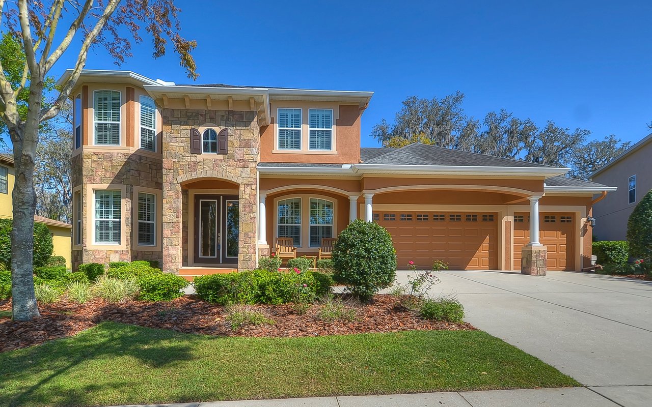 David Weekley “Oakwood” floor plan features all the bells and whistles! Eye catching curb appeal boasting stacked stone accents, Tuscan elevation, 2015 exterior paint and delightful covered front porch where you can enjoy your morning coffee! Fresh Zoysia sod was placed in 2016, this lush yard is enviable! So much space to entertain family and friends in this home with a spacious dining room opening to the kitchen along with a large great room also overlooking the kitchen! Inviting living space offers custom built-in’s and wall of windows with marvelous pool and conservation views! Gourmet kitchen features tons of upgrades including granite counters, subway tile backsplash, built-in stainless appliances including gas range, Center Island and breakfast bar seating! Need a more casual space for weekday meals, the sunny eat-in nook is the perfect spot with French door leading to the lanai! All this living space features rich wood flooring! Functional plan with the master suite found on the 1st floor with tray ceiling, picturesque window and en-suite with walk-in closet, his and hers sinks, jetted tub and walk-in shower! Upstairs is a kid’s paradise! Enormous loft/open bonus room at the top of the stairs; the ideal spot for a game room or just a 2nd living area! Two bedrooms upstairs share Jack and Jill bath each with separate vanity areas and walk-in closets! A fourth bedroom is the perfect guest suite! Outdoor living calls your name on the tranquil pavered and screened lanai boasting sparkling swimming pool/spa and outdoor kitchen with gas grill and refrigerator!