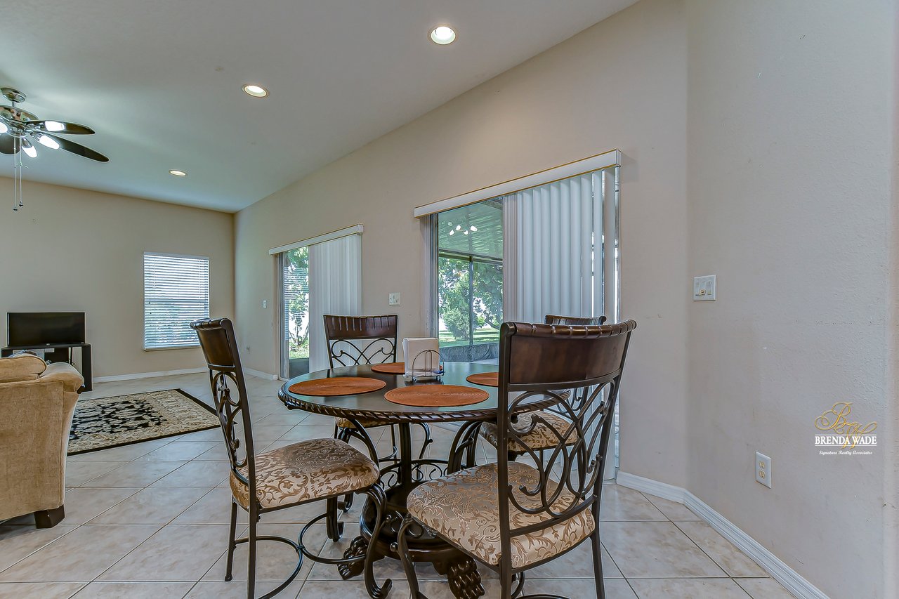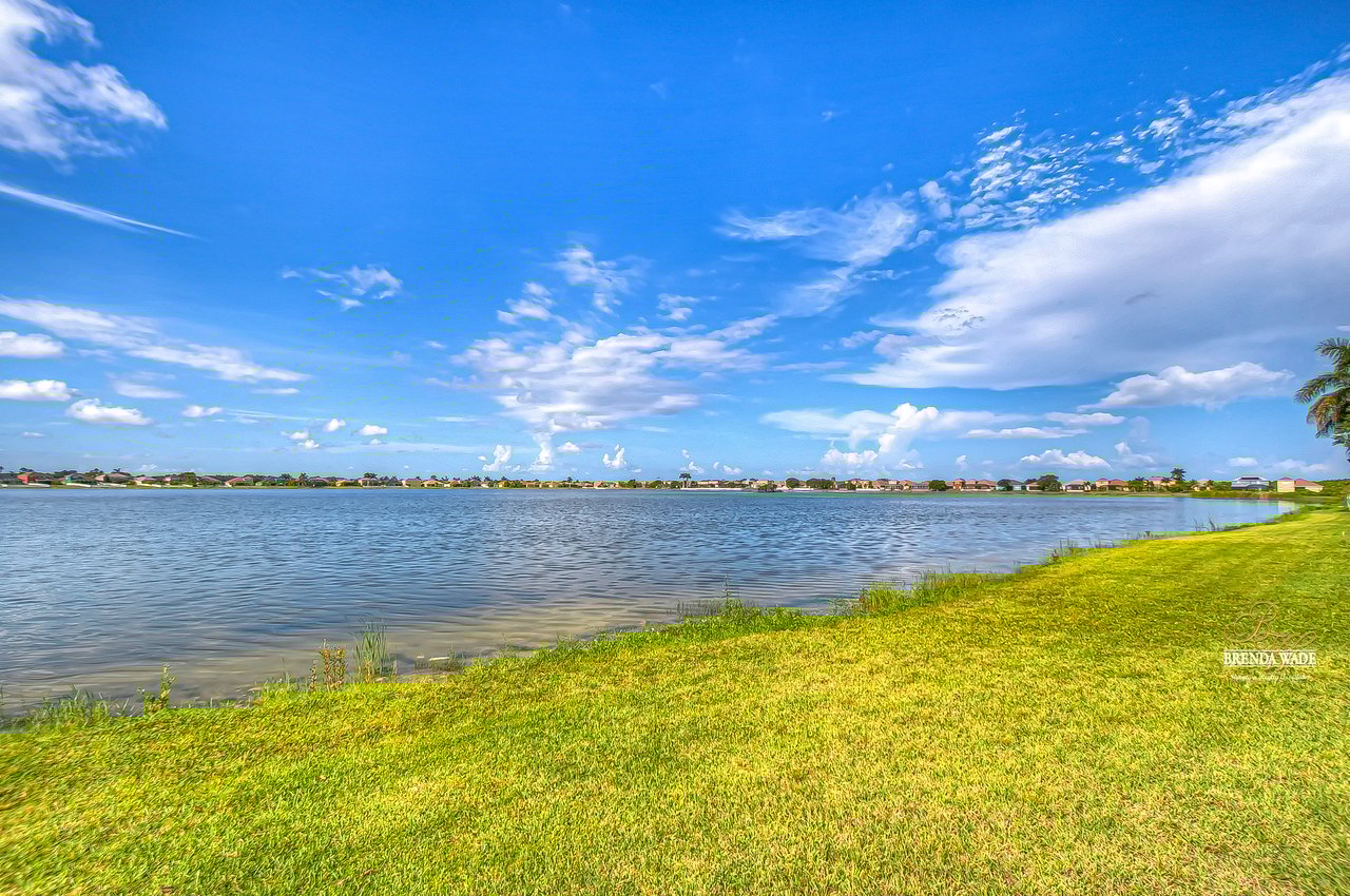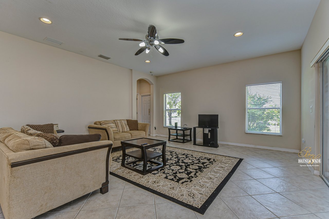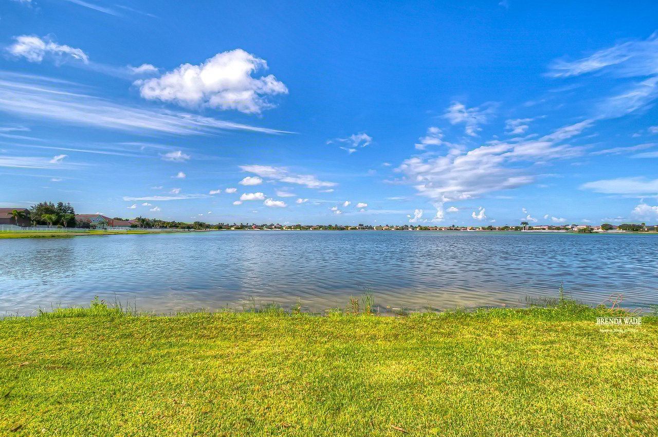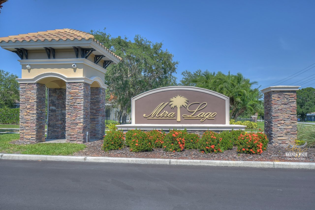 Welcome to this wonderful home that sits lakeside in the picturesque, gated Mira Lago community! Views like this do not come along often so do not delay and come and come take a look at this fantastic opportunity! Boasting 4 bedrooms, 3 baths, and almost 2,200 SqFt that lives large, this is the perfect family home! Be greeted by the impressive curb appeal that features a spacious lot with lush landscaping and home that features decorative accents including arched window frames and entrance way! Through the front door with sidelight, you arrive in the foyer! Notice the formal rooms that both offer wood floors and make the perfect entertaining space! The main living areas offer oversized tile on the diagonal with the family room boasting a wall of windows as well as a slider, making the most of the natural light! The kitchen with warm cherry cabinets, island, and closet pantry overlooks the family room making it the perfect spot to hang out with family while preparing family meals! The private primary suite, on its own side of the house, is a tranquil oasis with beautiful flooring, double slider, and dual closets giving you plenty of storage! The primary bath with soaking tub, walk-in shower and his and her sinks will be your sanctuary! There are two additional bedrooms sharing the second bathroom while the fourth bedroom and third bath are at the back of the home! This triple split floor plan is ideal for guests or a multi-generational family! The home is painted in neutral color tones so it is ready and waiting for you to bring your furniture and decor! At the back of the home, you will find a large screened and covered lanai with tile floors where you can spend your time appreciating the wonderful water views! Mira Lago is a wonderful community with resort-style community pool, playground, park, tennis courts, and more! Come take a look at this wonderful home and make it yours!