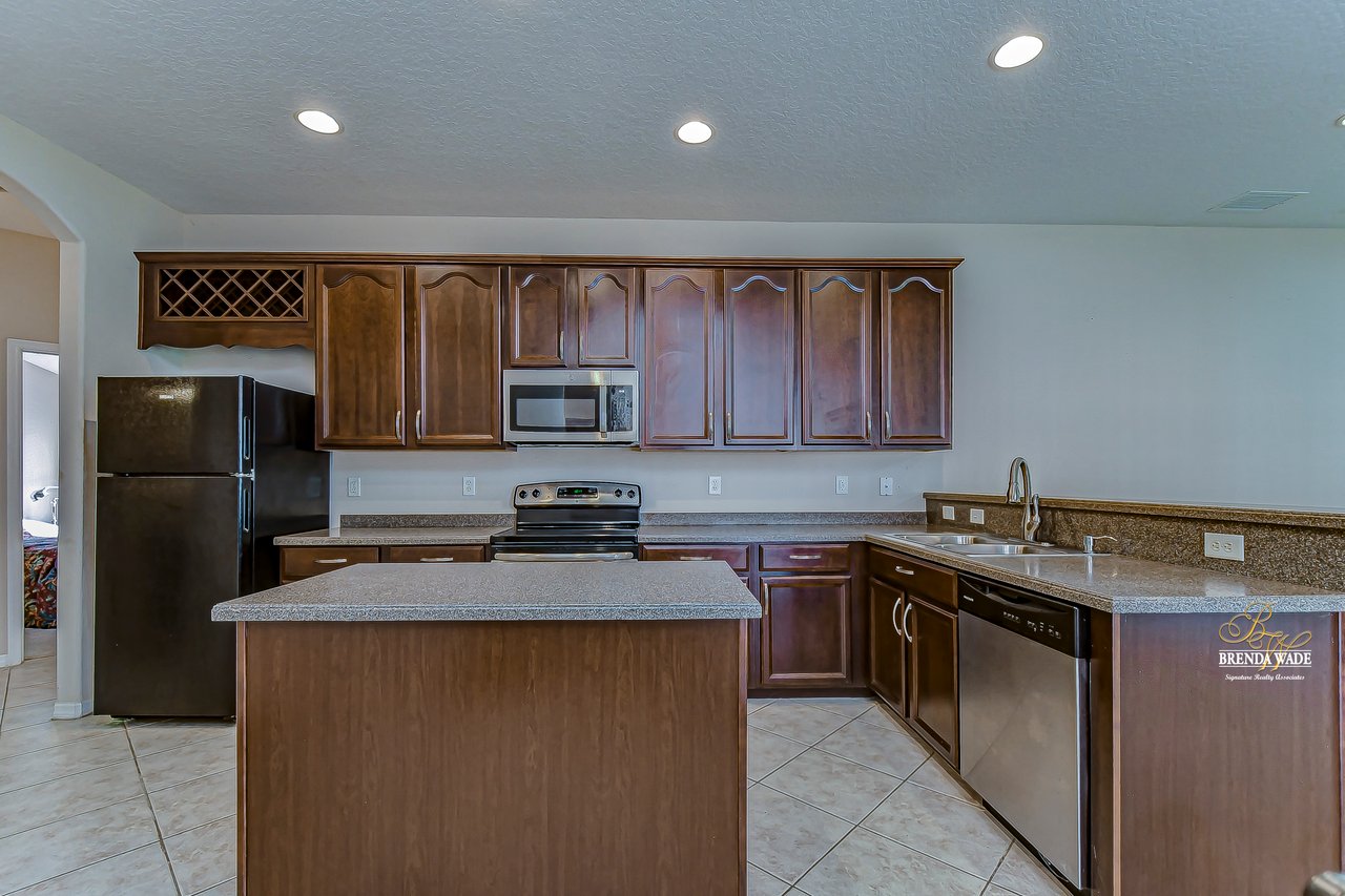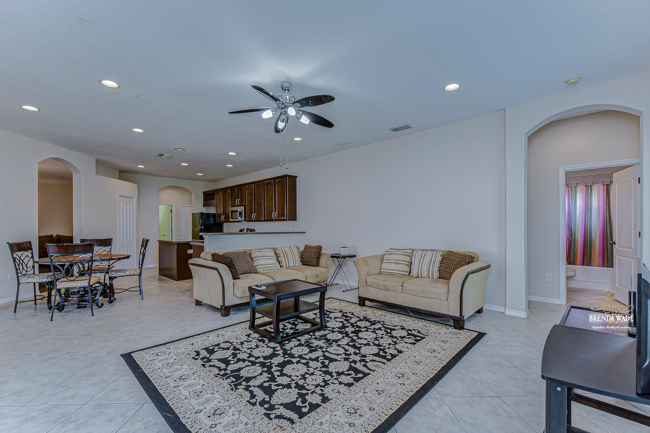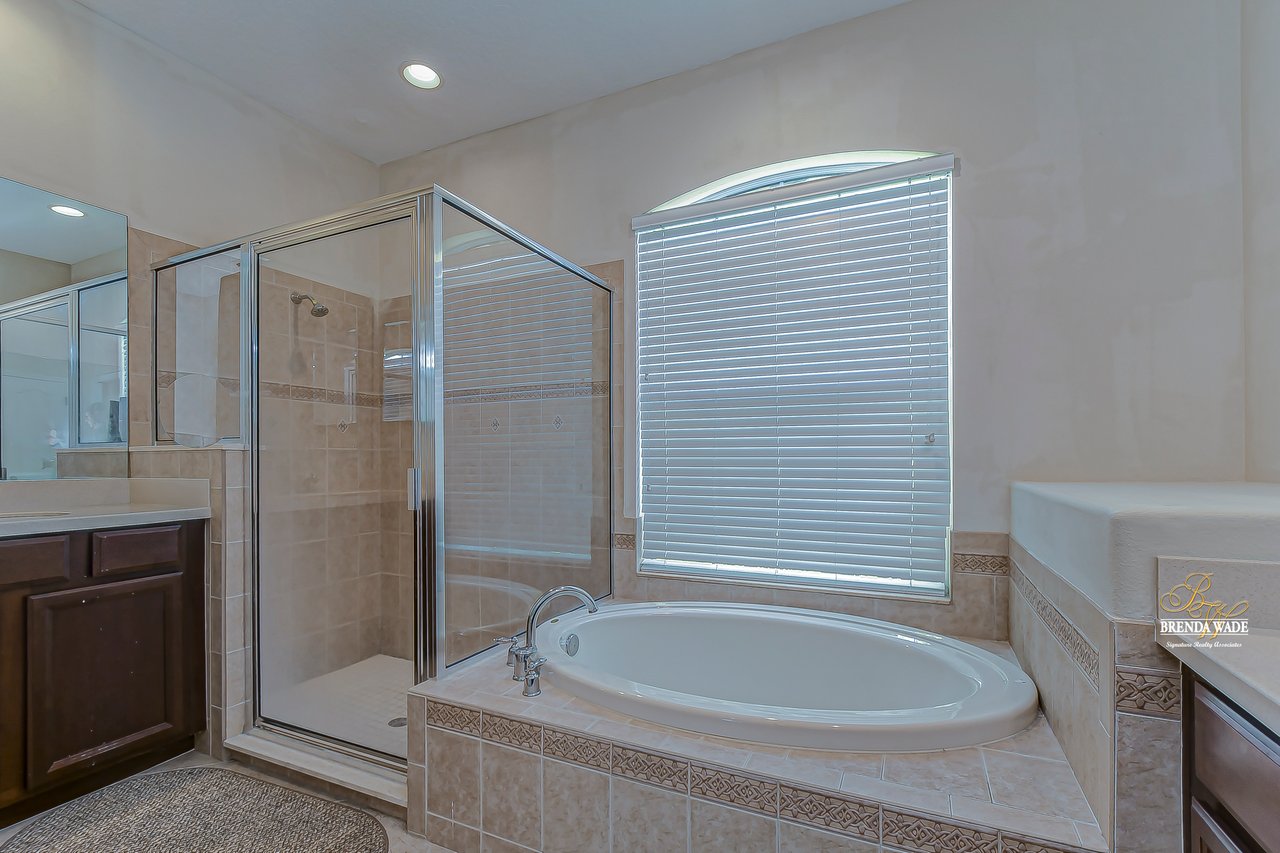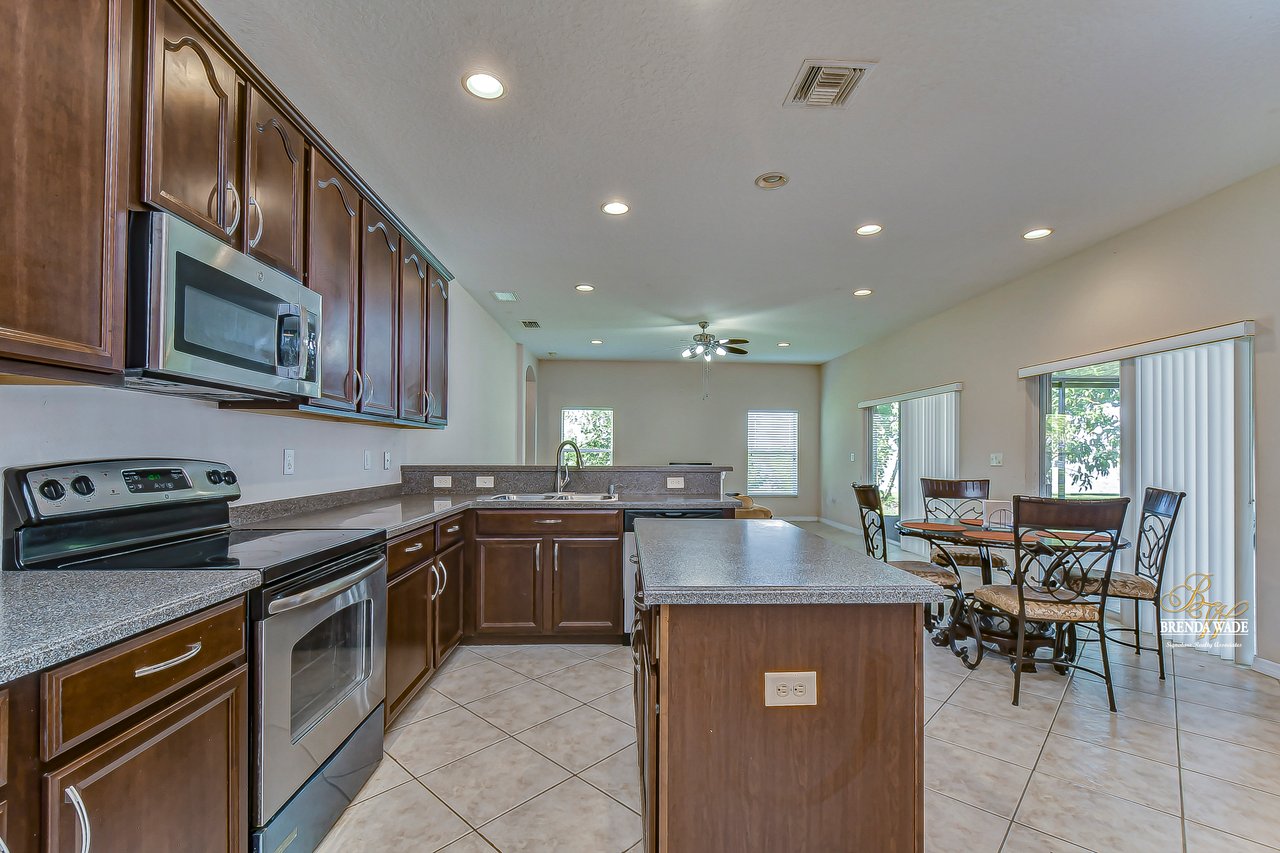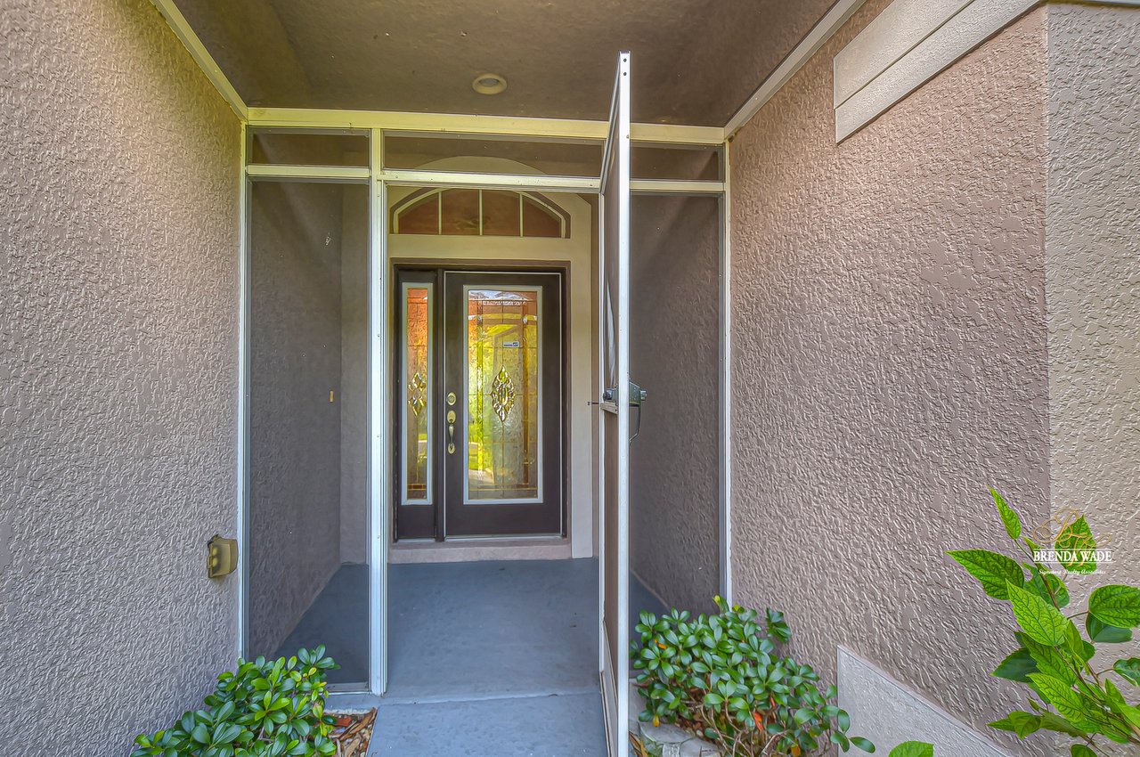 Welcome to this wonderful home that sits lakeside in the picturesque, gated Mira Lago community! Views like this do not come along often so do not delay and come and come take a look at this fantastic opportunity! Boasting 4 bedrooms, 3 baths, and almost 2,200 SqFt that lives large, this is the perfect family home! Be greeted by the impressive curb appeal that features a spacious lot with lush landscaping and home that features decorative accents including arched window frames and entrance way! Through the front door with sidelight, you arrive in the foyer! Notice the formal rooms that both offer wood floors and make the perfect entertaining space! The main living areas offer oversized tile on the diagonal with the family room boasting a wall of windows as well as a slider, making the most of the natural light! The kitchen with warm cherry cabinets, island, and closet pantry overlooks the family room making it the perfect spot to hang out with family while preparing family meals! The private primary suite, on its own side of the house, is a tranquil oasis with beautiful flooring, double slider, and dual closets giving you plenty of storage! The primary bath with soaking tub, walk-in shower and his and her sinks will be your sanctuary! There are two additional bedrooms sharing the second bathroom while the fourth bedroom and third bath are at the back of the home! This triple split floor plan is ideal for guests or a multi-generational family! The home is painted in neutral color tones so it is ready and waiting for you to bring your furniture and decor! At the back of the home, you will find a large screened and covered lanai with tile floors where you can spend your time appreciating the wonderful water views! Mira Lago is a wonderful community with resort-style community pool, playground, park, tennis courts, and more! Come take a look at this wonderful home and make it yours!