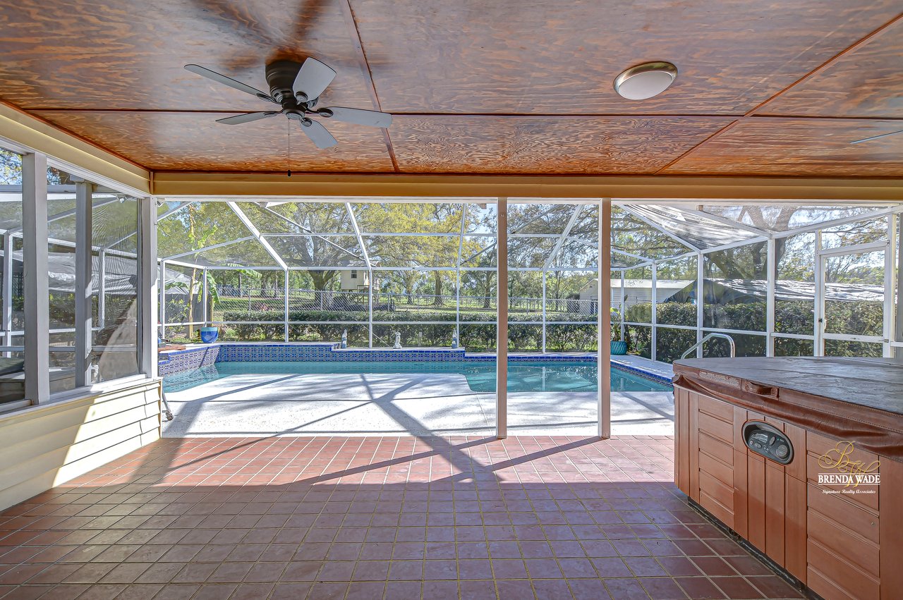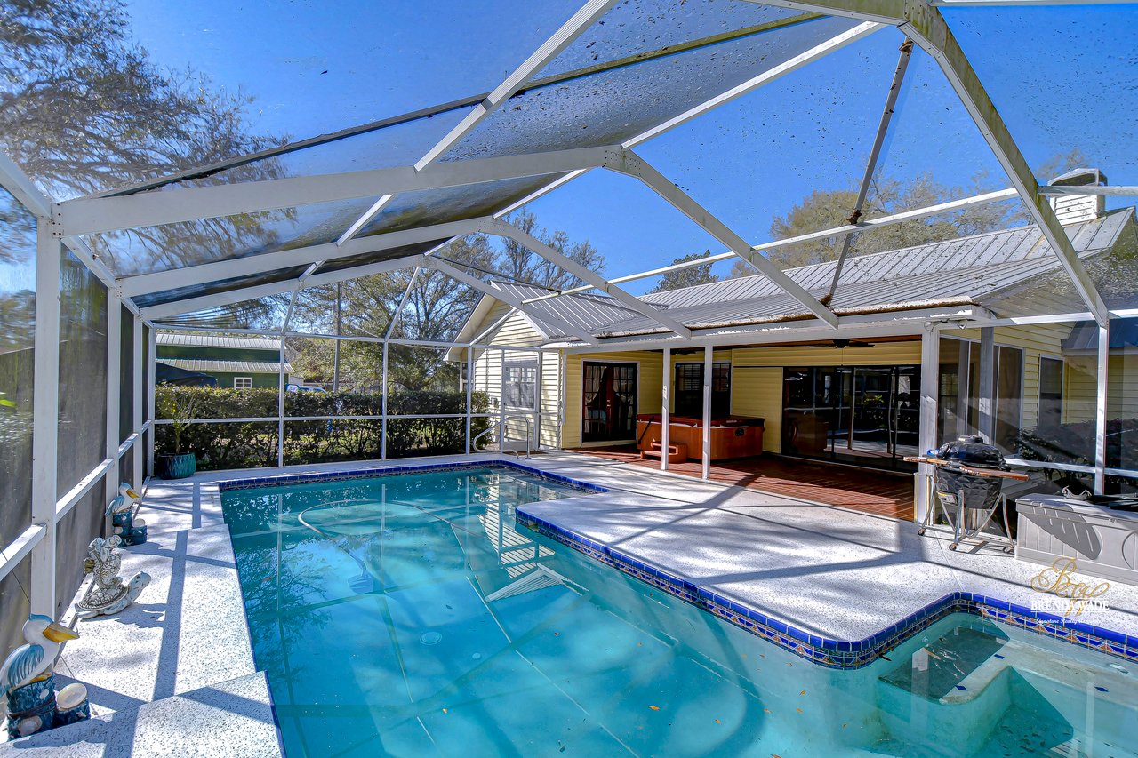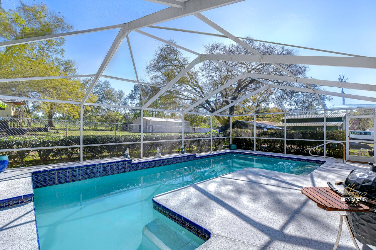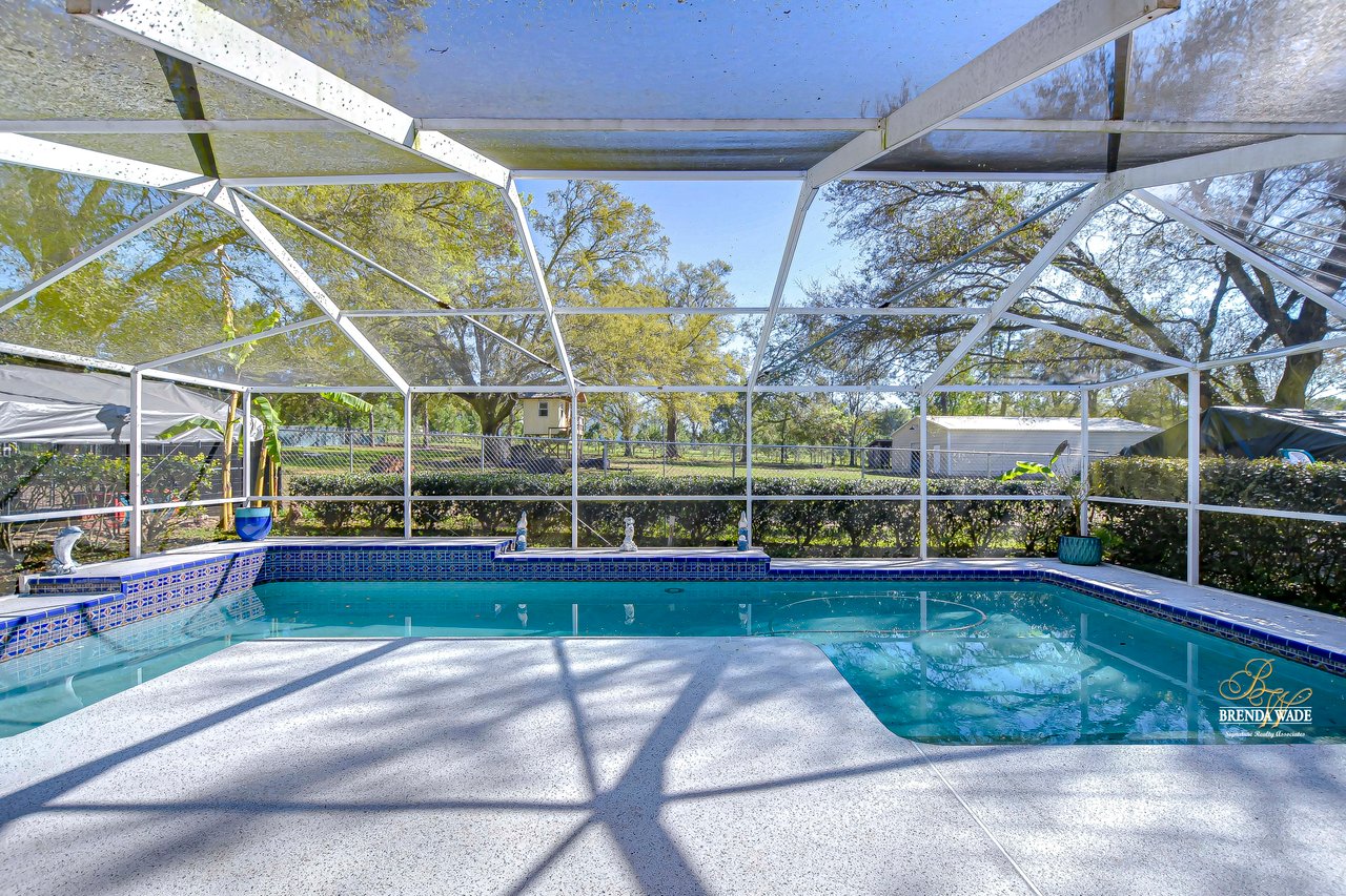 Completely remodeled and perfectly situated on 2.87 acres in the rolling hills of Dade City's Blanton area, this 3 bedroom, 2 bath + bonus room pool home offers an expansive open floor plan living space, stunning upgrades, and a beautiful outdoor setting perfect for comfortable rural living. Arrive at this serene property down a long, welcoming driveway lined with mature trees, leading to a spacious parking pad and a detached 37x25 garage. Step inside through the charming covered front porch and be immediately captivated by the expansive open-concept floor plan, highlighted by gorgeous porcelain tile flooring throughout, vaulted ceilings, wood beam accents, and a stunning stone-faced wood-burning fireplace with a live-edge wooden mantle. Natural light floods the living space through triple sliding doors, creating seamless indoor-outdoor living with direct access to the pool deck. The completely remodeled kitchen is a chef's dream, featuring brand-new appliances, stone countertops, a central island with storage, stylish updated lighting, and an eat-in dinette. Entertain guests effortlessly in the formal dining room, conveniently located just off the kitchen. Privately split from the secondary bedrooms, the primary suite offers a peaceful retreat with private French door access to the pool deck, a massive walk-in closet, and a luxuriously updated ensuite bathroom featuring a soaking tub, dual sinks, updated lighting, and a custom walk-in shower with a sleek glass enclosure. Two additional secondary bedrooms are generously sized and share the home's beautifully updated full bath. Additionally, a versatile bonus room offers endless possibilities -- use it as an additional bedroom, a home office, playroom, media room, or more! Step outside and fall in love with your personal slice of Florida paradise. The lanai and pool deck overlook a lush backyard, fully enclosed with added privacy fencing. Beyond the pool, two spacious outdoor buildings have been added to maximize your storage and functionality. The largest building is 50x30, offering ample space for equipment, hobbies, or storage. Another 30x14 building features running water and its own water heater, adding endless possibilities for a workshop, guest space, or more! The fenced back pasture is ideal for livestock or outdoor fun, complete with an agricultural stall, feeding pen, and even a treehouse! Located just minutes from the highway and a short drive to downtown Dade City, this property combines modern luxury with the charm of country living. Don't miss your opportunity to own this beautiful, fully updated home with exceptional land and functionality -- call us today for your private tour!