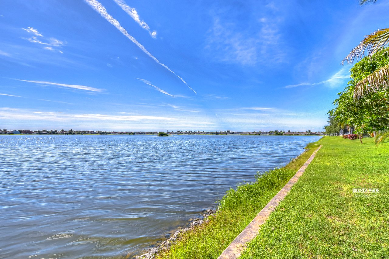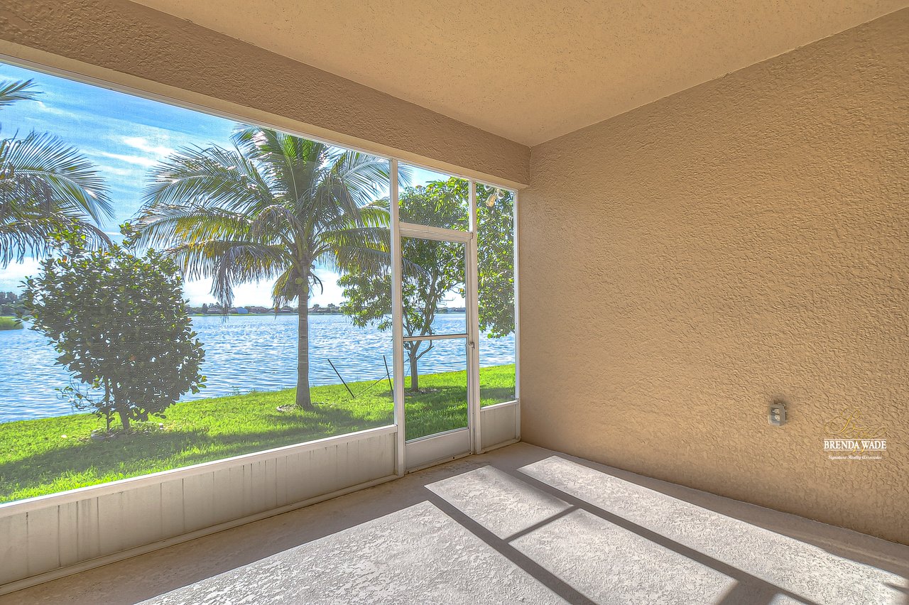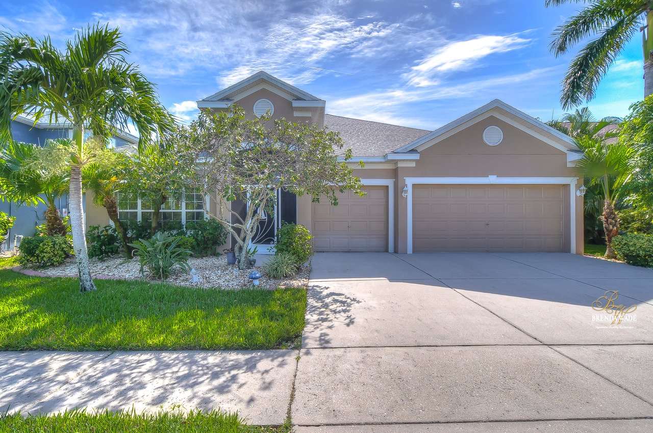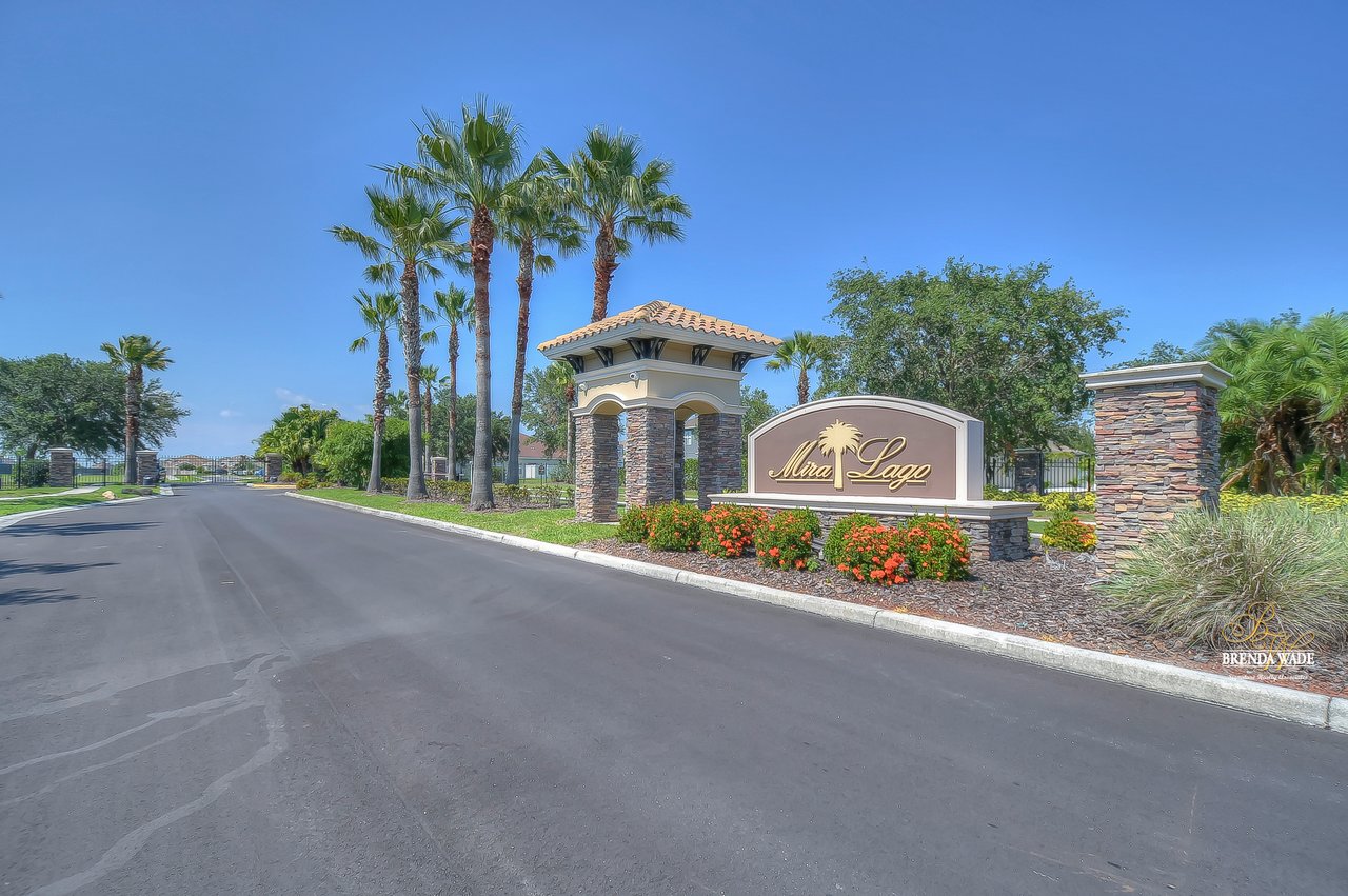 WATERFRONT BLISS! This gorgeous home is located in the desirable, gated Mira Lago community with views that will have you swooning! The front elevation is charming with a 3-car garage, tropical landscaping, screened-in front porch, and no neighbors in front of you!! Step through the double front door and appreciate the soaring ceilings, neutral paint, and bright natural lighting! There is a tray ceiling in the foyer leading you into the open living and dining room combination! This kitchen lives big and it sure is A M A Z I N G! 42-in wood cabinetry topped with crown, extensive breakfast bar, center island, tile backsplash, and a spacious breakfast nook with plenty of room to fit the whole family! The kitchen overlooks the family room with stunning water views, triple sliding glass doors, and large ceramic tile flooring! The primary suite is secluded on one side of the home with dual windows looking over the pond, dual walk-in closets, and en-suite bathroom with dual sinks, soaking tub, and walk-in shower! The triple split floorplan allows the second bedroom to reside at the back of the home with a walk-in closet, and attached en-suite bathroom with access to the lanai! This is a great opportunity for a guest or in-law suite! The third and fourth bedroom share their own wing with a third designated bathroom nearby! You will adore spending your days on the screened and covered lanai relaxing and taking in that tranquil waterfront setting! Mira Lago is a wonderful community with resort-style community pool, playground, park, tennis courts, and more! There is so much to fall in love with, what are you waiting for?!