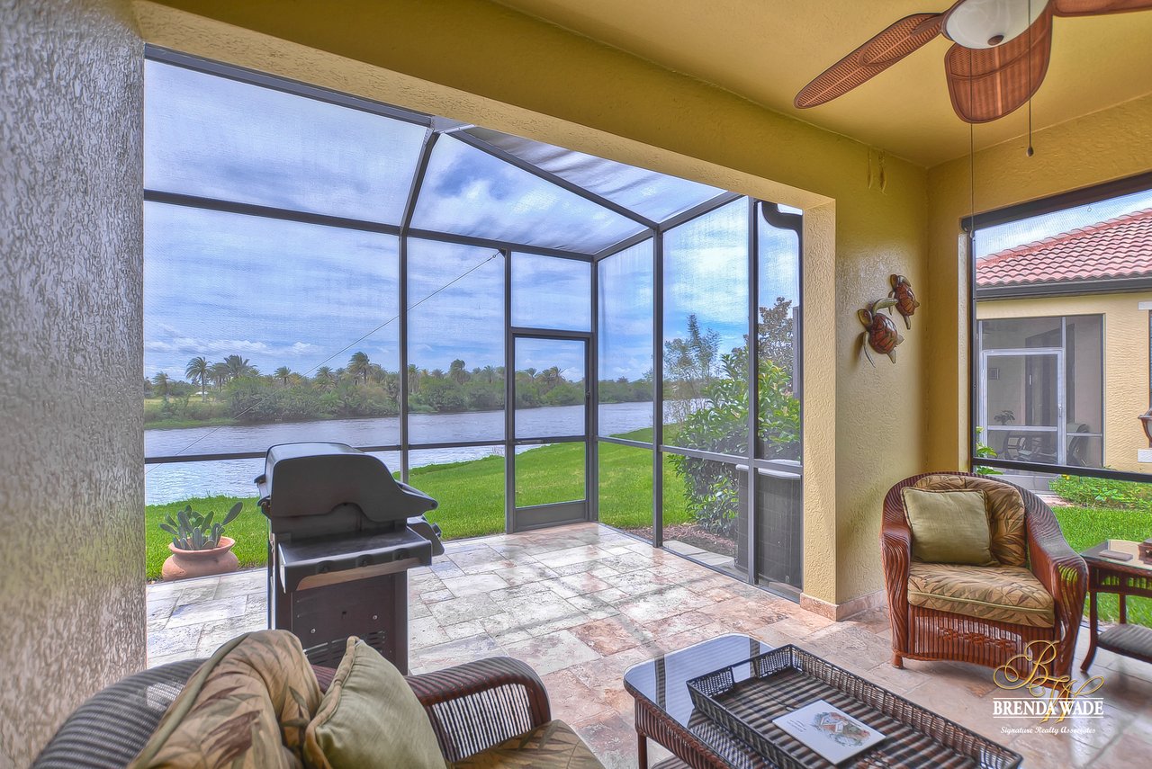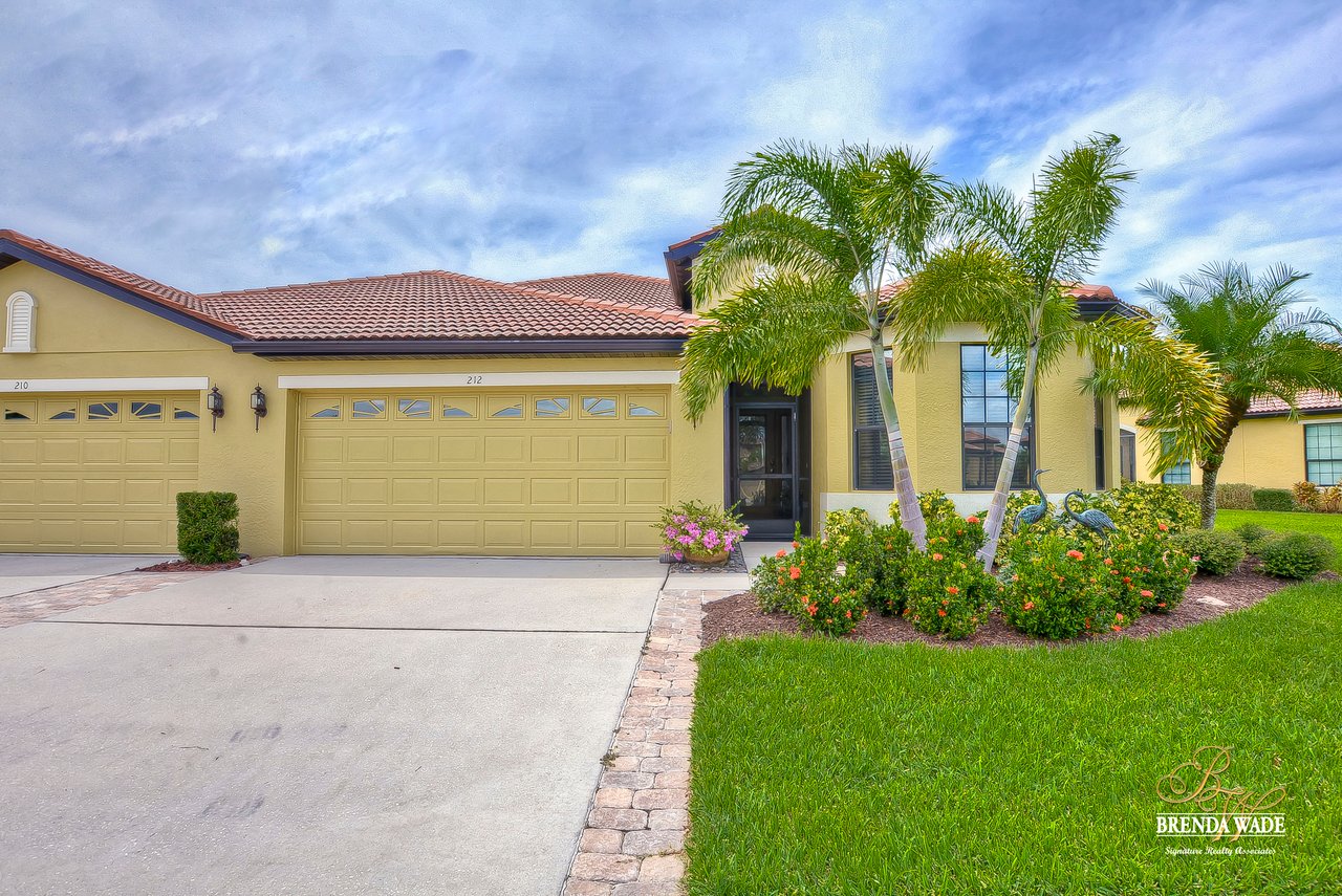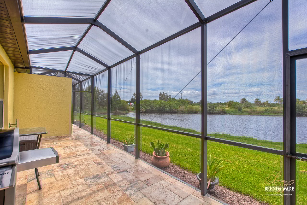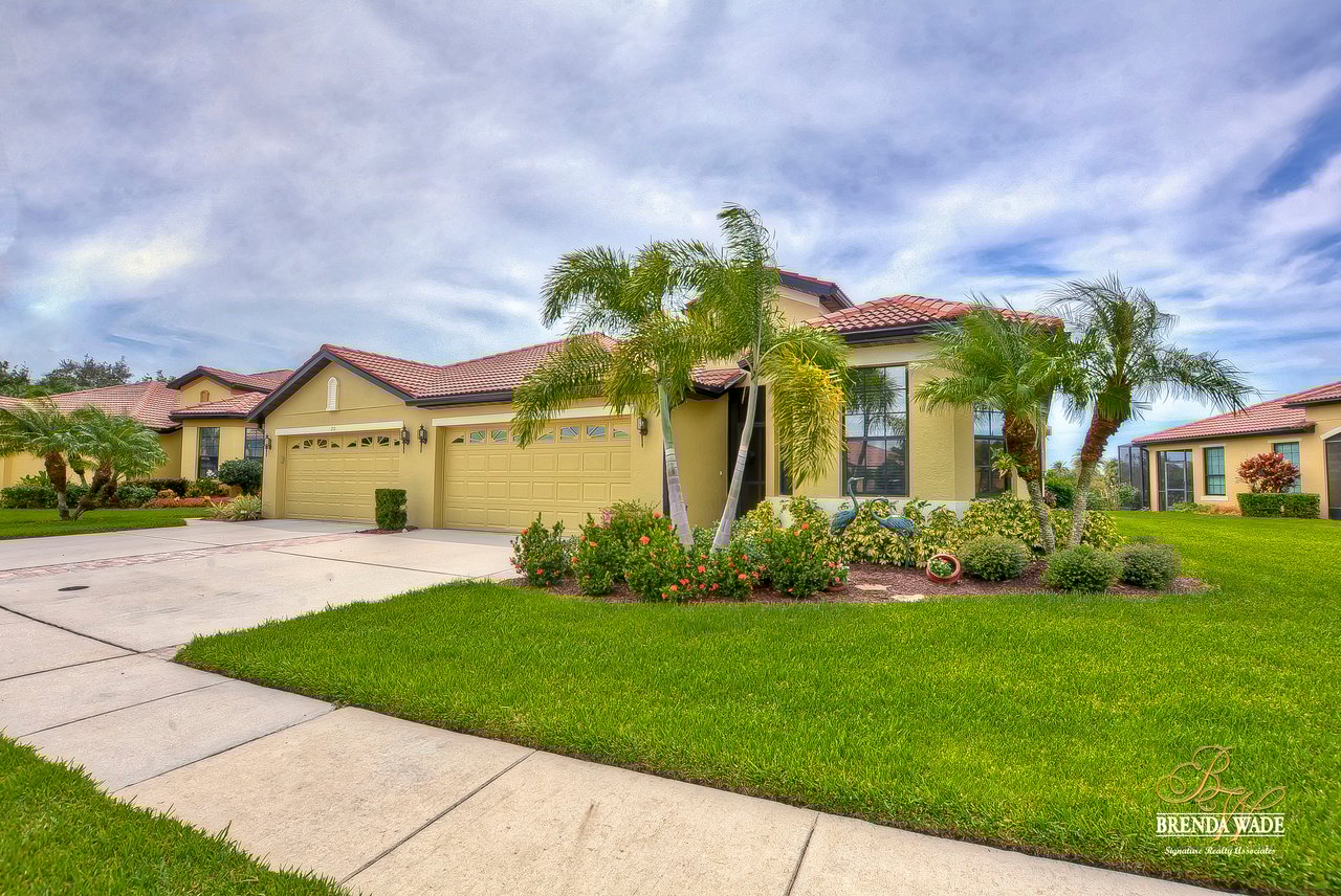 Wow! What a fabulous opportunity to own a home in one of the top 55 plus communities in the county! This beautiful villa offers loads of curb appeal with tile roof and lush landscaping. You will love the cul-de-sac location on a quiet street with no through traffic. Walk through the front door and be impressed with the water views. A perfect open floor plan makes this home feel large and spacious. The separate formal dining room is a great place to entertain. Moving forward is a magnificent kitchen with 42” maple cabinets, granite counters and backsplash and stainless appliances! Open to the kitchen is the great room which is flooded with natural light and features stunning pond views through a triple sliding door to the screened patio with travertine tile. You will love watching the Florida sunsets from here! A secluded master bedroom also has wonderful pond views through oversized window, a Huge walk-in closet and an attached master bathroom! The second bedroom is located on the opposite side of the home, great for privacy! A large den/office area is also tucked away at the front of the home, perfect for working from home or even a bonus room! This home is loaded with upgrades including crown molding, porcelain tile floors, wonderful paint choices and so much more! This community screams luxury with maintenance free living, guard gated access, 14,000 square feet clubhouse, multiple community pools, Fitness Center, Tennis Courts, Pickleball, Putting Green, Bocce Ball Courts, walking trails and multiple social events!