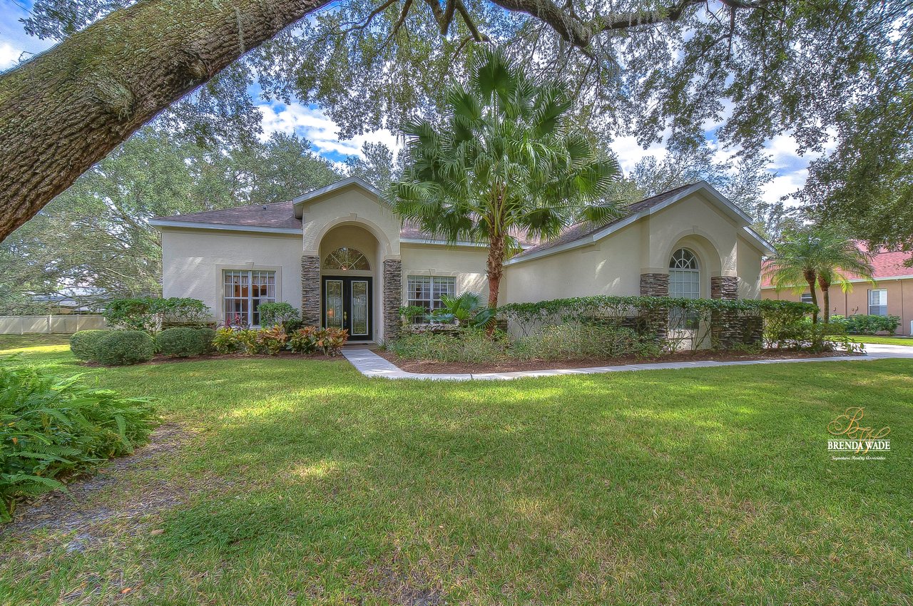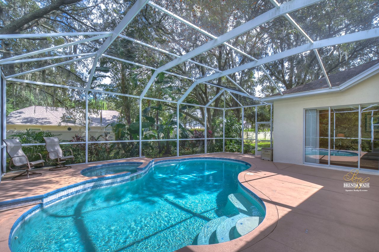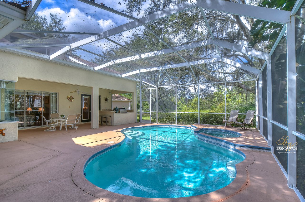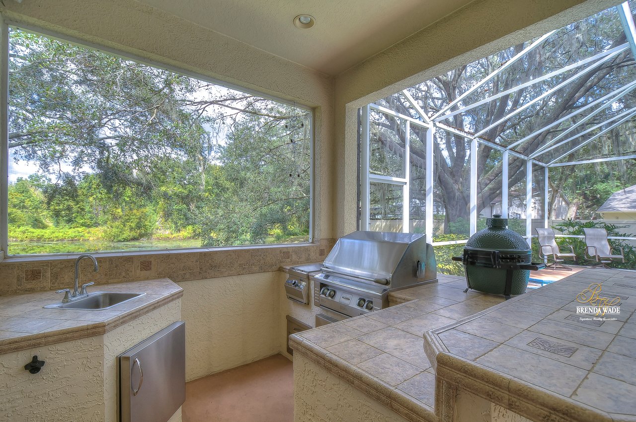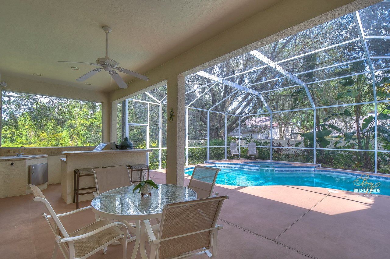 This stunning pool home is located in the highly desirable, gated community of Hickory Woods! From the moment you arrive you will notice there are not many homes as special as this one! NEW ROOF, A/C unit, water heater, and gutters, stacked stone accents, mature lush landscaping, 3-car side entry garage, and sits on .58-acres with pond access! A gorgeous glass double door greets you and you are instantly welcomed by the 10-ft high ceilings, neutral paint, arch entryways, and open design! The formal dining and living room offer a triple slider, engineered hardwood flooring, and so much room for company! The kitchen is quite the treat with 42-in wood cabinets with crown and under cabinet lighting, tile backsplash, extensive breakfast bar seating, wine rack, built-in oven, and walk-in pantry! The breakfast nook has a large corner window overlooking the pool and outdoor oasis! The family room has beautiful engineered hardwood flooring and triple sliders to the screened lanai! The primary bedroom is a true retreat! Featuring a double tray ceiling, French doors to the lanai, his & her walk-in closets, and en-suite bath with separate vanities, large garden tub, and walk-in shower! Two additional spacious bedrooms offer large closet space and share a bath, while a fourth bedroom at the back of the home offers privacy and convenience, with its own private bath that also serves as a pool bath. Upstairs, an oversized bonus room awaits, offering endless possibilities such as a media room, home gym, or game room. It also features a large walk-in storage space and full bath, ensuring you have plenty of room for all your belongings. A spacious office located at the front of the home provides a comfortable and productive workspace or fifth bedroom. The outdoor space of this home is a true showstopper. Take a dip in the beautiful pool or spa and soak up the sun. The outdoor kitchen features a fridge, sink, grill, and cooktop, making it the perfect place to entertainment and relax. The backyard is fenced, offering a safe and secure area for the whole family to enjoy. There is a little stream that leads to the pond next to the home! You have a tranquil view at your fingertips! Don't just take our word for it, come see this beauty for yourself!