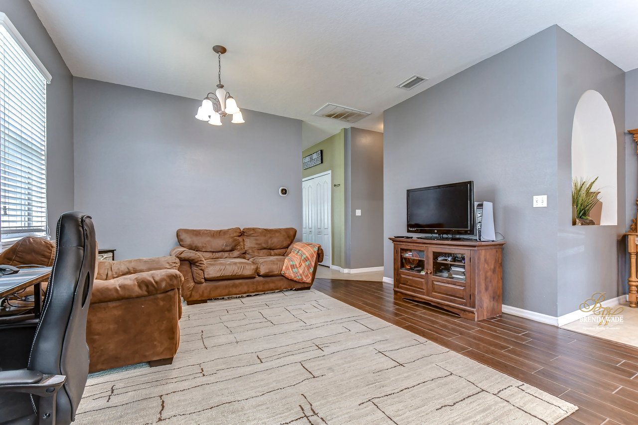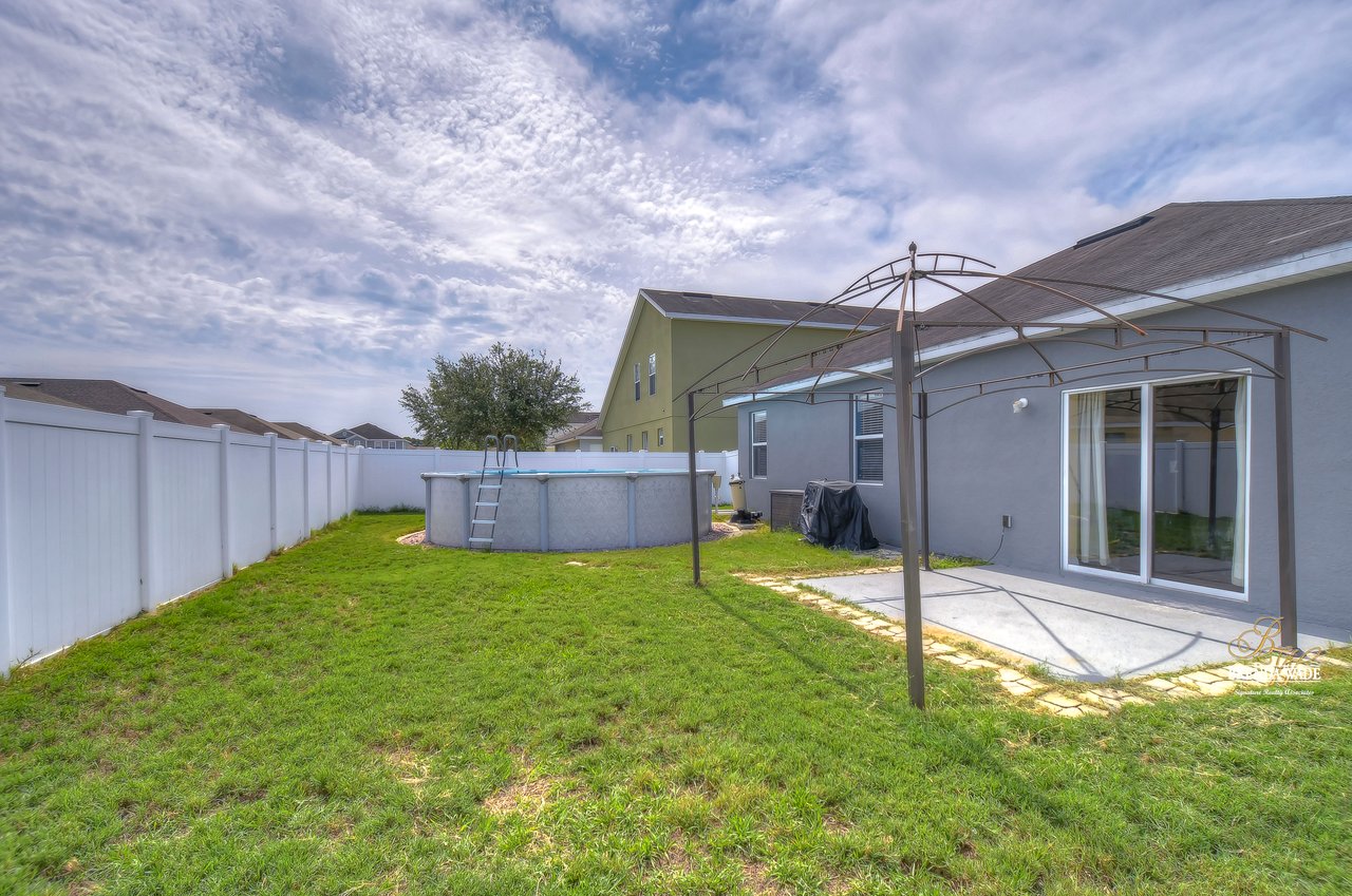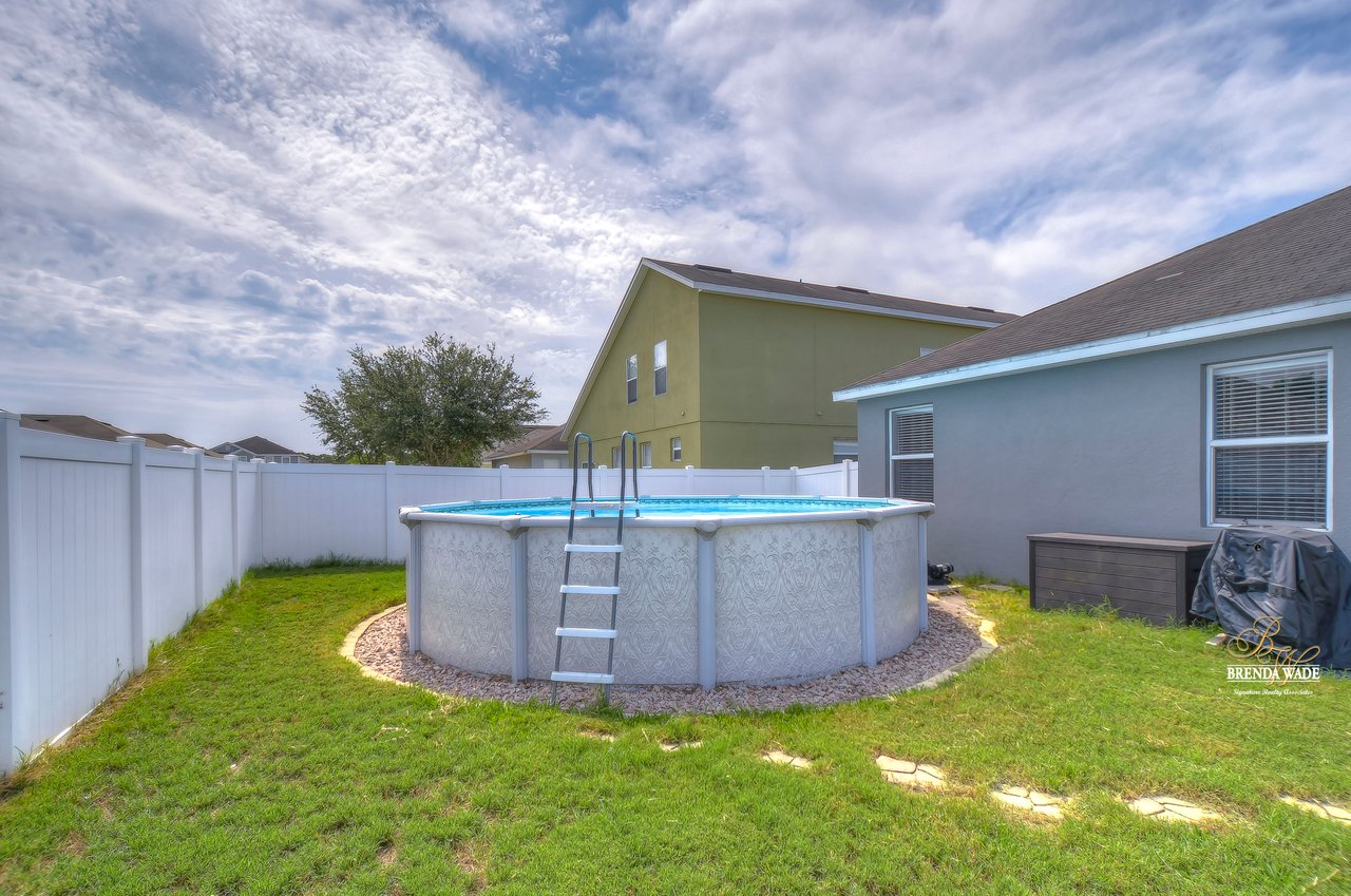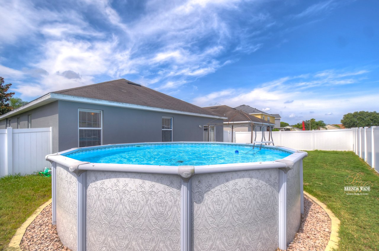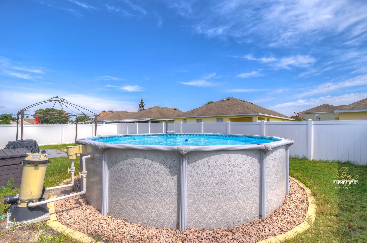 Nestled in the tranquil Magnolia Green neighborhood, lies a beautiful 4-bedroom, 2-bath home that creates a scene of comfort and elegance! Ceramic tile flooring leads throughout this home and neutral paint is perfect for any décor! Living and dining room combo is a versatile space and would be a grand room for memorable gatherings, whether they be extravagant dinners or spirited game nights! The heart of this home lies in the kitchen, which opens to the family room for endless memories! Featuring Corian countertops, wood cabinets, and gleaming ceramic tile flooring! The accompanying eat-in breakfast area is the ideal spot for casual meals and engaging conversations! Seamless integration of indoor and outdoor living can be felt in the family room as it welcomes you to the outdoors via sliders to the patio, where gentle breezes can flow through effortlessly! Retreating to the primary bedroom you can immerse yourself in the tranquility of wood-like ceramic tile flooring, large walk-in closet for clutter-free living, and two windows that allow the natural sunlight to flow through! En-suite bath boasts double sinks for added comfort and convenience to make getting ready a breeze, ceramic tile flooring, walk-in shower, and large soaking tub! Three secondary bedrooms grace their own wing and offer peace and privacy for family and guests! These rooms share a full bath, complete with double sinks and tub/shower combo! Adding an extra layer of safety and security, a fenced backyard encloses this home and offers an 18-foot above-ground swimming pool, perfect for backyard entertainment or refreshing respite from the Florida sun! Backyard also offers lots of room for kids and fur babies alike! Prepare to fall in love with this beautiful home that blends elegance and comfort into one!