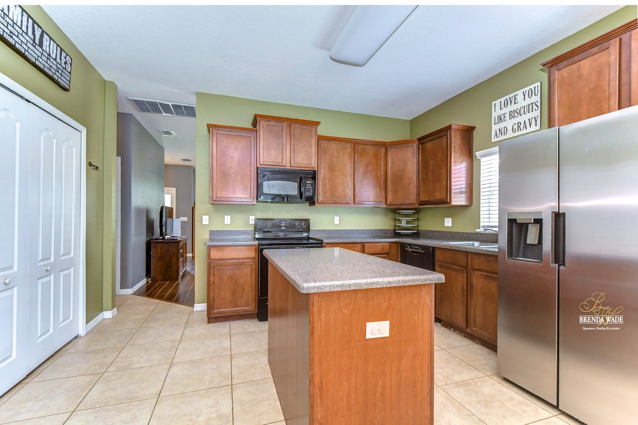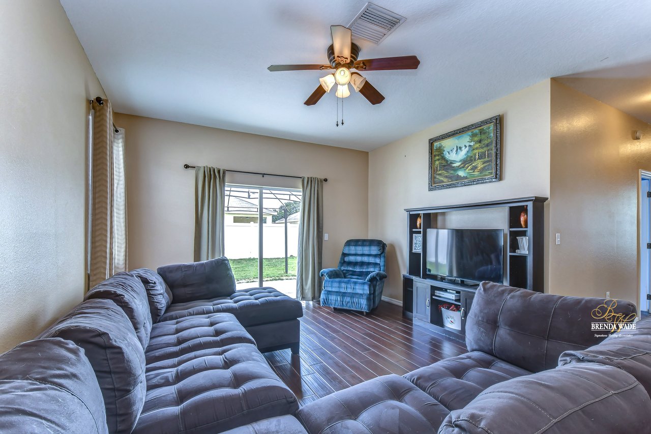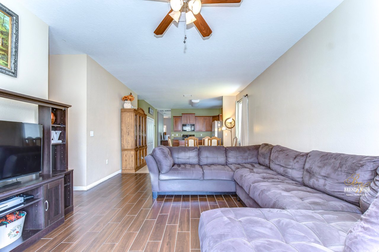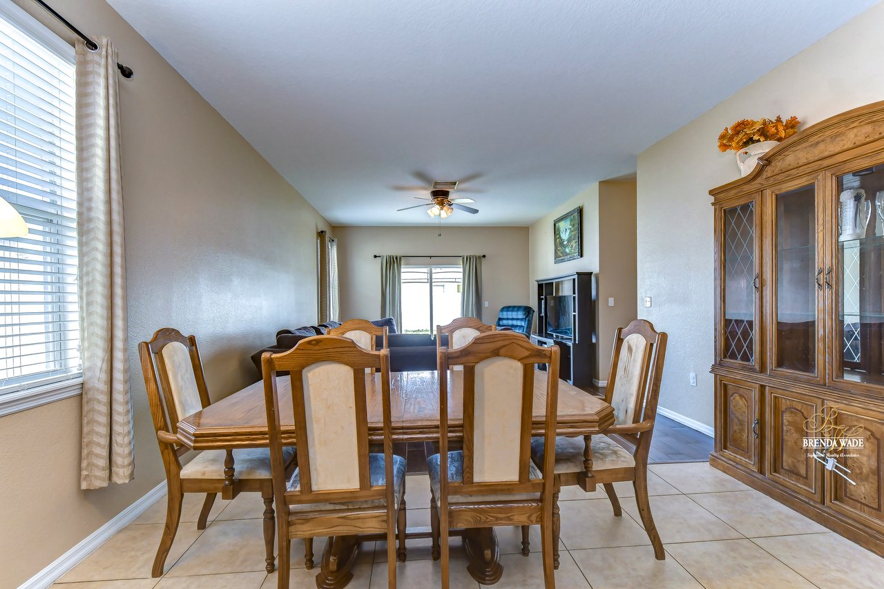 Nestled in the tranquil Magnolia Green neighborhood, lies a beautiful 4-bedroom, 2-bath home that creates a scene of comfort and elegance! Ceramic tile flooring leads throughout this home and neutral paint is perfect for any décor! Living and dining room combo is a versatile space and would be a grand room for memorable gatherings, whether they be extravagant dinners or spirited game nights! The heart of this home lies in the kitchen, which opens to the family room for endless memories! Featuring Corian countertops, wood cabinets, and gleaming ceramic tile flooring! The accompanying eat-in breakfast area is the ideal spot for casual meals and engaging conversations! Seamless integration of indoor and outdoor living can be felt in the family room as it welcomes you to the outdoors via sliders to the patio, where gentle breezes can flow through effortlessly! Retreating to the primary bedroom you can immerse yourself in the tranquility of wood-like ceramic tile flooring, large walk-in closet for clutter-free living, and two windows that allow the natural sunlight to flow through! En-suite bath boasts double sinks for added comfort and convenience to make getting ready a breeze, ceramic tile flooring, walk-in shower, and large soaking tub! Three secondary bedrooms grace their own wing and offer peace and privacy for family and guests! These rooms share a full bath, complete with double sinks and tub/shower combo! Adding an extra layer of safety and security, a fenced backyard encloses this home and offers an 18-foot above-ground swimming pool, perfect for backyard entertainment or refreshing respite from the Florida sun! Backyard also offers lots of room for kids and fur babies alike! Prepare to fall in love with this beautiful home that blends elegance and comfort into one!