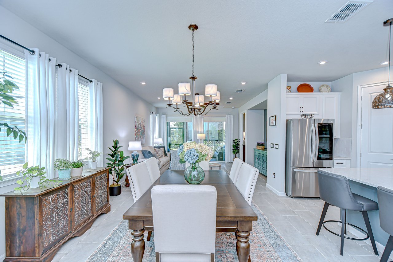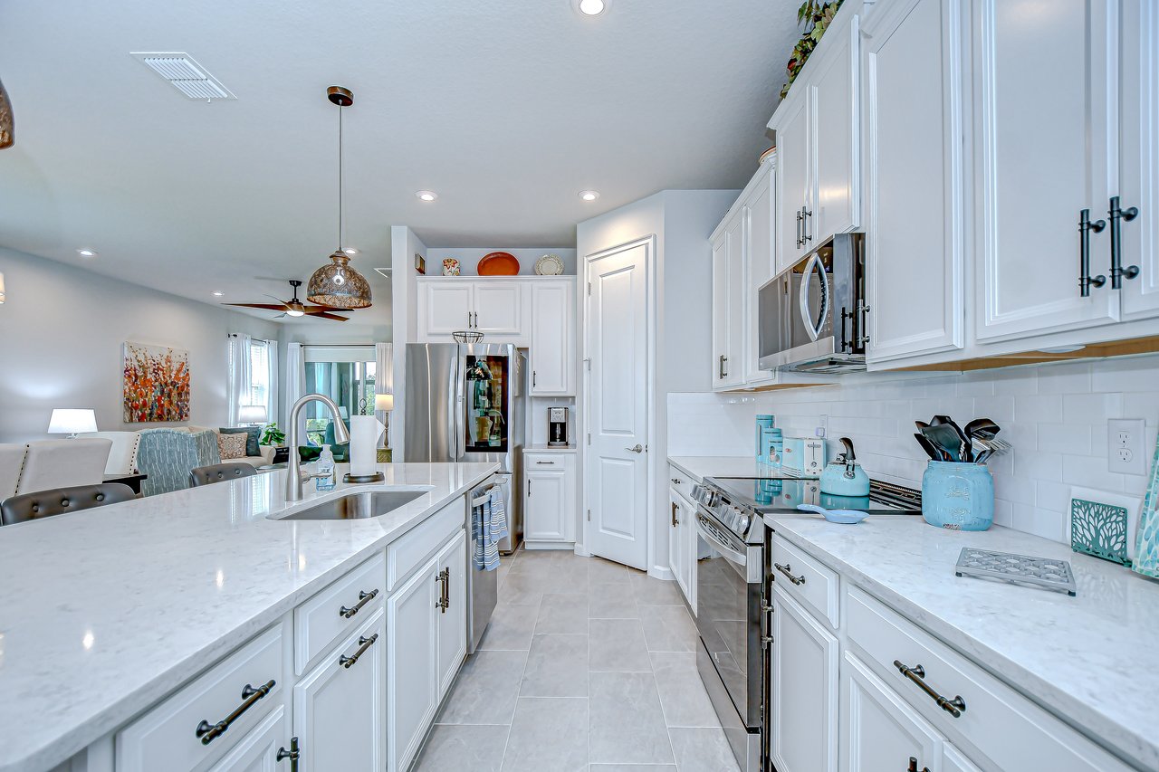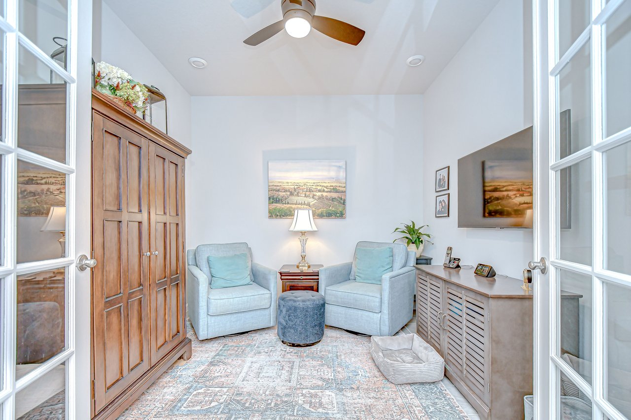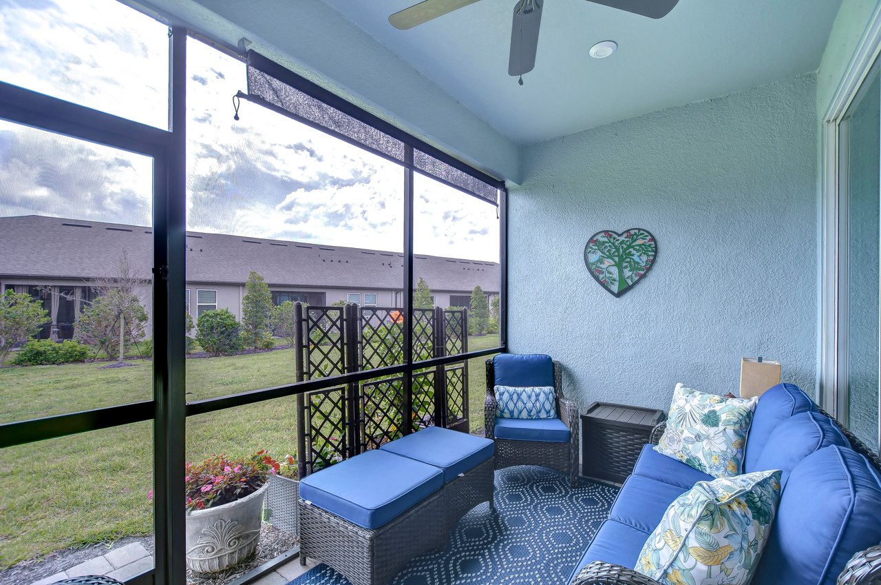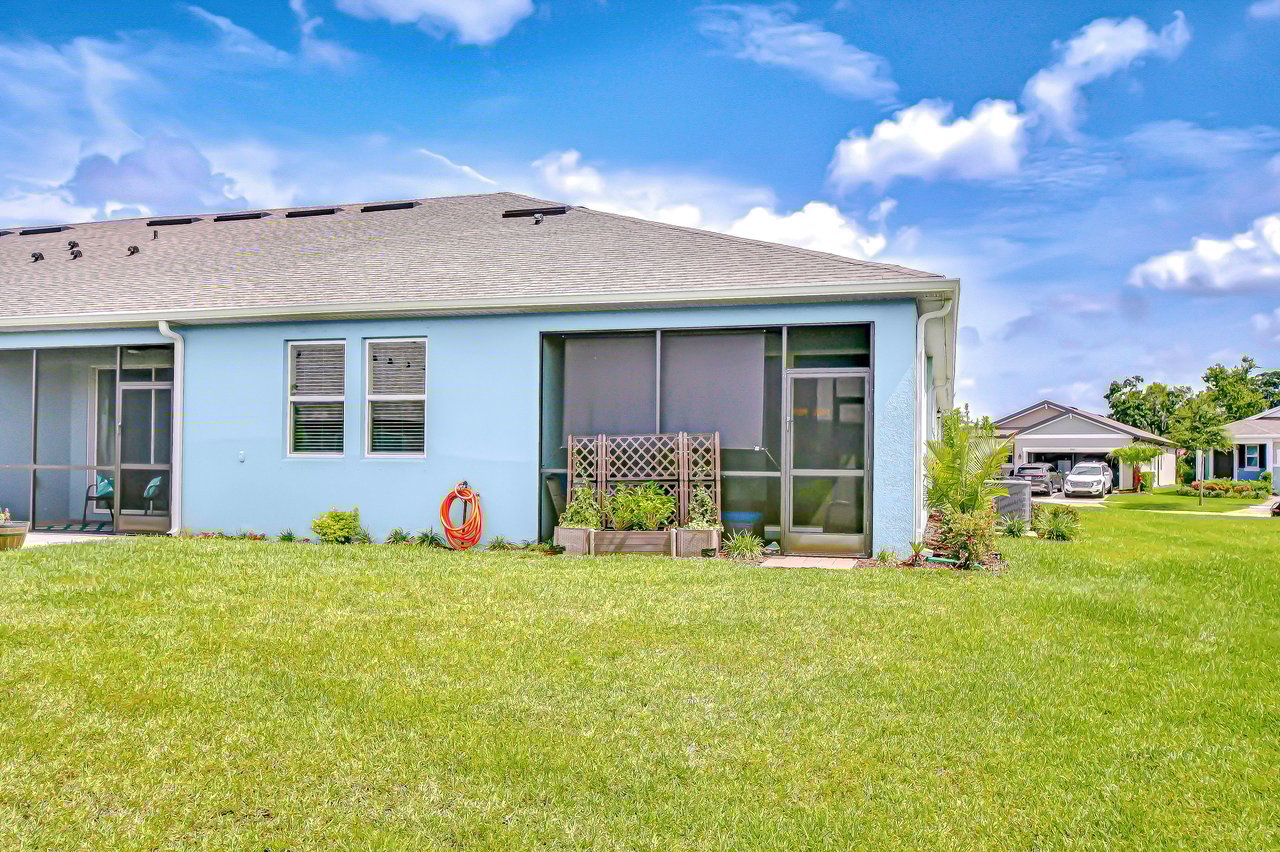 Experience refined living in this luxury villa nestled within Sun City Center's exclusive 55+ gated community, La Paloma Preserve. You're going to LOVE this 2023-built Mattamy home with 3 bedrooms and 2 bathrooms, offering comfort, luxury, and sophistication. The villa's prime location provides access to an active 55+ lifestyle with amenities like a beautiful community pool just a short stroll away, a pickleball court, and a nearby golf course. Enjoy the convenience of a low monthly HOA fee that includes exterior maintenance, lawn care, scheduled exterior painting, and even future roof replacement through the community's reserve fund--providing exceptional value and peace of mind. This rare end unit boasts a large side yard, tropical landscaping, and a brick paver driveway. Inside, the impeccable design features a split floor plan with a bonus den graced with glass French doors, tray ceiling, high ceilings throughout, 8-foot interior doors, and a remote controlled shade over the great room triple slider, creating an open atmosphere complemented by luxurious upgrades. Premium fixtures, state-of-the-art appliances, and fresh interior paint enhance the inviting ambiance, while the expansive yard offers outdoor relaxation and entertainment. The chef's kitchen features upgraded appliances and custom pull-out drawers for added storage and organization. The open floor plan allows all the main level areas to be in close proximity to each other, all while not losing out on ample space. The den is the perfect space for a media or game room, gym, or home office. The primary suite features large windows, and a spa-like en-suite with a large shower, a huge walk-in closet, and a dual sink vanity. The screened patio provides a private retreat for alfresco dining or unwinding in the Florida breeze. Ample storage solutions and a whole-house water filtration system and water softener add to the property's appeal. Ready for immediate enjoyment, this turnkey villa invites you to experience elevated living in one of Florida's most sought-after destinations. Don't miss the opportunity to make this property your own and embark on a new chapter of luxurious living in paradise.
