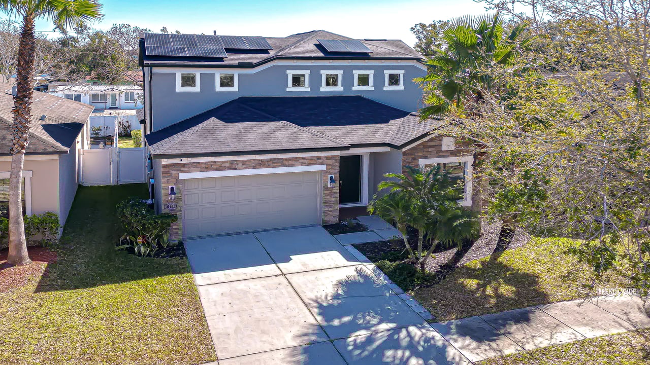 Welcome to Camden Woods, a charming and family-friendly Tampa community where quiet streets, beautiful homes, and everyday convenience come together. Ideally located with easy access to US-301 and I-75, this neighborhood offers a seamless commute while keeping you close to top-rated schools, parks, shopping, and dining. This one-of-a-kind home stands out from the rest, blending thoughtful upgrades with modern efficiency and exceptional curb appeal. Beautiful stacked stone accents and lush tropical landscaping create stunning curb appeal and a warm welcome. This smart home is thoughtfully equipped with keyless entry, geo-tracking capabilities, closed-circuit security cameras, and more--offering modern comfort and peace of mind. Major updates provide incredible value, including solar panels installed in 2021 (keeping electric bills under $20 per month), a new AC unit (2024), a brand-new roof (2025) with transferable warranty, and a new water heater for added peace of mind. The home is Energy Star rated and also features newer stainless appliances and a freshly repainted exterior. Inside, a versatile flex space at the front of the home makes the perfect private office, formal sitting room, or playroom. The spacious family room flows seamlessly into the kitchen and dinette area, creating an ideal layout for both everyday living and entertaining. The kitchen is beautifully appointed with 42" upper cabinets with crown molding, granite countertops, newer stainless appliances, a center island with bar seating, and pantry. Conveniently located on the main level, the primary suite offers a tray ceiling, a private en-suite bath, and a HUGE walk-in closet. Upstairs, you'll find a massive loft with brand-new, beautiful wood laminate flooring that continues down the staircase, creating a cohesive and modern feel. The loft also features two storage closets--perfect as a second living area, media room, or game space--along with three generously sized secondary bedrooms that share a full bath. Step outside to enjoy the spacious backyard featuring an extended paver patio, ideal for relaxing, entertaining, or enjoying Florida's beautiful weather year-round. This truly exceptional home blends smart technology, energy efficiency, stylish upgrades, and thoughtful improvements in a prime Tampa location--don't miss your opportunity to make it yours.