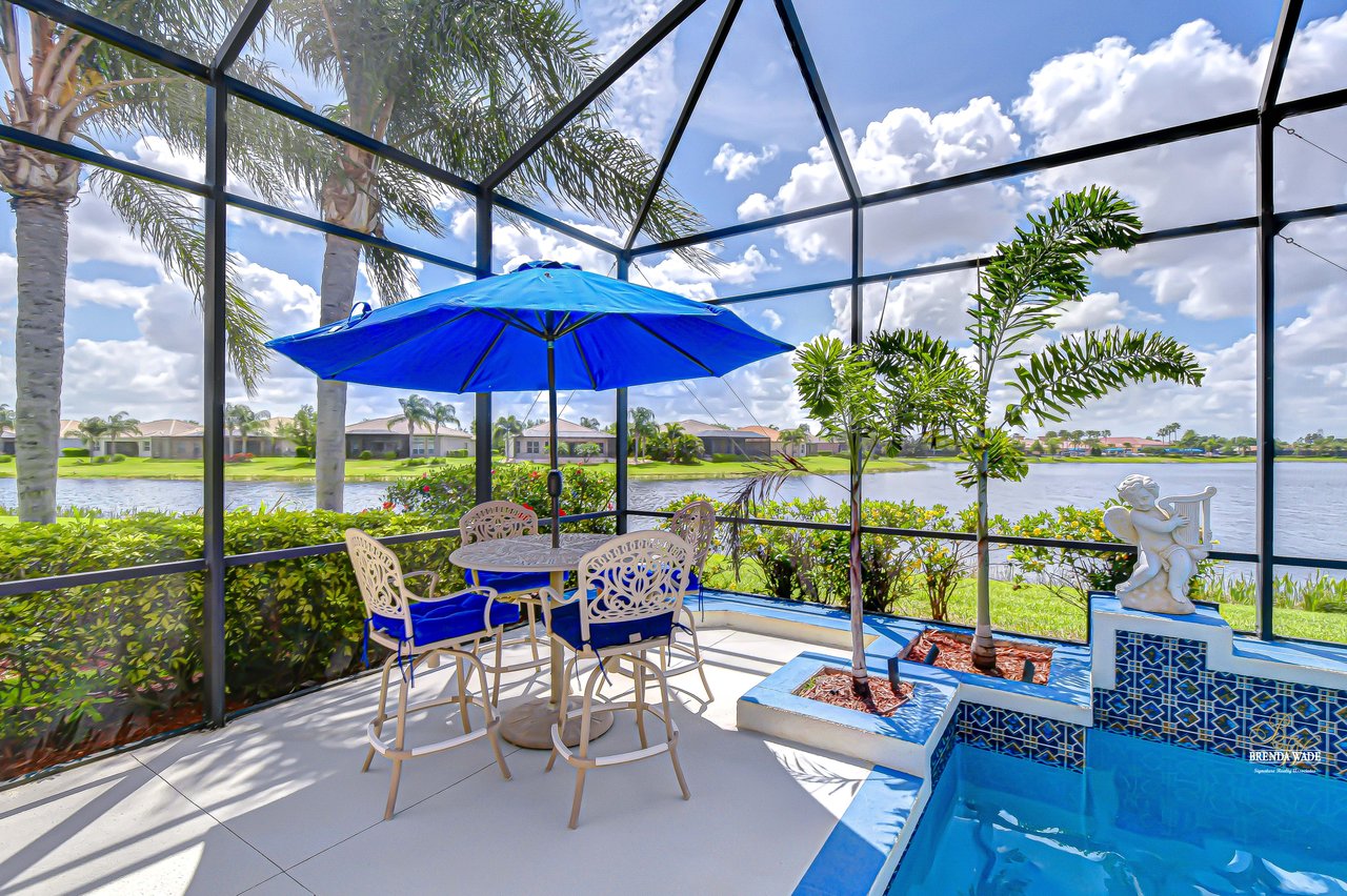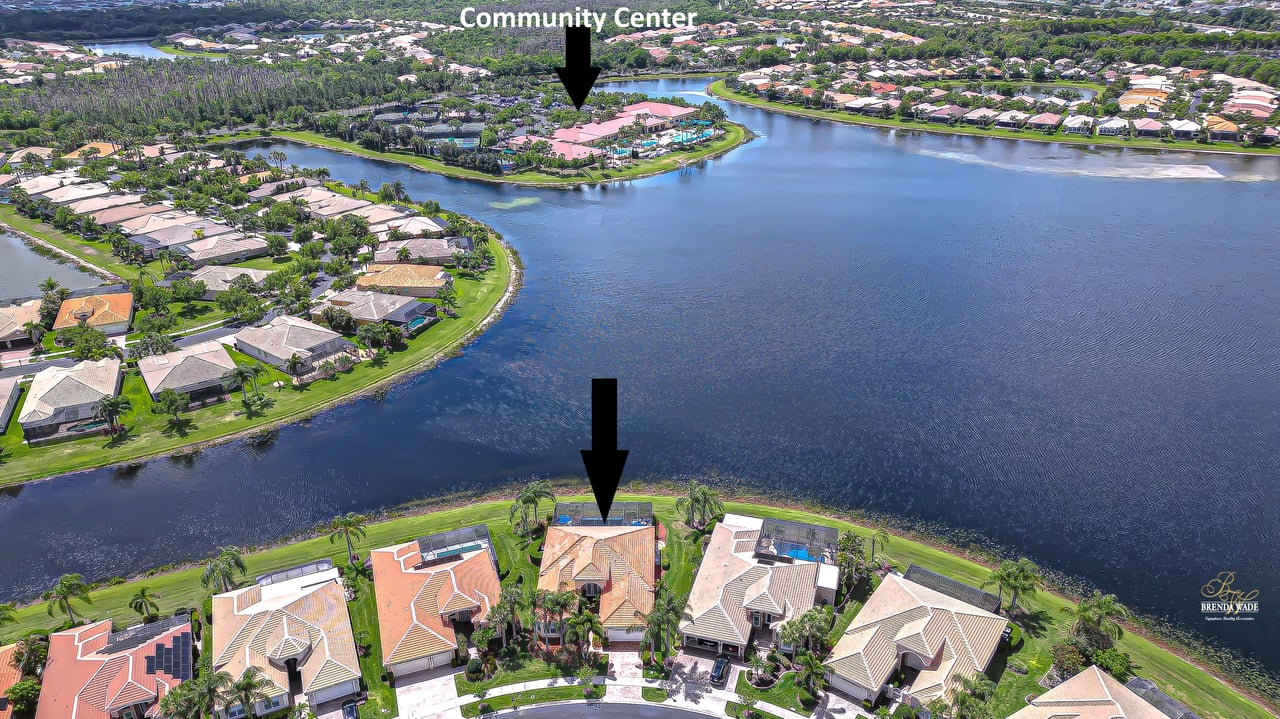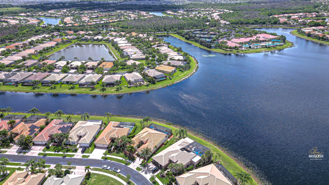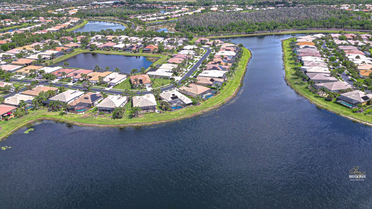Welcome to resort-style living in the highly sought-after Valencia Lakes--a premier gated 55+ community known for its vibrant lifestyle and exceptional amenities. Perfectly positioned on a rare pie-shaped, south-facing waterfront lot, this home offers breathtaking lake views while overlooking the community center. The unique orientation provides the best of both worlds--sun-drenched pool and lanai areas all day, while the home itself stays naturally cooler with minimal direct sun exposure. From the moment you arrive, you'll appreciate the beautiful tile roof, pavered driveway, and inviting tropical courtyard entry that sets the tone for what's inside. Step through the front door and your eyes are immediately drawn to the expansive water views and the stunning lanai featuring a sport-style pool, creating the ultimate indoor-outdoor Florida lifestyle. This thoughtfully designed 2-bedroom, 2.5-bath + den residence offers a split floor plan that ensures privacy for both owners and guests, while the open-concept layout is ideal for entertaining. The home is enhanced with high-end finishes throughout, including triple tray ceilings, crown molding, upgraded lighting, and custom built-ins. At the heart of the home is the spacious kitchen, seamlessly connecting to the formal dining and great room. Features include upgraded cabinetry with custom pull-out drawers, built-in double oven, and a bright breakfast nook with serene lake views--the perfect place to start your day. Step outside to the lanai where a propane grill hookup makes outdoor cooking effortless. The private primary suite is tucked away for maximum tranquility and showcases stunning lake views, direct lanai access, and dual custom walk-in closets. The en-suite bath is generously sized with separate vanities, a dedicated makeup vanity, and full-length mirrors spanning the wall. On the opposite side of the home, the guest suite offers its own en-suite bath, providing comfort and privacy for visitors. The versatile den is ideal as a home office, fitness room, or optional third bedroom. The community center also features a wonderful on-site cafe offering breakfast, lunch, and dinner, along with special menus for holidays and events, adding to the ease and enjoyment of everyday living. Valencia Lakes isn't just a community--it's a lifestyle. Enjoy a 40-acre waterfront recreation area, resort-style pools, a 40,000 sq. ft. clubhouse, tennis and pickleball courts, bocce, basketball, a fully equipped fitness center, dog park, baseball field, community garden, and RV/boat storage. Over 100 acres of nature preserves provide peaceful views, abundant wildlife, and a true sense of serenity. With hundreds of clubs and activities, friendly neighbors, and convenient access to Tampa, St. Petersburg, Sarasota, shopping, golf, and the airport, this home offers both comfort and convenience. This is more than just a home--it's a premium lot, exceptional orientation, and lifestyle opportunity in one of the area's most desirable communities.