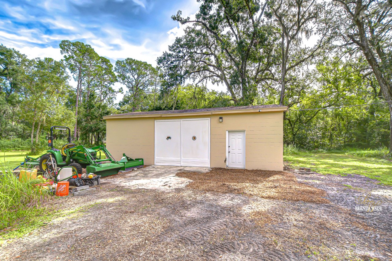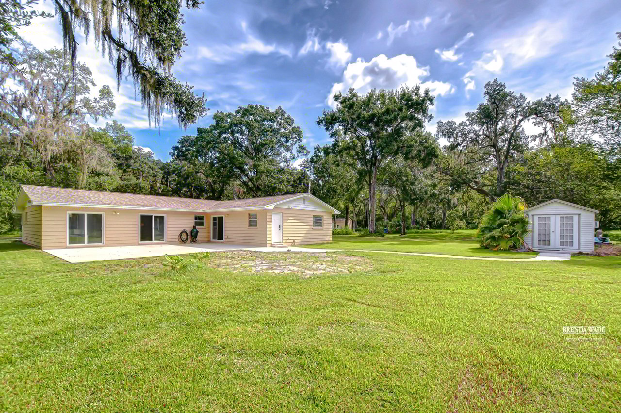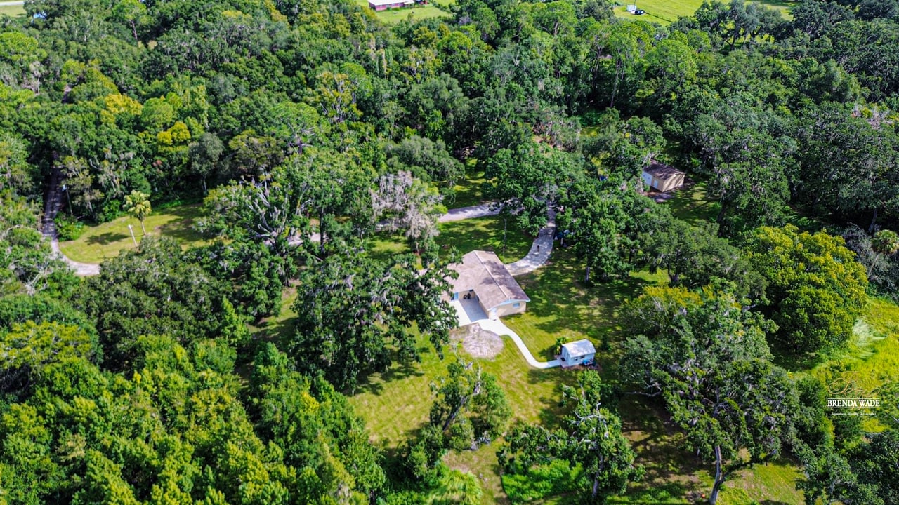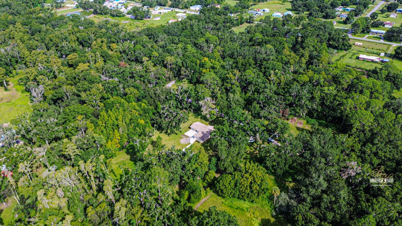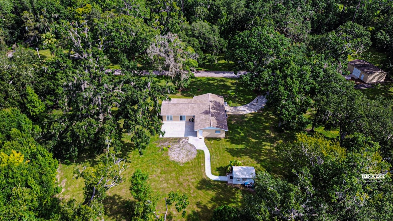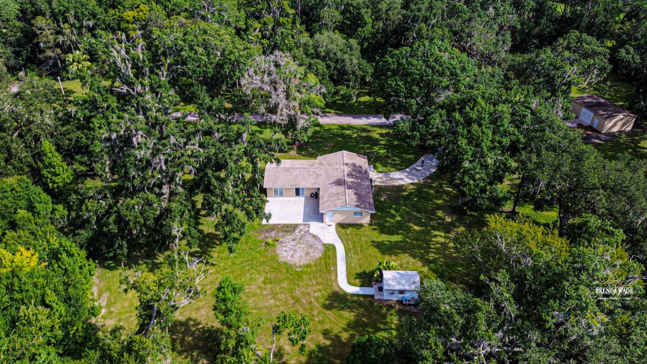 Discover the perfect balance of peace and convenience with this one-of-a-kind property! Nestled on 5.43 acres of stunning land, this home offers the tranquility of country living while keeping you just minutes from major highways, shopping centers, and everyday essentials. This exceptional property is framed by towering oak trees, including a magnificent centuries-old oak that greets you at the entrance--a living landmark that sets the tone for the peace and history found here. Inside, the home shines with brand-new porcelain tile floors (2025) throughout and a designer-updated kitchen boasting black stainless appliances, generous counter space, and plenty of storage. The formal dining room is spacious and inviting, with sliding glass doors that open to tranquil backyard views. The primary suite offers a peaceful escape with its en-suite bath and large walk-in closet, while two additional bedrooms and a full bath sit privately on the opposite side of the home. Recent updates provide comfort and peace of mind: the A/C units for both the home and mancave were replaced in 2025, along with the water heater (2025), ensuring efficient, worry-free living. Outside, the property is full of surprises. The insulated "man cave" workshop is fully equipped with new AC (2025), a dehumidifier, abundant storage, and workspace, plus a double-door entry measuring 9 ft tall by 10 ft wide--perfect for projects big or small. A cozy "she shed" offers another private escape, while the expansive outdoor patio is the perfect place to relax and take in the sights and sounds of nature. Deer, wild turkey, and owls often wander the property, adding to its serene charm. And the best part? No HOA! With 5.43 acres of usable land, you're free to bring your RV, horses, toys, and animals. A 1hp submersible well pump ensures you'll always have more than enough water--truly, "enough to service a small village." You'll also find many old-growth camphor trees, long leaf pines, camphor, cypress, and native (wild) FL orange trees, and an abundance of large shade trees, which not only add beauty and character but also naturally help keep mosquitoes at bay. This property is a rare find--a home, a retreat, and a piece of history all in one. Here, every oak and camphor tree has a story, and now it's ready to be part of yours.