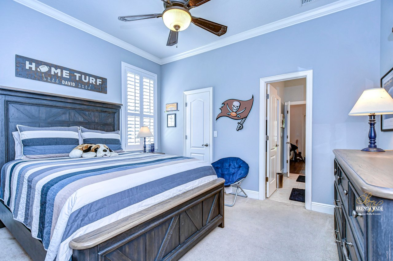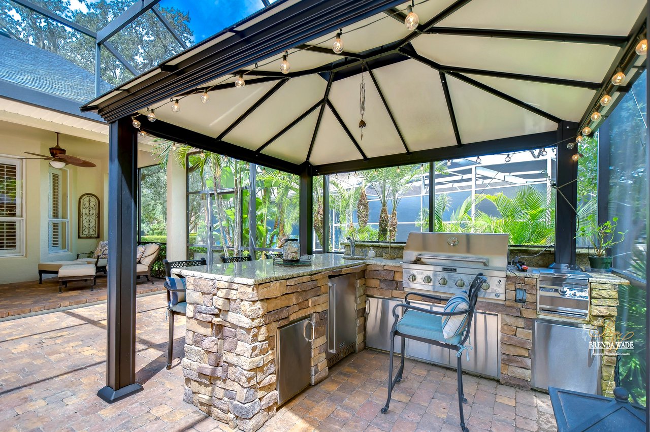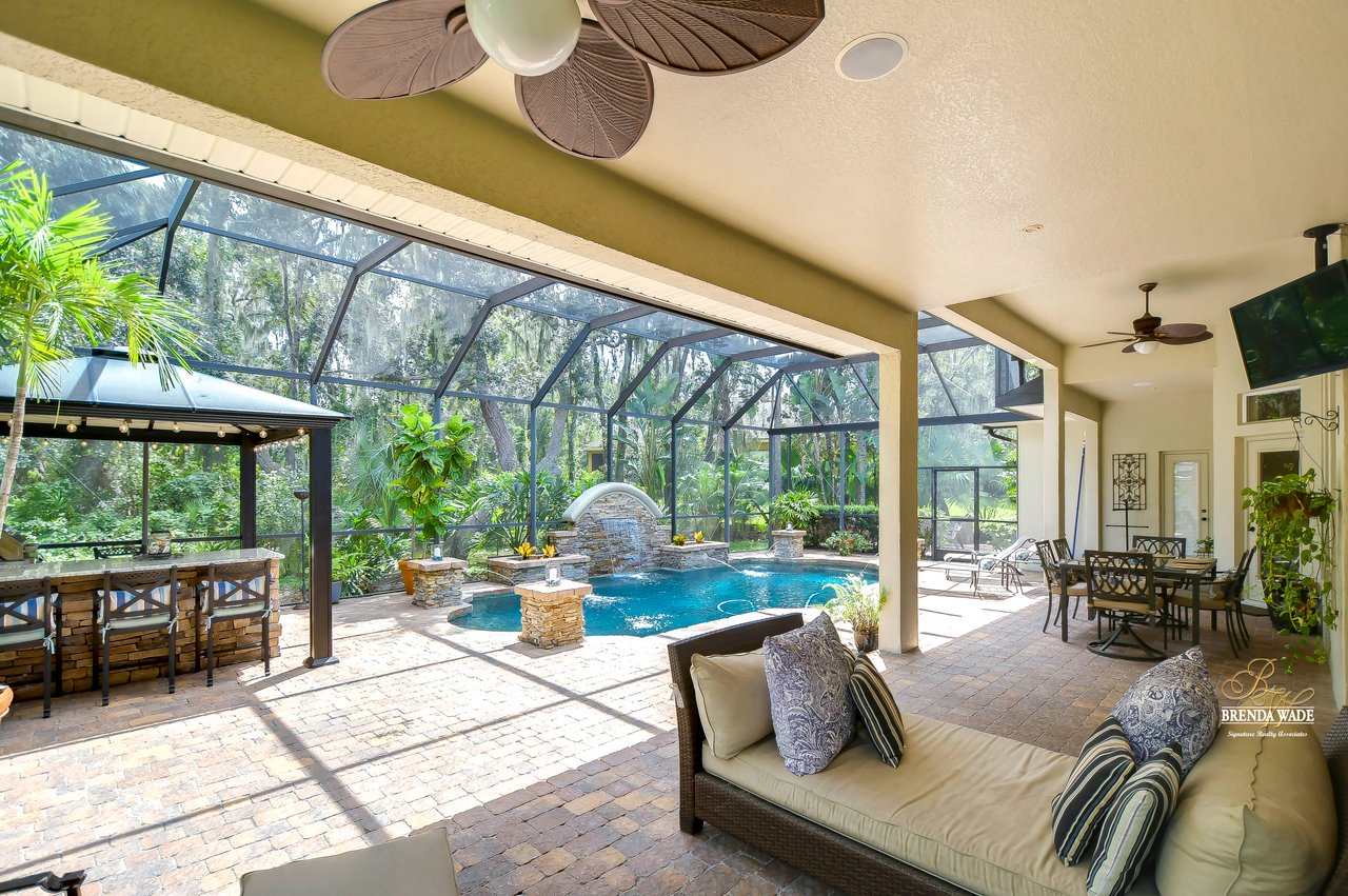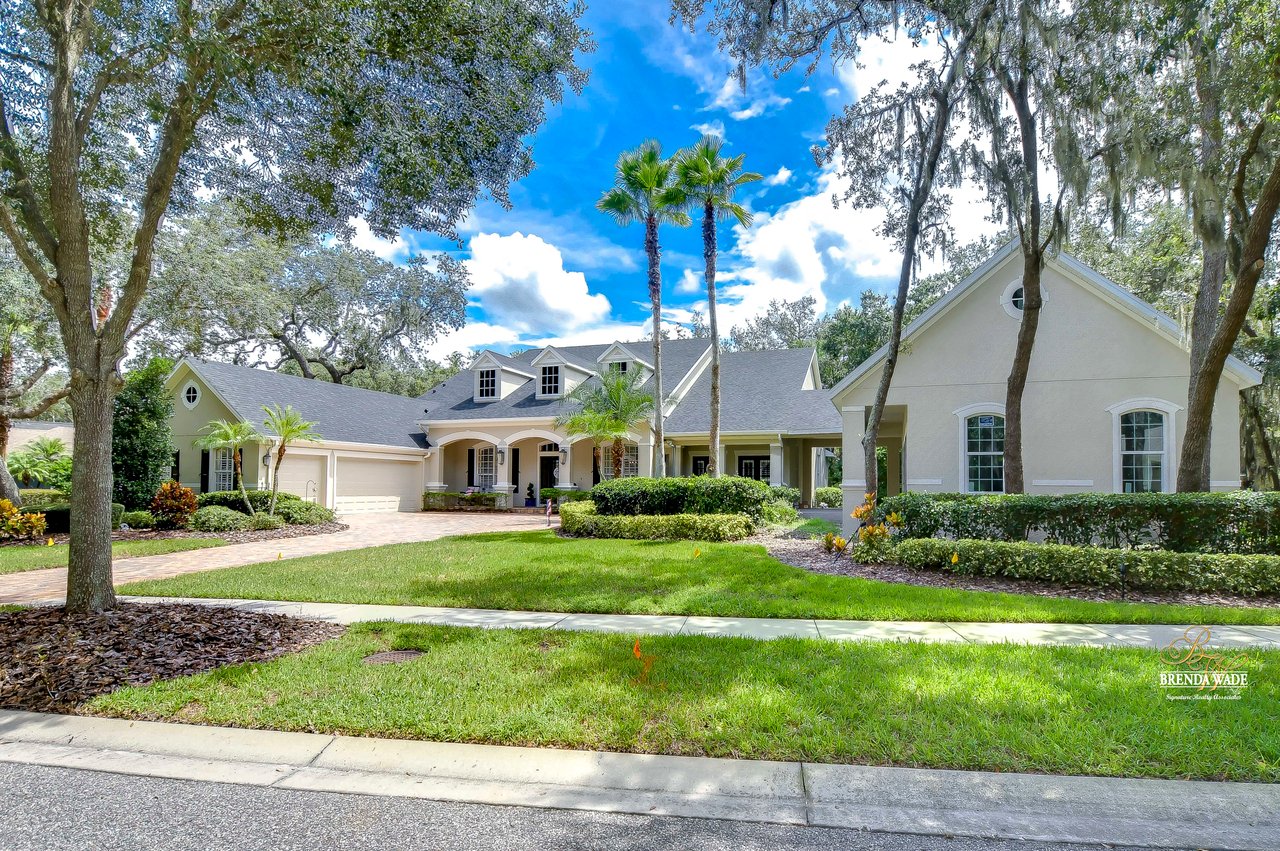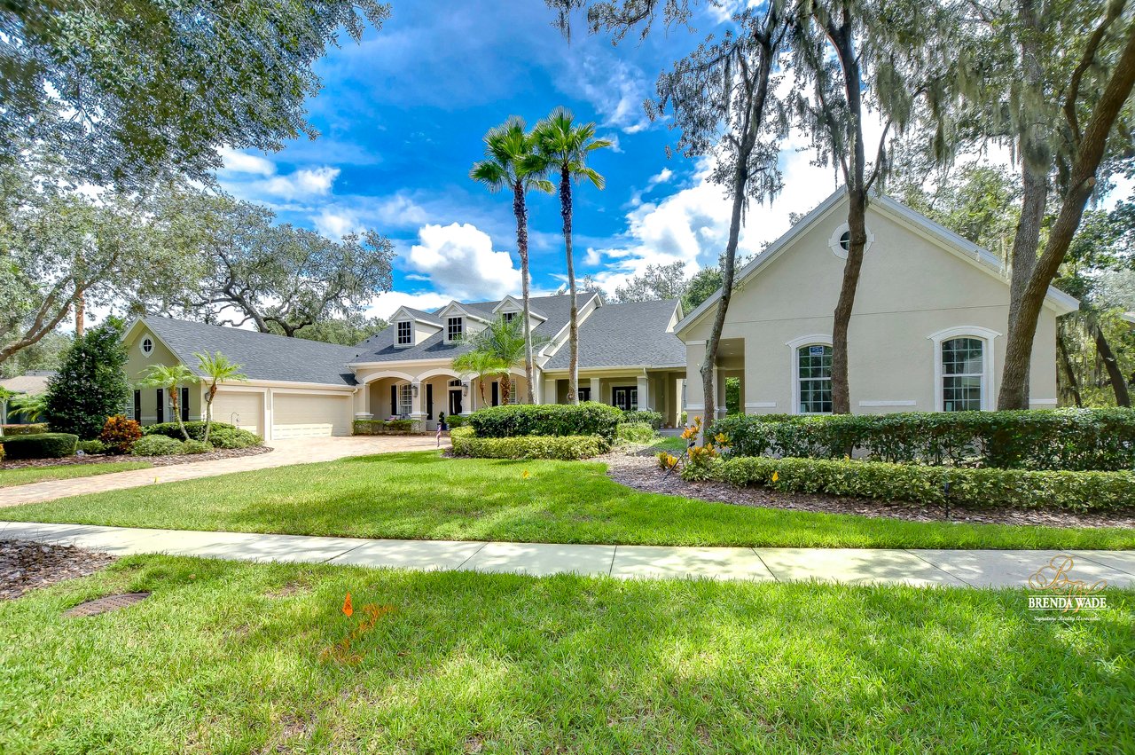 You do not want to miss out on this FANTASTIC opportunity! This home has been well maintained, and updated, and now ready for you to call it yours! Located in the highly desirable Gated Tern Wood Fishhawk Ranch community, this home is zoned for some of the BEST schools in the county! You will fall head over heels from the moment you arrive! The picture-perfect curb appeal features manicured landscaping, a glass front door with matching sidelights, decorative shutters, pavered drive, and a beautiful front porch! This home features a newer roof (2023), two updated AC units (one replaced this year), fresh interior & exterior paint, a central vacuum system, a tankless water heater, and a detached in-law suite complete with a full kitchen and bath. The grand and extended front porch welcomes you, setting the tone for the elegance that awaits inside. Step through the foyer into a world of refined details, where soaring ceilings and impeccable finishes abound. The home features crown molding in every room, stunning custom trim work, and plantation shutters. To your left, beautiful glass French doors open to an expansive office space, perfect for working from home. Adjacent is a spacious formal dining room, complete with a built-in, custom pass-through hutch for effortless entertaining. Take a few more steps to discover the stunning kitchen offering a massive granite peninsula, 42" maple cabinetry with dentil crown molding, a built-in ice maker, a warming drawer, and a large island with a gas cooktop - a chef's dream come true. The great room dazzles with an elegant coffered ceiling, a limestone mantle fireplace, and breathtaking views of the pool and conservation area. The primary suite is a private sanctuary, offering two oversized custom walk-in closets and a luxurious, en-suite featuring a seamless glass shower, travertine tile, jetted tub, and split vanities with extra storage. Two additional bedrooms on the opposite of the home sit off the bonus room. A fourth bedroom located at the front of the home features stunning double French doors to the patio- The view is beautiful! The home also includes a detached 800 SqFt in-law suite/guest house with a full kitchen, sitting area, two bathrooms, washer & dryer hook-up, private entrance, and porch- it's stunning! Step outside the main house to the expansive lanai, designed with entertaining in mind. It features durable Belgard pavers, both sun-soaked and shaded areas, and a fully equipped outdoor kitchen. The heated pool, complete with captivating water features, promises endless enjoyment. This grand home is filled with luxurious features and thoughtful conveniences, too many to list! This community is one-of-a-kind with resort-style pools at the aquatic center, miles of trails, a skate park, a fitness center, park square, and zoned for the TOP schools in Hillsborough County! Schedule your private tour today and discover this remarkable property before it's gone!