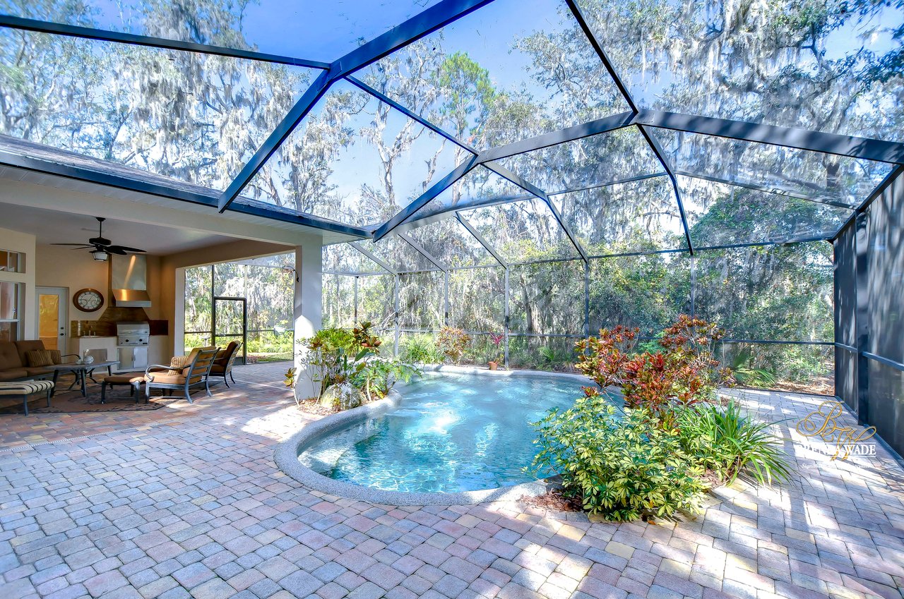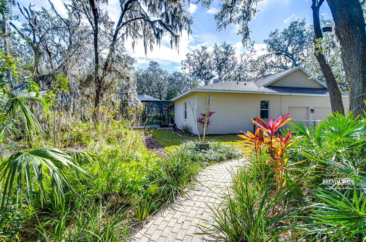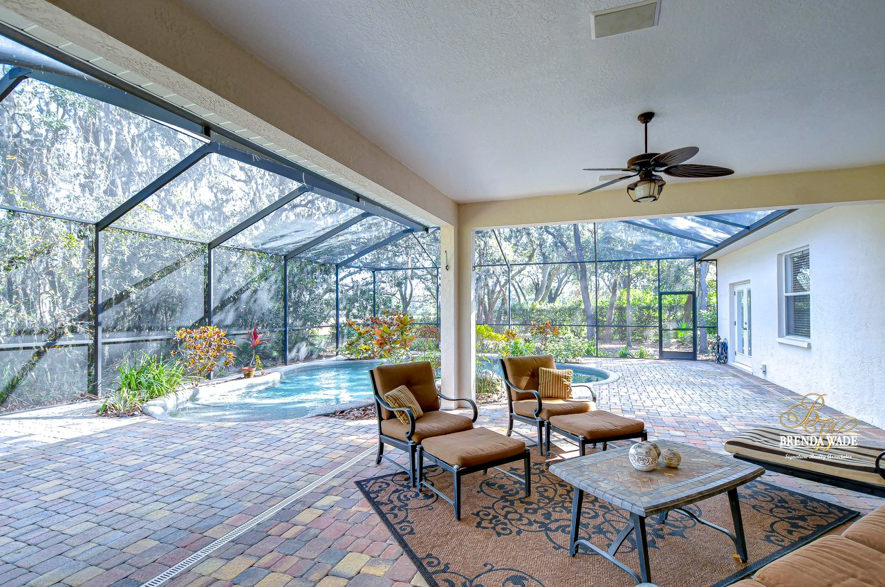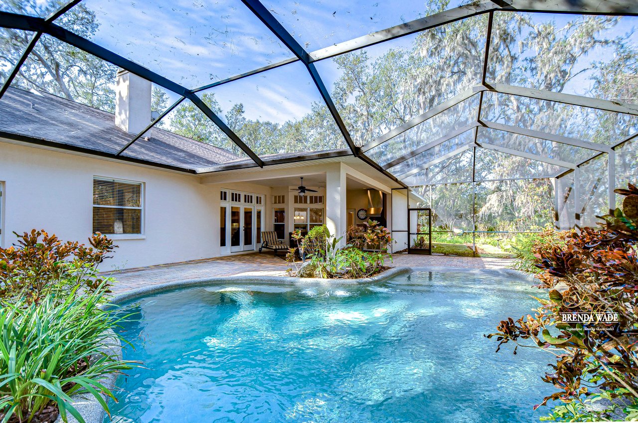 One or more photo(s) has been virtually staged. Welcome to Your Dream Home in Fish Hawk Trails! Nestled on an oversized pie-shaped lot in the highly desirable Fish Hawk Trails community, this exquisite home offers a perfect blend of elegance, privacy, and modern convenience. With a low-maintenance, private wooded lot, this property provides a true retreat. Step inside to a grand foyer that opens to the formal dining room and a versatile flex space adorned with custom barn doors and built-ins, perfect for a home office, playroom, music room, or formal living area. Beautiful crown molding graces every room, adding timeless sophistication throughout the home. The spacious great room is an entertainer's dream, featuring built-ins, a wood-burning fireplace, and surround sound, all while offering breathtaking views of the backyard oasis and pond-style heated saltwater pool. The adjacent kitchen, showcases gorgeous granite countertops, rich wood cabinetry, bar seating, a butler's pantry, and an expansive sunlit breakfast nook. Retreat to the luxurious primary suite, where private lanai access, a custom double-entry walk-in closet with built-in organization, and a foundation-embedded safe create the ultimate sanctuary. The en-suite bath offers a double vanity, soaking tub, and stunning walk-in shower. Two additional generously sized bedrooms on the opposite side of the home share a full bath, which conveniently doubles as a pool bath. A fourth bedroom near the primary suite makes for a perfect guest retreat with easy access to a third full bath. The expansive extended lanai is built for both relaxation and entertainment, featuring a built-in grill, which is ideal for hosting BBQs. The heated saltwater pool is surrounded by lush tropical landscaping within the lanai. Major upgrades include a brand-new pool cage (2023) and a pool heater (2024), ensuring years of enjoyment. Beyond the lanai, a sprawling fenced yard offers plenty of space to unwind, making this home a nature lover's paradise. Designed with convenience in mind, this home also features custom shelving and storage racks in the garage for ultimate organization. Don't miss this rare opportunity to own a private, low-maintenance retreat in Fish Hawk Trails.
