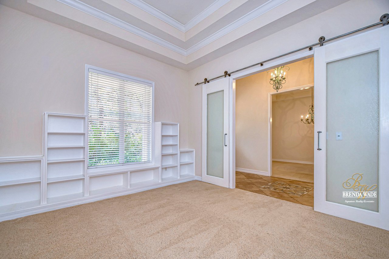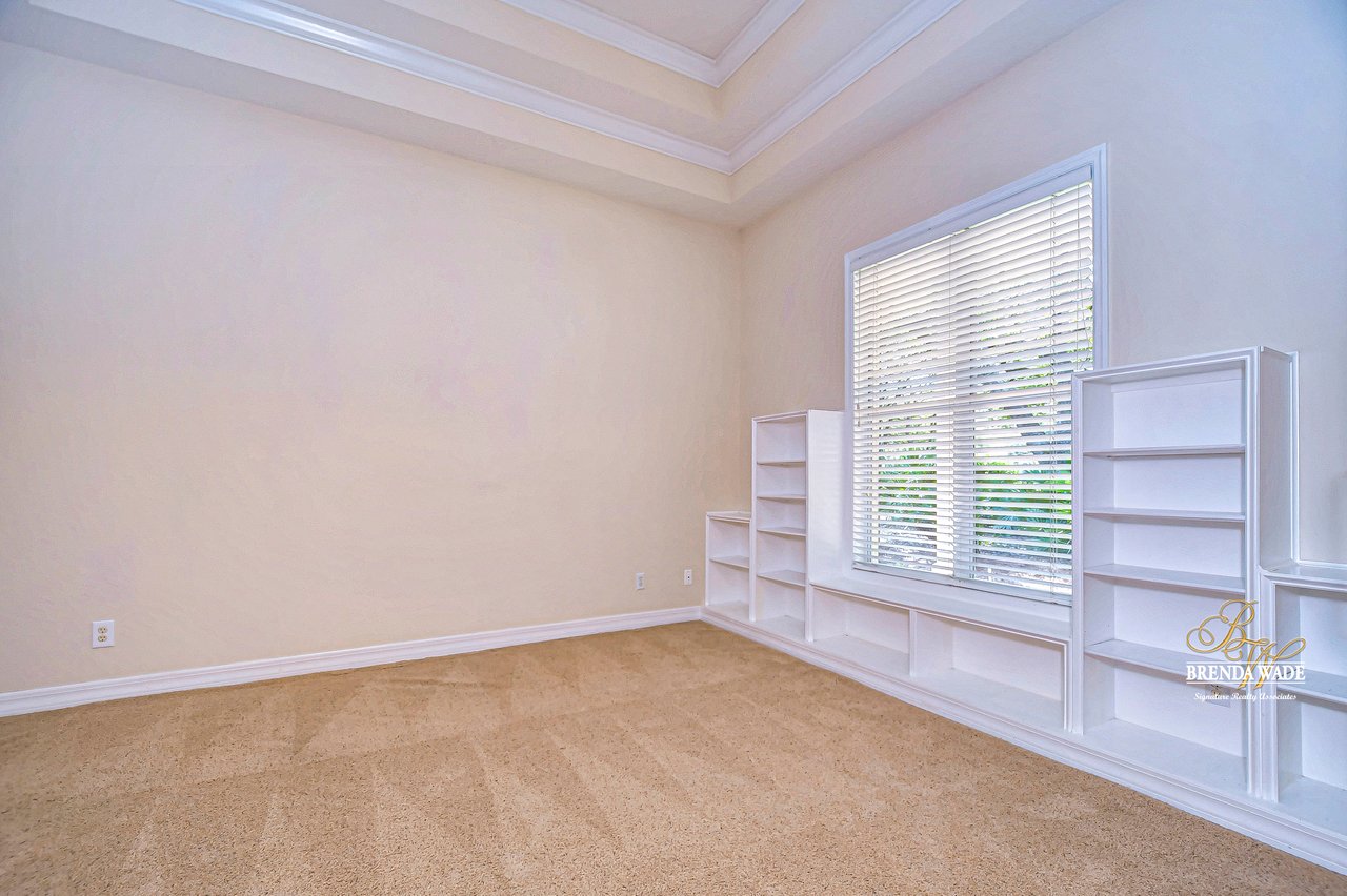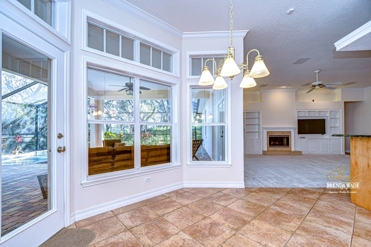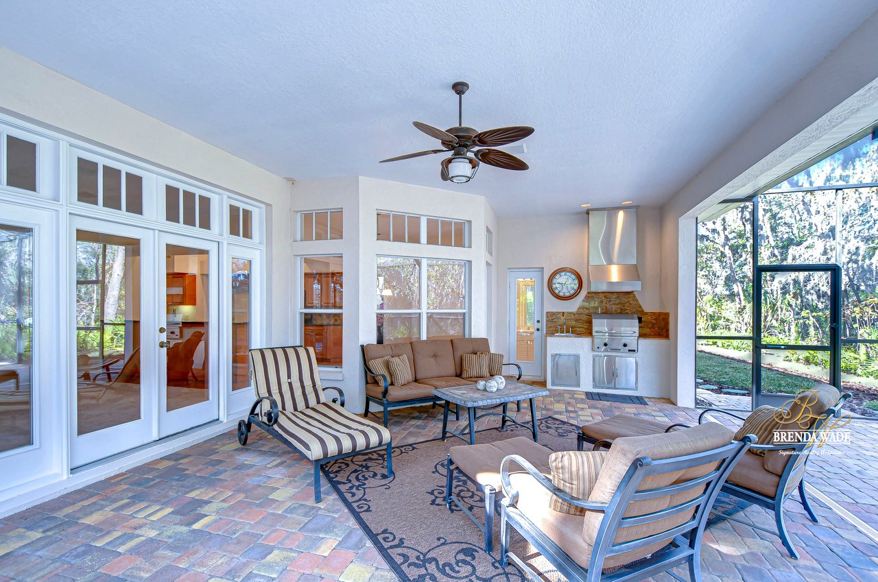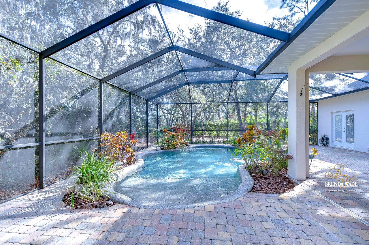 One or more photo(s) has been virtually staged. Welcome to Your Dream Home in Fish Hawk Trails! Nestled on an oversized pie-shaped lot in the highly desirable Fish Hawk Trails community, this exquisite home offers a perfect blend of elegance, privacy, and modern convenience. With a low-maintenance, private wooded lot, this property provides a true retreat. Step inside to a grand foyer that opens to the formal dining room and a versatile flex space adorned with custom barn doors and built-ins, perfect for a home office, playroom, music room, or formal living area. Beautiful crown molding graces every room, adding timeless sophistication throughout the home. The spacious great room is an entertainer's dream, featuring built-ins, a wood-burning fireplace, and surround sound, all while offering breathtaking views of the backyard oasis and pond-style heated saltwater pool. The adjacent kitchen, showcases gorgeous granite countertops, rich wood cabinetry, bar seating, a butler's pantry, and an expansive sunlit breakfast nook. Retreat to the luxurious primary suite, where private lanai access, a custom double-entry walk-in closet with built-in organization, and a foundation-embedded safe create the ultimate sanctuary. The en-suite bath offers a double vanity, soaking tub, and stunning walk-in shower. Two additional generously sized bedrooms on the opposite side of the home share a full bath, which conveniently doubles as a pool bath. A fourth bedroom near the primary suite makes for a perfect guest retreat with easy access to a third full bath. The expansive extended lanai is built for both relaxation and entertainment, featuring a built-in grill, which is ideal for hosting BBQs. The heated saltwater pool is surrounded by lush tropical landscaping within the lanai. Major upgrades include a brand-new pool cage (2023) and a pool heater (2024), ensuring years of enjoyment. Beyond the lanai, a sprawling fenced yard offers plenty of space to unwind, making this home a nature lover's paradise. Designed with convenience in mind, this home also features custom shelving and storage racks in the garage for ultimate organization. Don't miss this rare opportunity to own a private, low-maintenance retreat in Fish Hawk Trails.