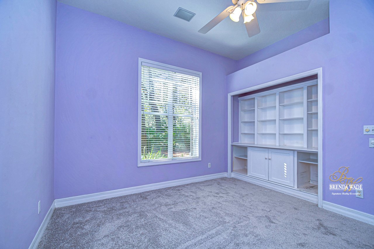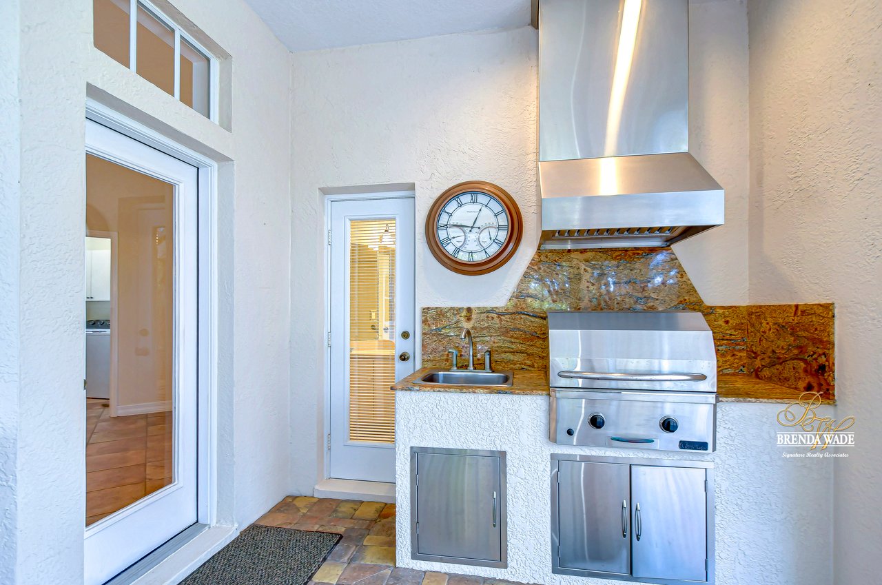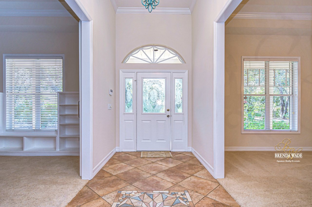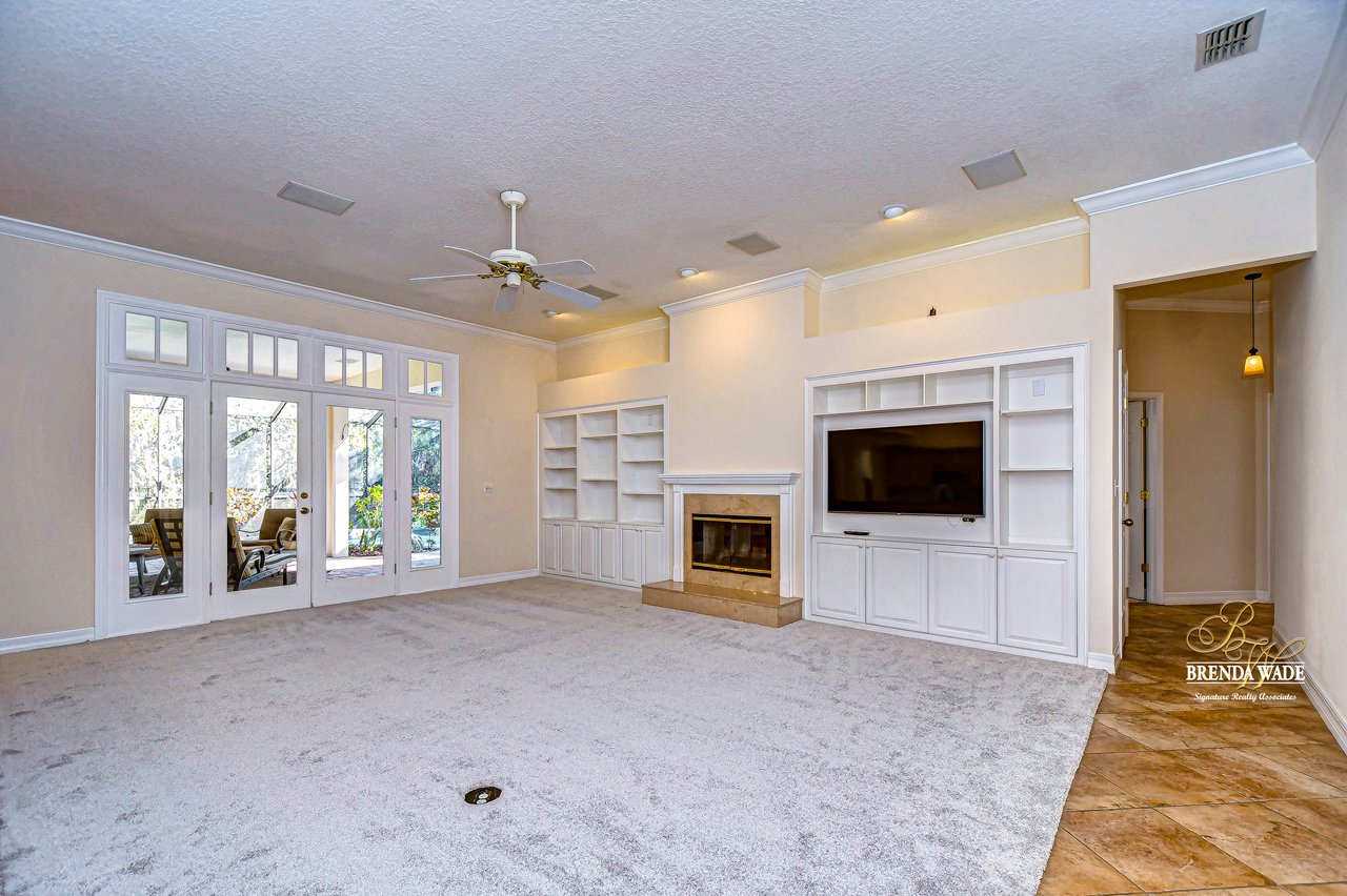 One or more photo(s) has been virtually staged. Welcome to Your Dream Home in Fish Hawk Trails! Nestled on an oversized pie-shaped lot in the highly desirable Fish Hawk Trails community, this exquisite home offers a perfect blend of elegance, privacy, and modern convenience. With a low-maintenance, private wooded lot, this property provides a true retreat. Step inside to a grand foyer that opens to the formal dining room and a versatile flex space adorned with custom barn doors and built-ins, perfect for a home office, playroom, music room, or formal living area. Beautiful crown molding graces every room, adding timeless sophistication throughout the home. The spacious great room is an entertainer's dream, featuring built-ins, a wood-burning fireplace, and surround sound, all while offering breathtaking views of the backyard oasis and pond-style heated saltwater pool. The adjacent kitchen, showcases gorgeous granite countertops, rich wood cabinetry, bar seating, a butler's pantry, and an expansive sunlit breakfast nook. Retreat to the luxurious primary suite, where private lanai access, a custom double-entry walk-in closet with built-in organization, and a foundation-embedded safe create the ultimate sanctuary. The en-suite bath offers a double vanity, soaking tub, and stunning walk-in shower. Two additional generously sized bedrooms on the opposite side of the home share a full bath, which conveniently doubles as a pool bath. A fourth bedroom near the primary suite makes for a perfect guest retreat with easy access to a third full bath. The expansive extended lanai is built for both relaxation and entertainment, featuring a built-in grill, which is ideal for hosting BBQs. The heated saltwater pool is surrounded by lush tropical landscaping within the lanai. Major upgrades include a brand-new pool cage (2023) and a pool heater (2024), ensuring years of enjoyment. Beyond the lanai, a sprawling fenced yard offers plenty of space to unwind, making this home a nature lover's paradise. Designed with convenience in mind, this home also features custom shelving and storage racks in the garage for ultimate organization. Don't miss this rare opportunity to own a private, low-maintenance retreat in Fish Hawk Trails.