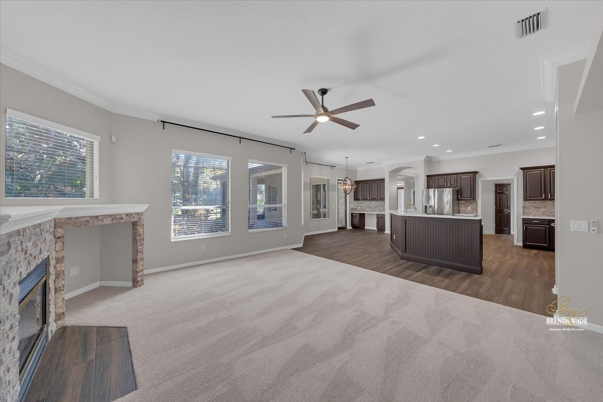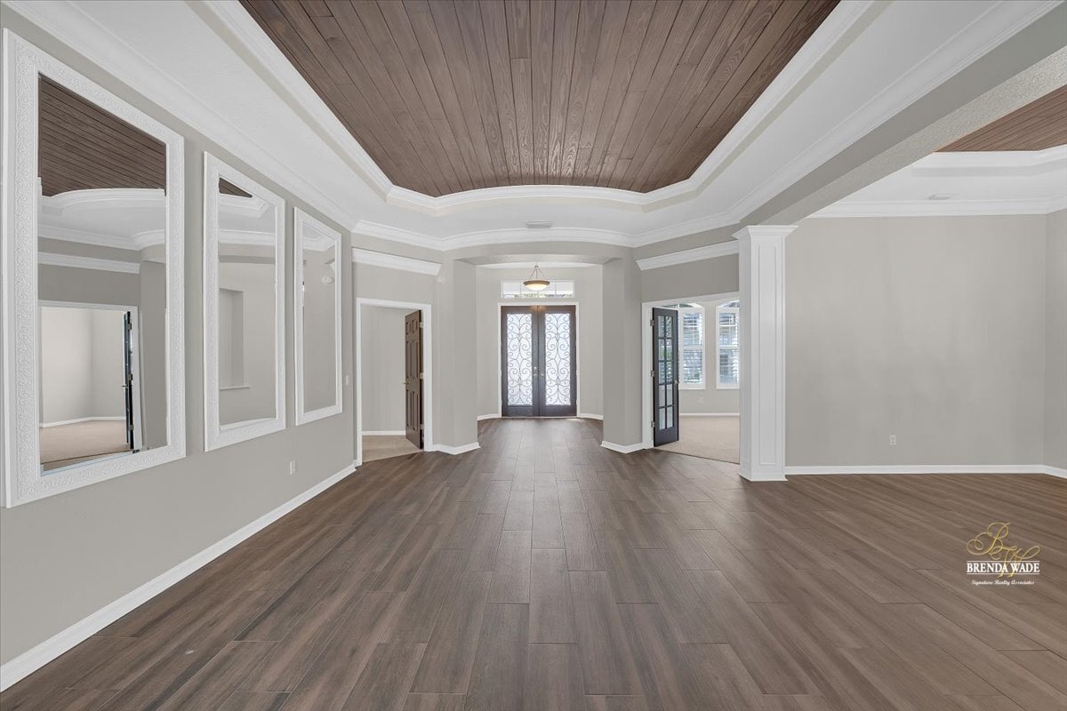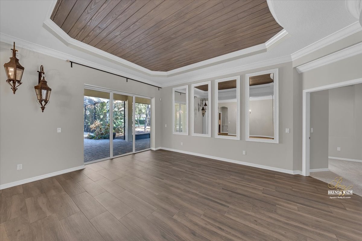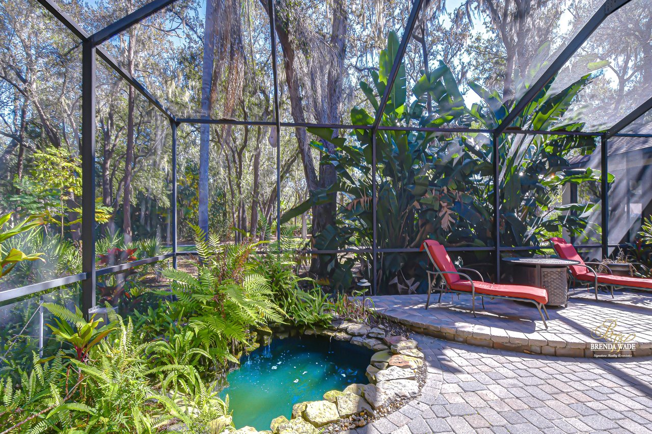 One or more photo(s) has been virtually staged. Welcome to this stunning Sabal-built home located in the highly desirable gated community of Fish Hawk Trails, where timeless design, thoughtful updates, and exceptional living spaces come together. Recently improved with a completely repainted interior, newly replaced bedroom flooring, professional exterior lawn maintenance, and a roof replaced in 2021, this home offers both beauty and peace of mind. From the moment you step through the entry, elegant wood-look tile flooring sets the tone, perfectly complemented by wood inlay tray ceilings showcased in the formal living and dining rooms. Sliding glass doors in the formal living area frame peaceful views of the oversized screened lanai, creating a seamless connection between indoor and outdoor living. Designed for both everyday comfort and entertaining, the kitchen and family room flow effortlessly together. The beautifully remodeled kitchen serves as the true heart of the home, featuring stainless appliances, abundant cabinetry, and expansive prep space, creating a natural gathering place for family and guests alike. The adjacent family room overlooks the lanai and is anchored by a gas fireplace with stacked stone accents, adding warmth and architectural character. A conveniently located half bath provides added comfort and accessibility for guests. Privately situated on one side of the home, the spacious primary suite offers a quiet retreat with dual walk-in closets, and an additional flex room ideal for a home office, nursery, fitness space, or private sitting area. The luxurious primary bath features dual vanities, a large soaking tub, and an oversized double shower. The secondary bedrooms are thoughtfully arranged, with two bedrooms connected by a Jack-and-Jill bathroom, while a fourth bedroom enjoys its own en-suite bath--perfect for guests or multigenerational living. A large media/bonus room positioned at the back of the home provides endless possibilities for entertainment or recreation, while a private home office with glass French doors at the front of the home creates an ideal work-from-home space. Step outside to your own peaceful retreat. The expansive screened lanai overlooks a tranquil eco-stable pond and features a charming gazebo connected by a pavered pathway--an inviting setting for relaxing mornings or evening gatherings. Situated on a generous corner lot, the property offers ample space to add a pool if desired. Residents of the 24-hour gated FishHawk Trails community enjoy miles of scenic walking and biking trails, a 285-acre nature preserve, baseball and soccer fields, tennis and pickleball courts, and two playgrounds. Zoned for A-rated schools and offering the added benefit of NO CDD fees, this community combines privacy, recreation, and convenience in one exceptional location. Don't miss the opportunity to make this beautiful property your own -- schedule your private showing today and experience everything this remarkable home and community have to offer.