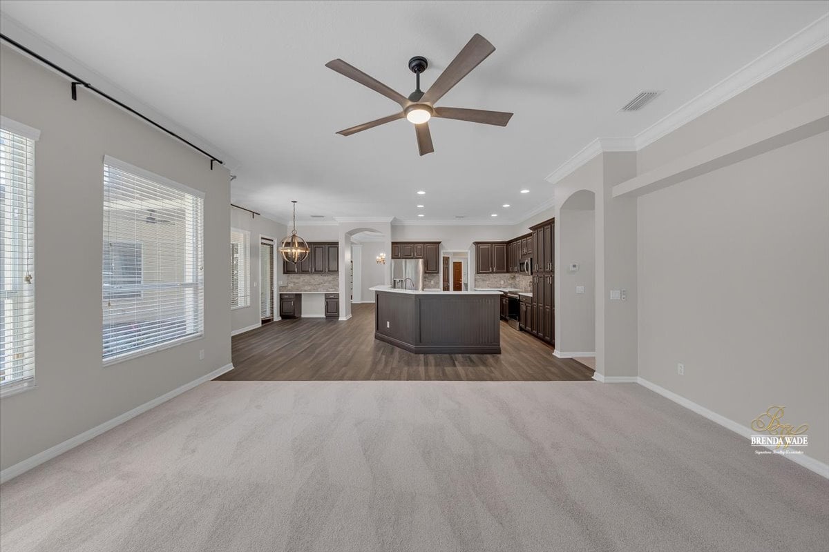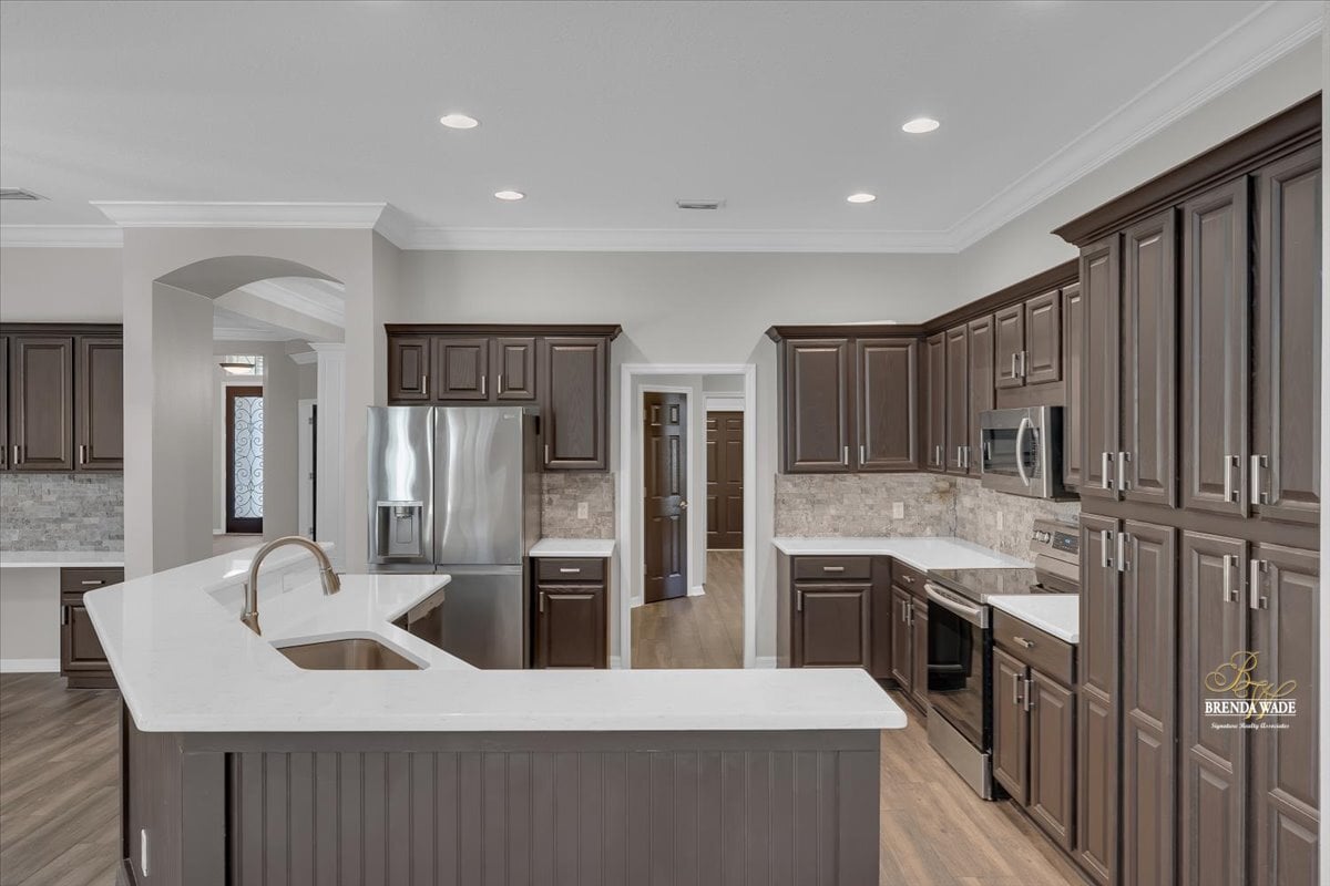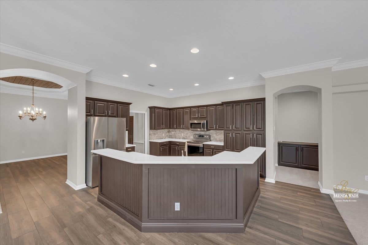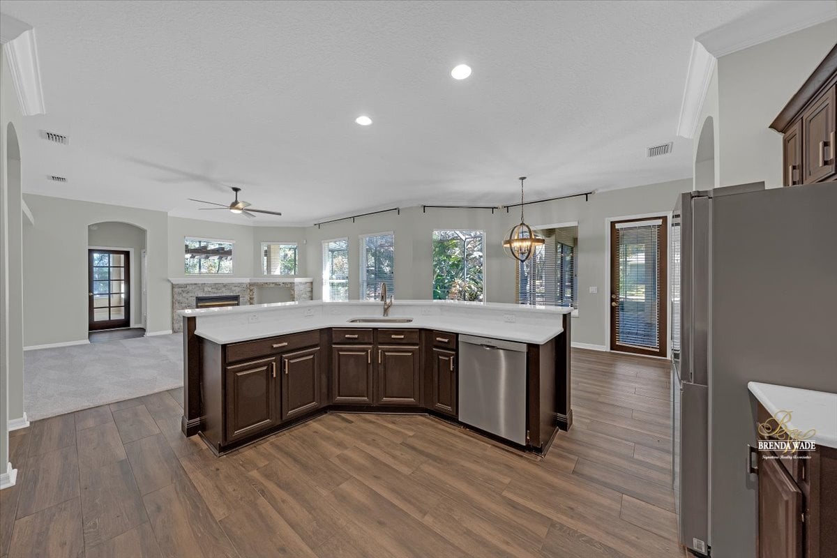One or more photo(s) has been virtually staged. Welcome to this stunning Sabal-built home located in the highly desirable gated community of Fish Hawk Trails, where timeless design, thoughtful updates, and exceptional living spaces come together. Recently improved with a completely repainted interior, newly replaced bedroom flooring, professional exterior lawn maintenance, and a roof replaced in 2021, this home offers both beauty and peace of mind. From the moment you step through the entry, elegant wood-look tile flooring sets the tone, perfectly complemented by wood inlay tray ceilings showcased in the formal living and dining rooms. Sliding glass doors in the formal living area frame peaceful views of the oversized screened lanai, creating a seamless connection between indoor and outdoor living. Designed for both everyday comfort and entertaining, the kitchen and family room flow effortlessly together. The beautifully remodeled kitchen serves as the true heart of the home, featuring stainless appliances, abundant cabinetry, and expansive prep space, creating a natural gathering place for family and guests alike. The adjacent family room overlooks the lanai and is anchored by a gas fireplace with stacked stone accents, adding warmth and architectural character. A conveniently located half bath provides added comfort and accessibility for guests. Privately situated on one side of the home, the spacious primary suite offers a quiet retreat with dual walk-in closets, and an additional flex room ideal for a home office, nursery, fitness space, or private sitting area. The luxurious primary bath features dual vanities, a large soaking tub, and an oversized double shower. The secondary bedrooms are thoughtfully arranged, with two bedrooms connected by a Jack-and-Jill bathroom, while a fourth bedroom enjoys its own en-suite bath--perfect for guests or multigenerational living. A large media/bonus room positioned at the back of the home provides endless possibilities for entertainment or recreation, while a private home office with glass French doors at the front of the home creates an ideal work-from-home space. Step outside to your own peaceful retreat. The expansive screened lanai overlooks a tranquil eco-stable pond and features a charming gazebo connected by a pavered pathway--an inviting setting for relaxing mornings or evening gatherings. Situated on a generous corner lot, the property offers ample space to add a pool if desired. Residents of the 24-hour gated FishHawk Trails community enjoy miles of scenic walking and biking trails, a 285-acre nature preserve, baseball and soccer fields, tennis and pickleball courts, and two playgrounds. Zoned for A-rated schools and offering the added benefit of NO CDD fees, this community combines privacy, recreation, and convenience in one exceptional location. Don't miss the opportunity to make this beautiful property your own -- schedule your private showing today and experience everything this remarkable home and community have to offer.
