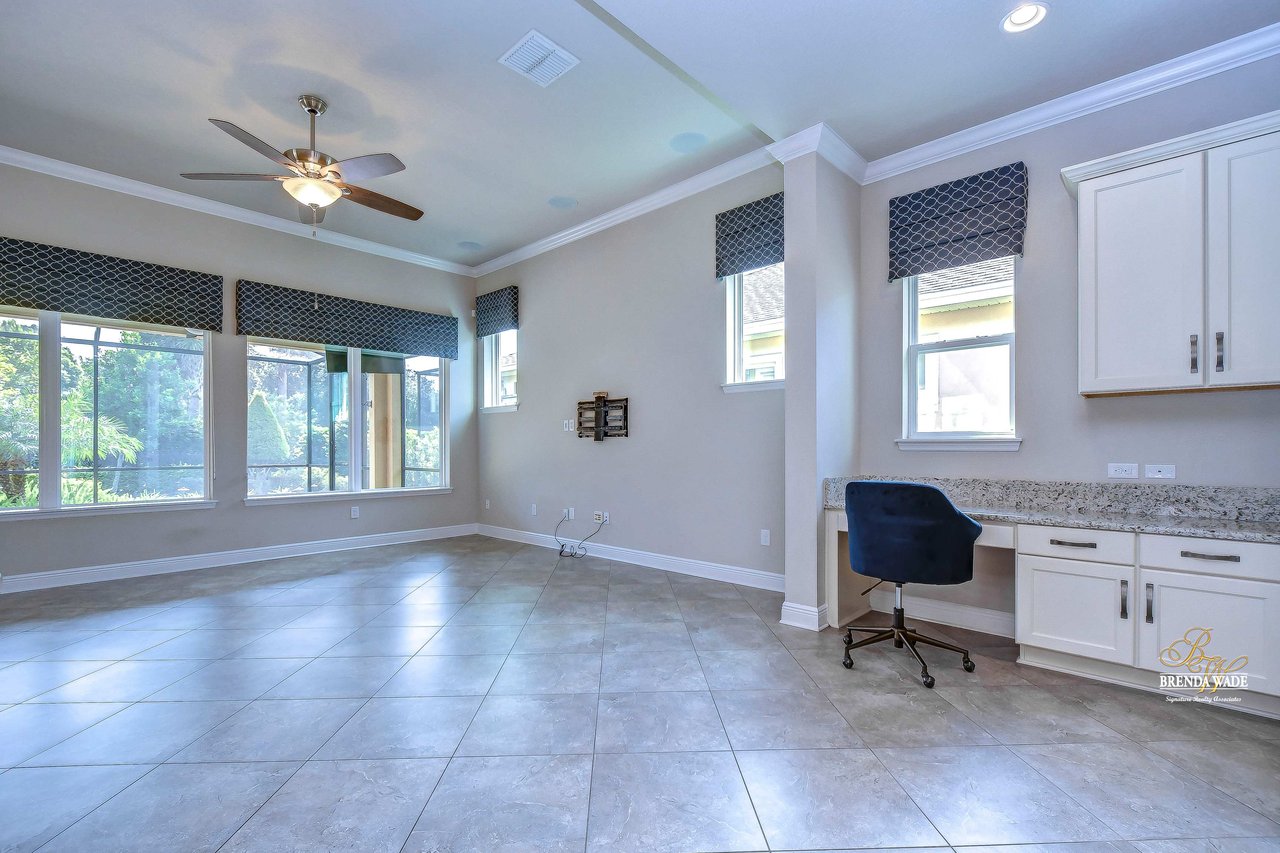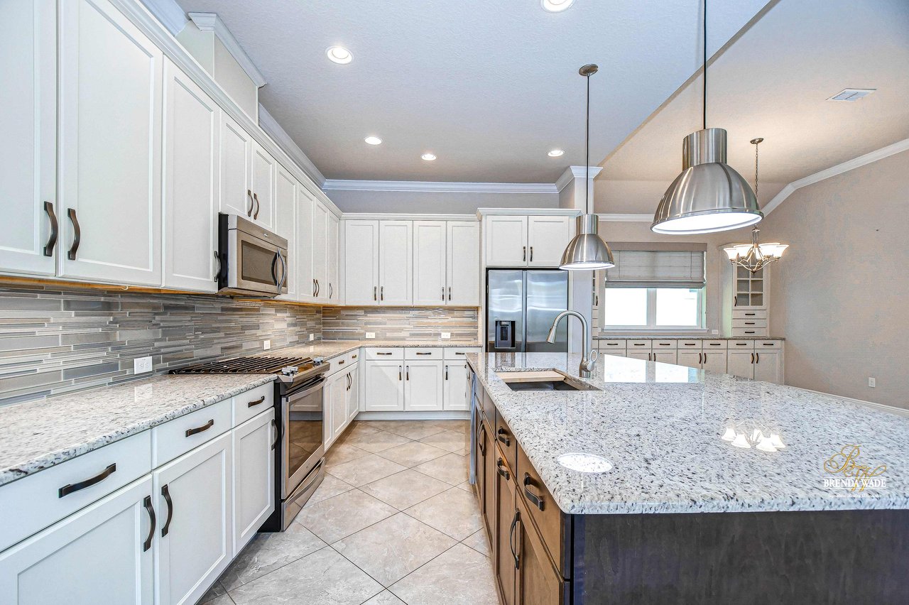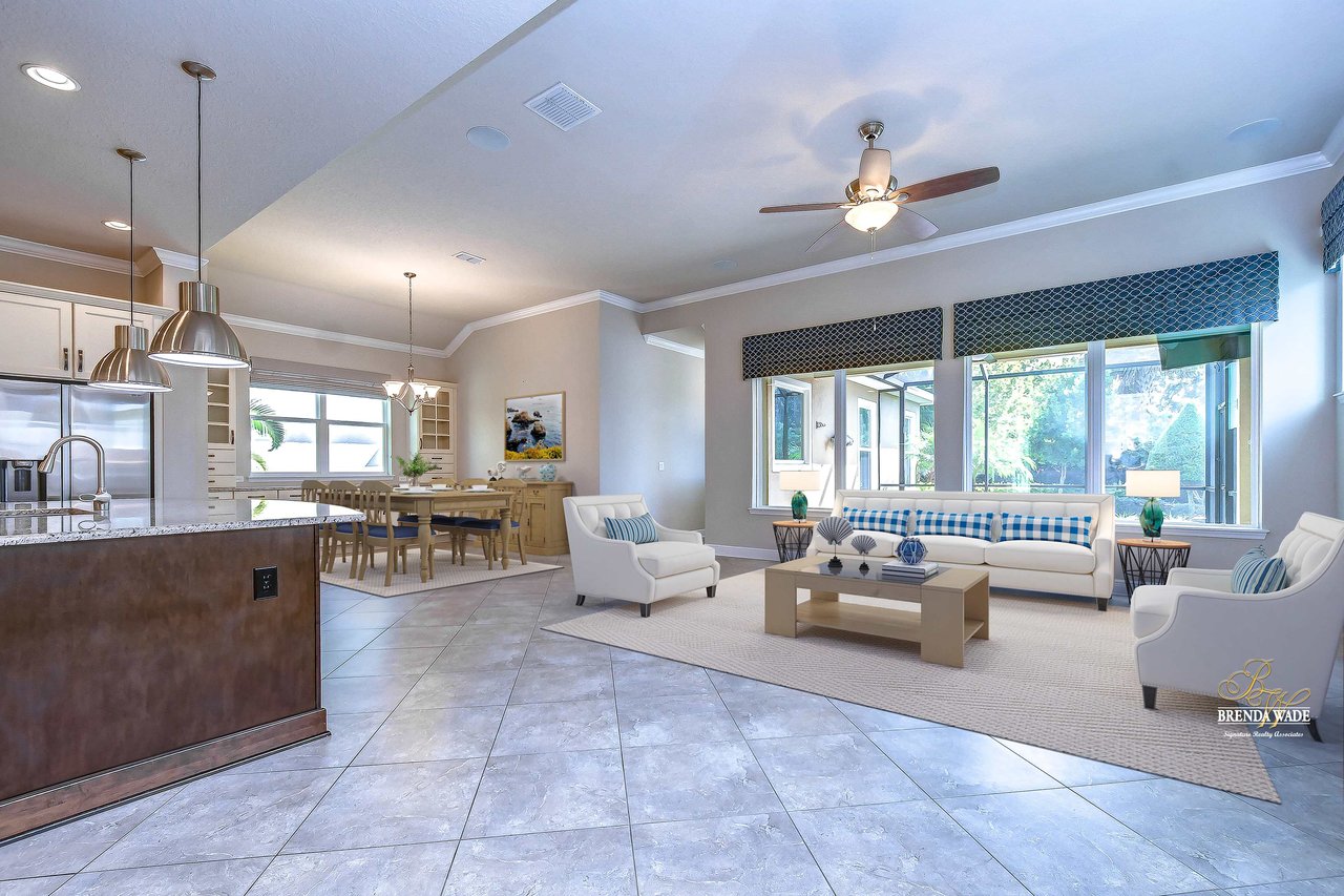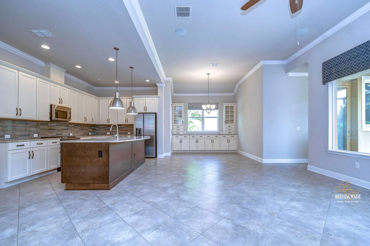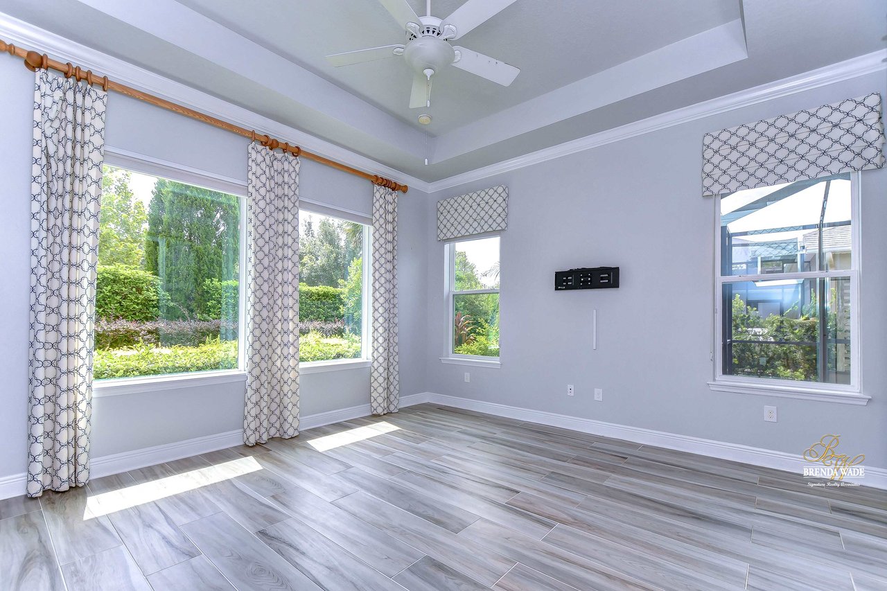 One or more photo(s) has been virtually staged. Welcome to the resort-style community of Encore, a 55+ gated community, redefining what active, hands-free living aspires to be! With an on-site activities director, your social calendar will be overflowing with options. The Oasis Club offers residents a full fitness center, meeting, club, and party room, PICKLEBALL court, multiple pools, bocce ball, fire pits, and miles of trails! This stunning home combines luxury, comfort, and contemporary living. From its impeccable curb appeal to its' thoughtfully designed open floor plan offering a sunlit interior and flexibility. The kitchen is the heart of the home overlooking the family and dining room with custom build-in cabinetry, it offers the perfect space for gatherings with family and friends. This STUNNING kitchen boasts 42-inch white cabinets with crown, glass tile backsplash, top-of-the-line new appliances, granite countertops, and a HUGE center island with bar seating. The split floor plan gives the primary suite and secondary bedroom absolute privacy. The primary suite is a true oasis with beautiful porcelain tile floors, barn doors, tray ceiling, peaceful views of the backyard, and a STUNNING en-suite bath featuring a HUGE walk-in shower and a walk-in closet with custom organizational shelves and drawers. The second bedroom features a front sitting area and an en-suite bath, ensuring comfort for guests. Take a step outside to your spacious oversized screened lanai surrounded by beautiful professional landscaping and lighting, making this the perfect place to enjoy your morning coffee, watch the sunsets, or enjoy time with friends! Did we mention NO backyard neighbors? This incredible home is conveniently located near shopping centers, parks, and dining options, offering not just luxury, but also convenience. This active 55+ community itself offers a serene and secure environment, making it the perfect place to call home.