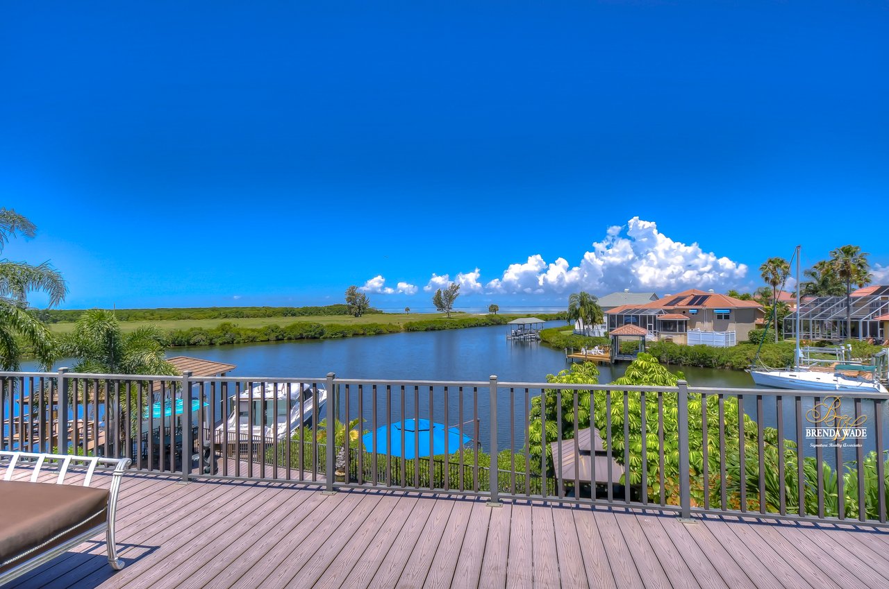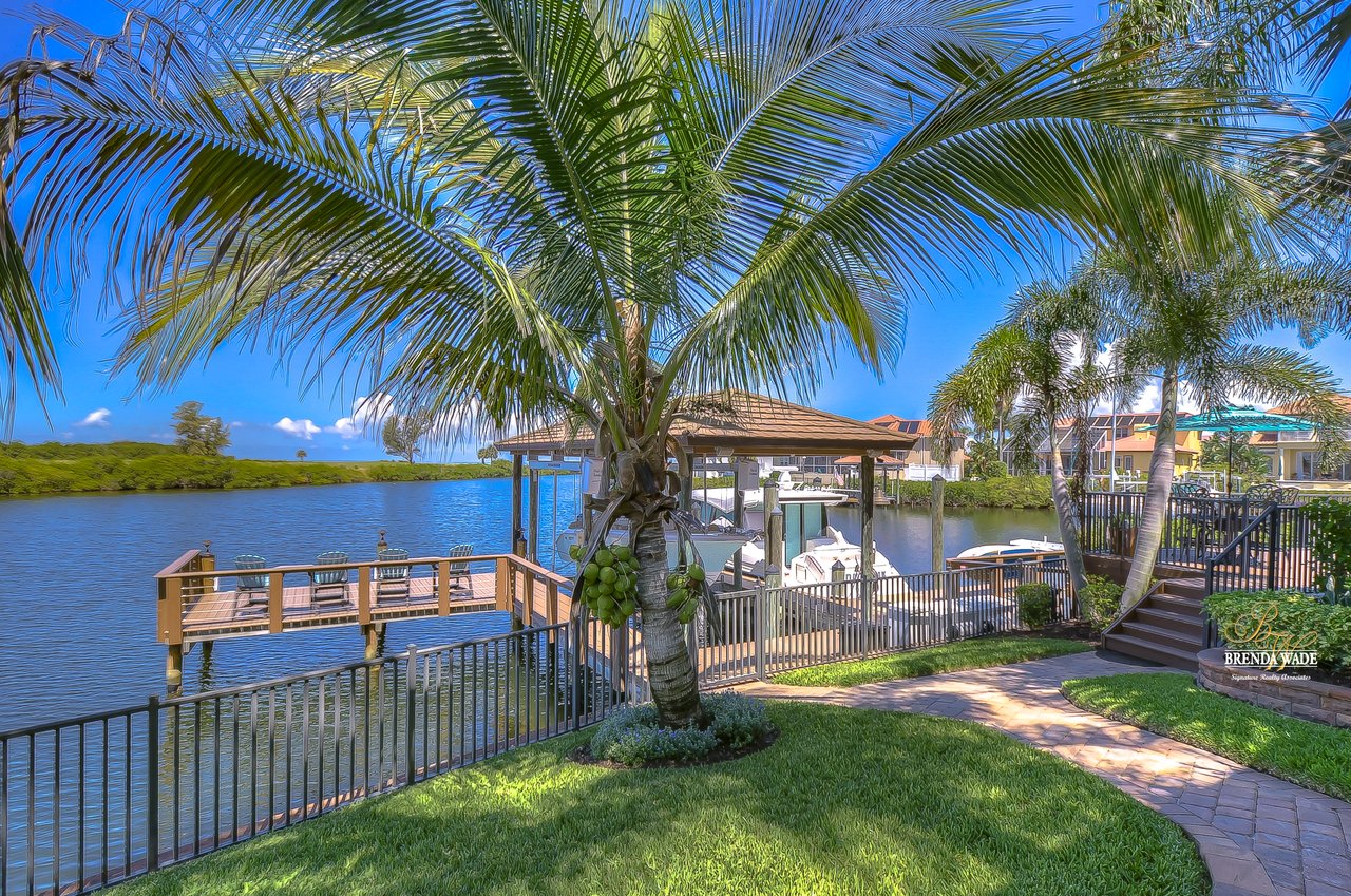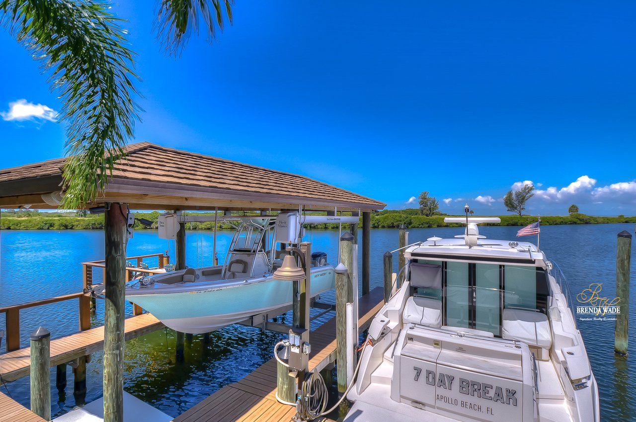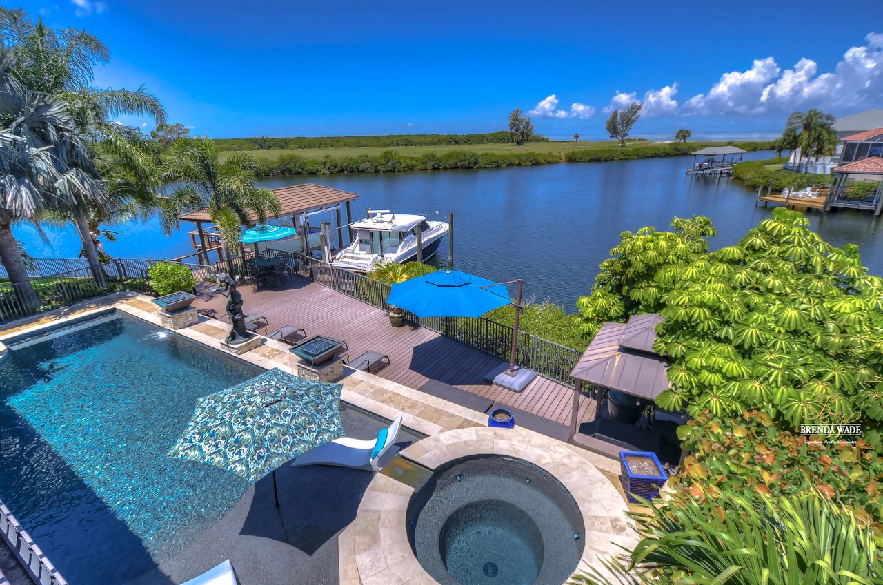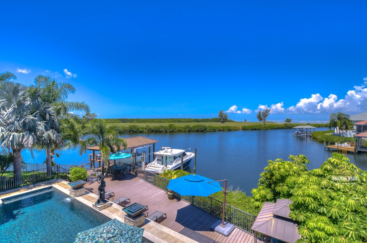PARADISE AWAITS! Enjoy this CUSTOM WATERFRONT home that offers the most breathtaking views of Tampa Bay! There is SO much to fall in love with starting with the tranquil sunsets against the St. Petersburg skyline! Store your boat on your lot with ease with the private COVERED boat dock with a 10,000 lb lift and Trex decking with the ability to keep a second boat right at home! This wide saltwater canal has you just 3 minutes from Tampa Bay! Located in the highly desirable, gated Symphony Isles community which offers 24/7 Security, private beach, community pool, clubhouse, boat ramp, playground, and beach volleyball! Sitting at the end of a quiet cul-de-sac you will ADORE the curb appeal! Circular pavered driveway, tropical landscaping, and grand elevation with double doors and oversized windows! This luxurious home has been IMPECCABLY UPDATED with new flooring, custom cabinetry, remodeled kitchen, hurricane windows & sliders, and stunning addition to the home including a dreamy primary wing! The formal dining room has a deep tray ceiling, wine fridge, built-In wine storage, and humidor all with custom cabinets and iron doors! As you tour this beauty you will notice the statement ceilings and appreciate how easy it is to entertain both inside and out! The formal living room is flooded with natural lighting with floor-to-ceiling windows, transom windows, and features a double-sided fireplace shared with the family room! The renovated GOURMET kitchen is sure to please boasting custom designer cabinets with under cabinet lighting, granite countertops, stainless appliances, instant hot water dispenser, and sunny breakfast nook with double sliders leading outside to the pool! The family room has custom built-ins surrounding the double-sided fireplace to pair perfectly with your décor! Head upstairs and discover the added primary wing offering the finest finishes!! The oversized bedroom has a tray ceiling, lounge area, and sliding doors leading to the balcony… but check out the bathroom! Offering the most spa-like experience there are two sinks with custom cabinets, walk-through shower with multiple shower heads, separate tub, and towel warmer! We cannot stop swooning over the dual walk-in closets with custom organizers, cabinets, and drawers! There is a junior primary suite with its own fireplace, dual walk-in closets, and attached en-suite! Two more bedrooms and an office share the third bedroom upstairs! An added bonus room on the first floor is the perfect theater room with access to the pool, the sauna, and an additional bathroom! The pool was renovated in 2018 and WOW this backyard oasis is C A P T I V A T I N G! Travertine tile, outdoor fireplace with stacked stone accents, outdoor kitchen, salt water pool, and spa with sun shelf and fountain features, and your own boat dock! The owners have installed beautiful landscape lighting in the front of the house and a 50 amp plug to hook up an RV! You can stop dreaming and start living the carefree coastal lifestyle! Schedule your private showing while you can!