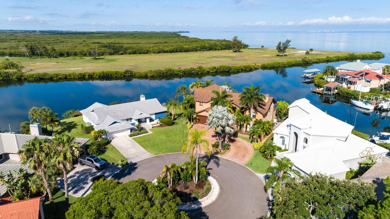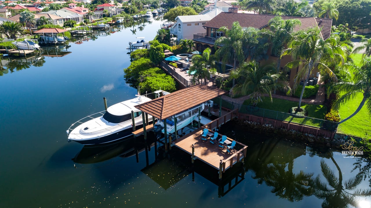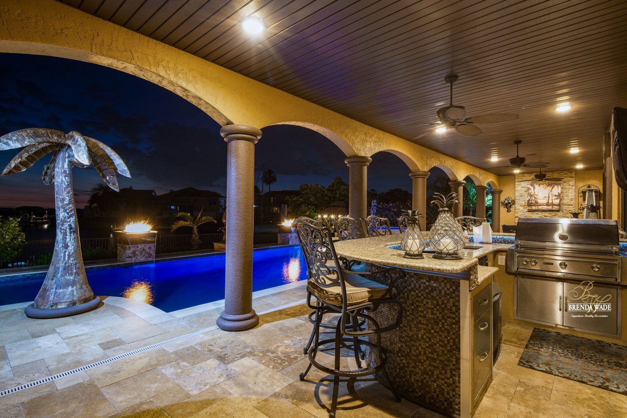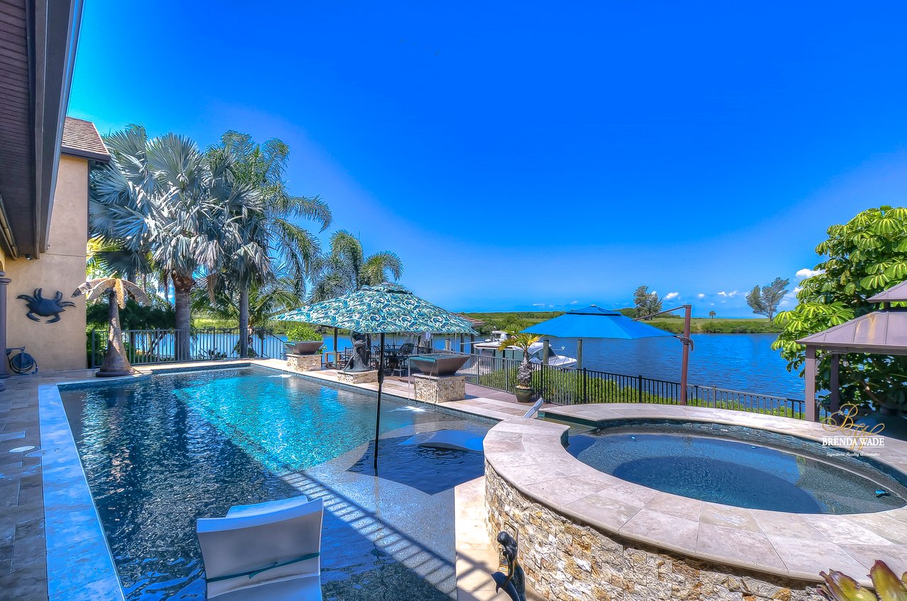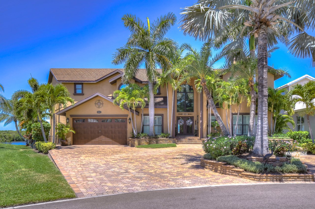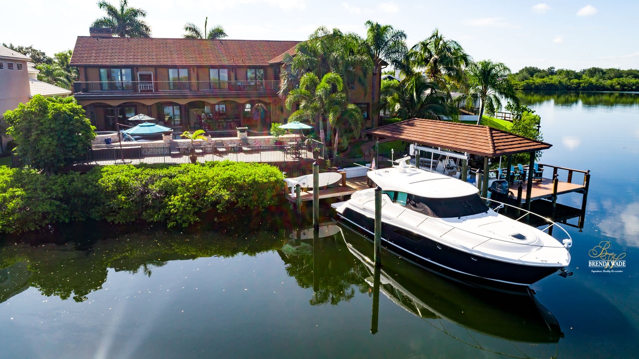 PARADISE AWAITS! Enjoy this CUSTOM WATERFRONT home that offers the most breathtaking views of Tampa Bay! There is SO much to fall in love with starting with the tranquil sunsets against the St. Petersburg skyline! Store your boat on your lot with ease with the private COVERED boat dock with a 10,000 lb lift and Trex decking with the ability to keep a second boat right at home! This wide saltwater canal has you just 3 minutes from Tampa Bay! Located in the highly desirable, gated Symphony Isles community which offers 24/7 Security, private beach, community pool, clubhouse, boat ramp, playground, and beach volleyball! Sitting at the end of a quiet cul-de-sac you will ADORE the curb appeal! Circular pavered driveway, tropical landscaping, and grand elevation with double doors and oversized windows! This luxurious home has been IMPECCABLY UPDATED with new flooring, custom cabinetry, remodeled kitchen, hurricane windows & sliders, and stunning addition to the home including a dreamy primary wing! The formal dining room has a deep tray ceiling, wine fridge, built-In wine storage, and humidor all with custom cabinets and iron doors! As you tour this beauty you will notice the statement ceilings and appreciate how easy it is to entertain both inside and out! The formal living room is flooded with natural lighting with floor-to-ceiling windows, transom windows, and features a double-sided fireplace shared with the family room! The renovated GOURMET kitchen is sure to please boasting custom designer cabinets with under cabinet lighting, granite countertops, stainless appliances, instant hot water dispenser, and sunny breakfast nook with double sliders leading outside to the pool! The family room has custom built-ins surrounding the double-sided fireplace to pair perfectly with your décor! Head upstairs and discover the added primary wing offering the finest finishes!! The oversized bedroom has a tray ceiling, lounge area, and sliding doors leading to the balcony… but check out the bathroom! Offering the most spa-like experience there are two sinks with custom cabinets, walk-through shower with multiple shower heads, separate tub, and towel warmer! We cannot stop swooning over the dual walk-in closets with custom organizers, cabinets, and drawers! There is a junior primary suite with its own fireplace, dual walk-in closets, and attached en-suite! Two more bedrooms and an office share the third bedroom upstairs! An added bonus room on the first floor is the perfect theater room with access to the pool, the sauna, and an additional bathroom! The pool was renovated in 2018 and WOW this backyard oasis is C A P T I V A T I N G! Travertine tile, outdoor fireplace with stacked stone accents, outdoor kitchen, salt water pool, and spa with sun shelf and fountain features, and your own boat dock! The owners have installed beautiful landscape lighting in the front of the house and a 50 amp plug to hook up an RV! You can stop dreaming and start living the carefree coastal lifestyle! Schedule your private showing while you can!